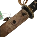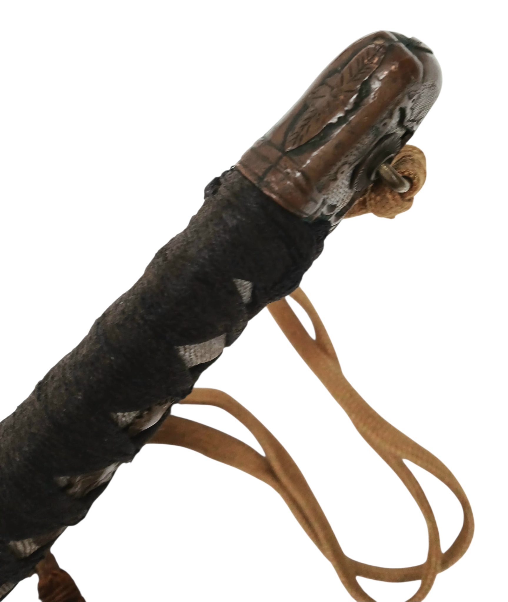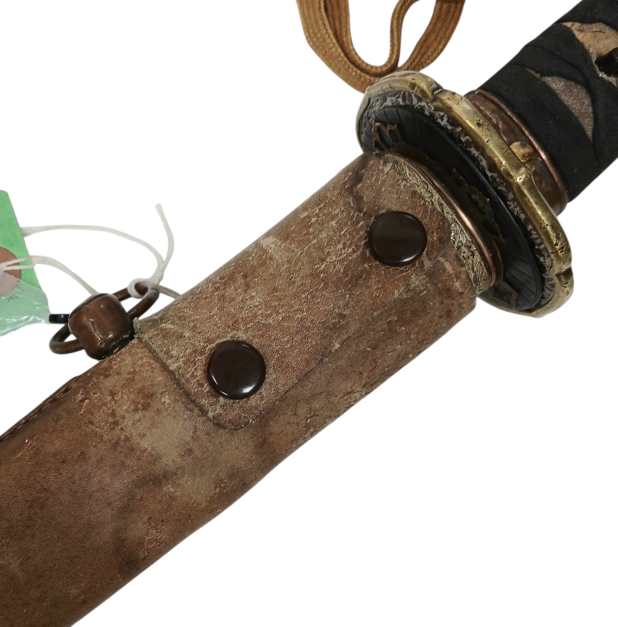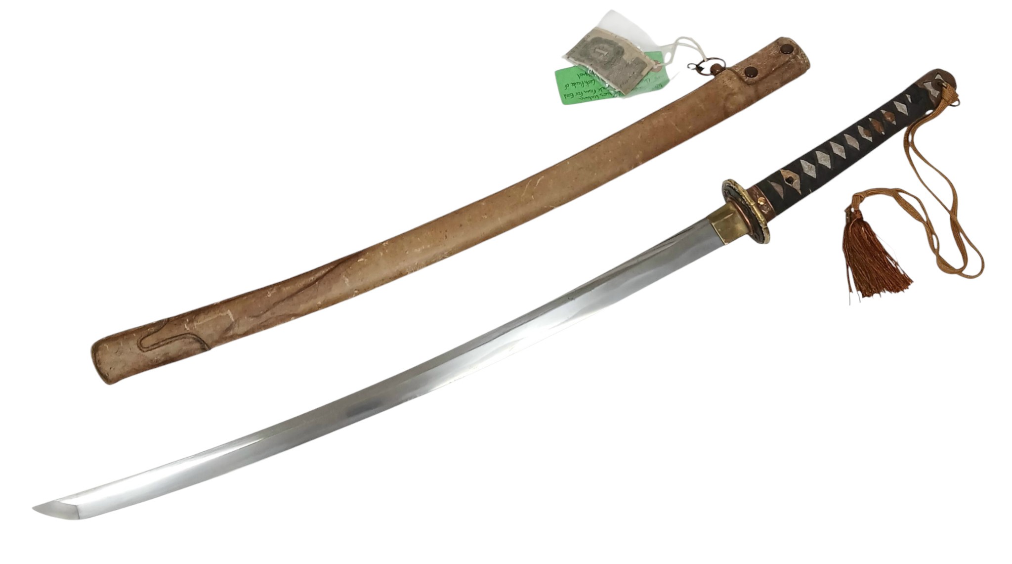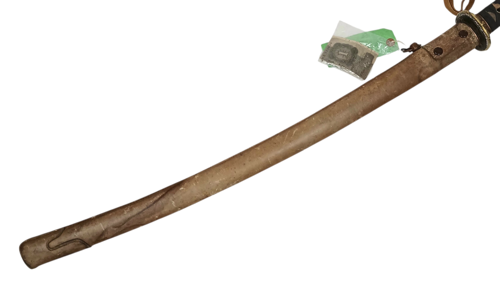 WW2 Japanese Officers Katana Sword. Complete with knot and leather scabbard cover. Brought back from the Middle East by an RAF Chaplain. A very nice blade with superb Hamon. Although the tang is unmarked it is without a doubt a very quality sword, Most likely a family hand down. Comes with the official certificate of retention. UK Mainland shipping only.