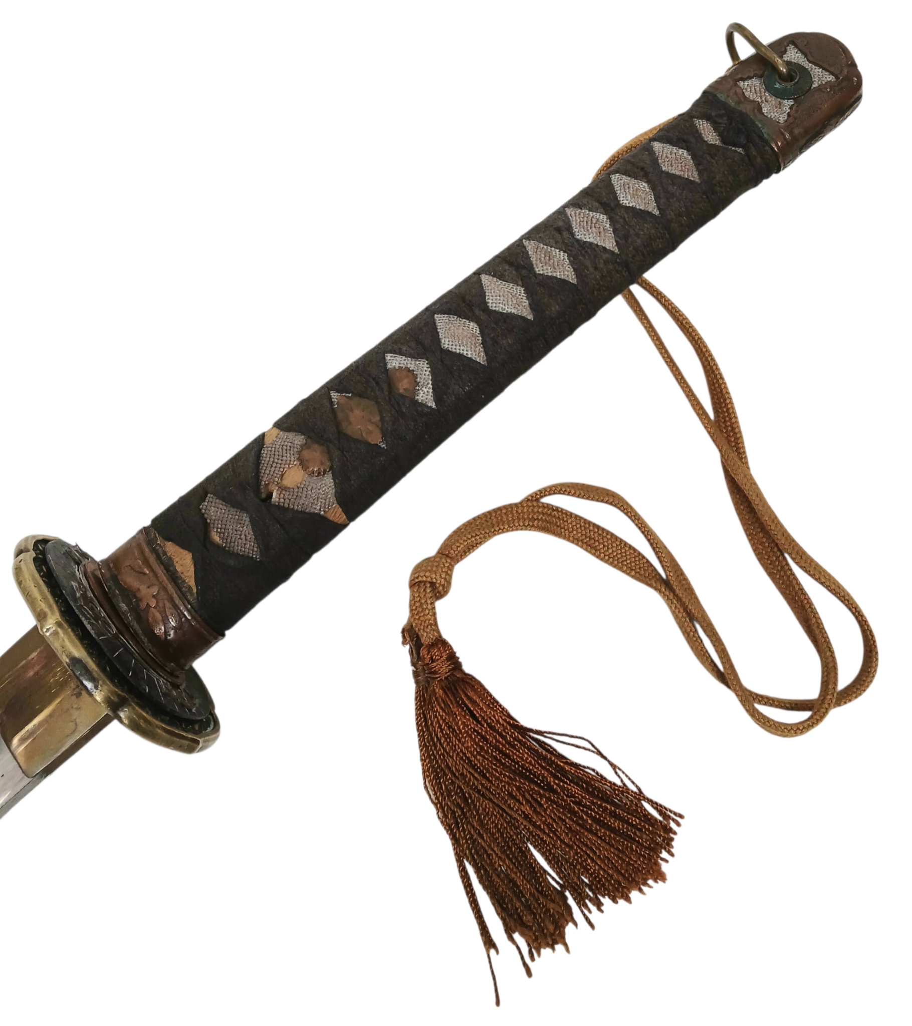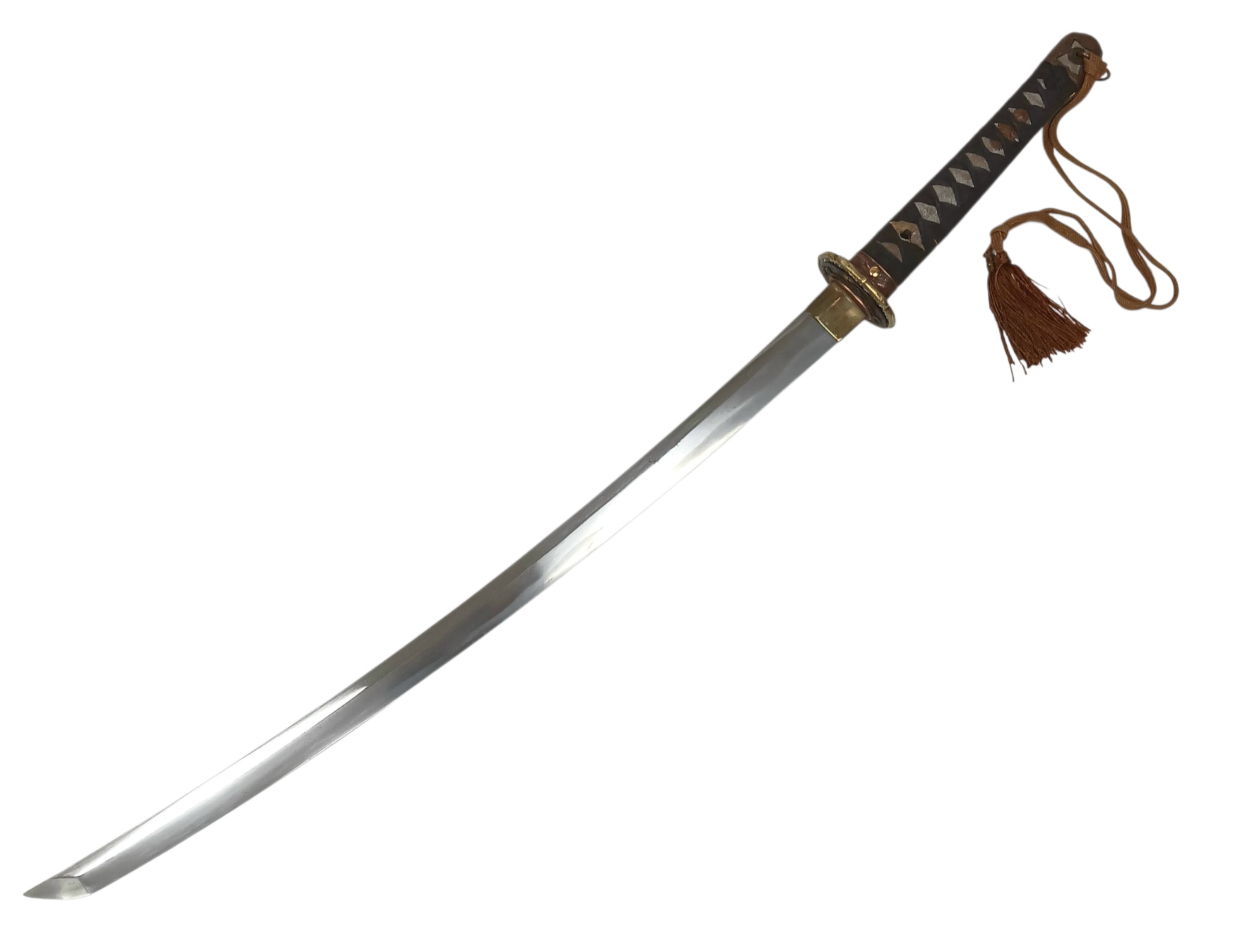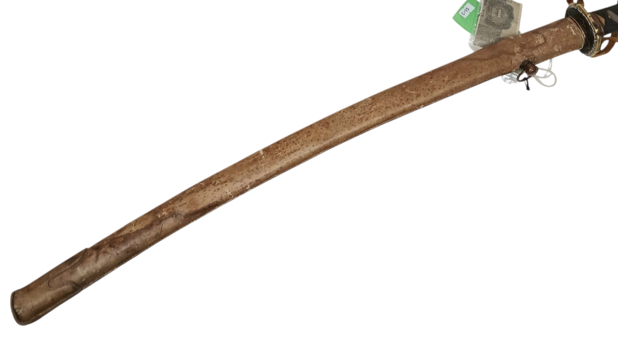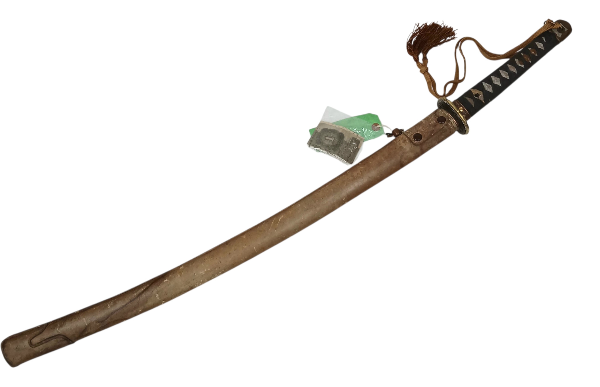 WW2 Japanese Officers Katana Sword. Complete with knot and leather scabbard cover. Brought back from the Middle East by an RAF Chaplain. A very nice blade with superb Hamon. Although the tang is unmarked it is without a doubt a very quality sword, Most likely a family hand down. Comes with the official certificate of retention. UK Mainland shipping only.