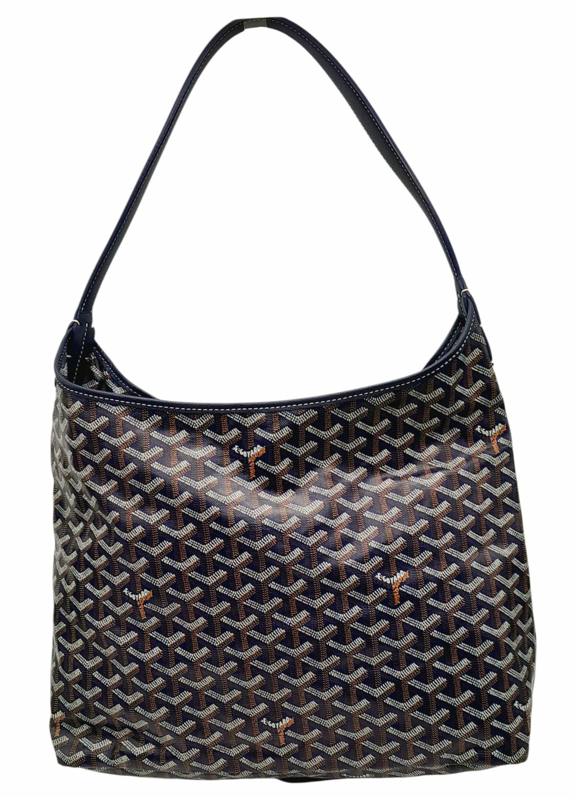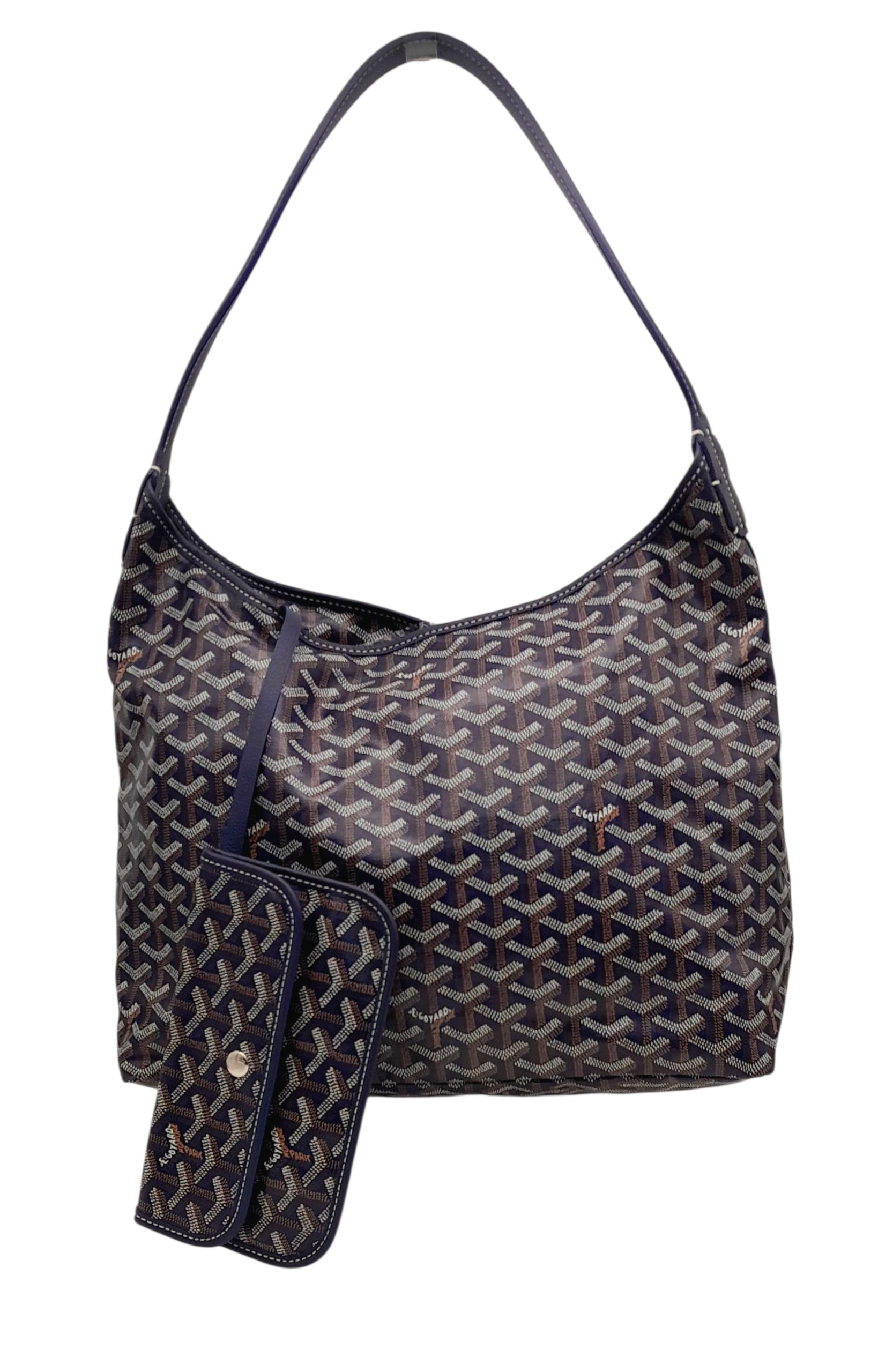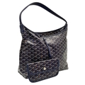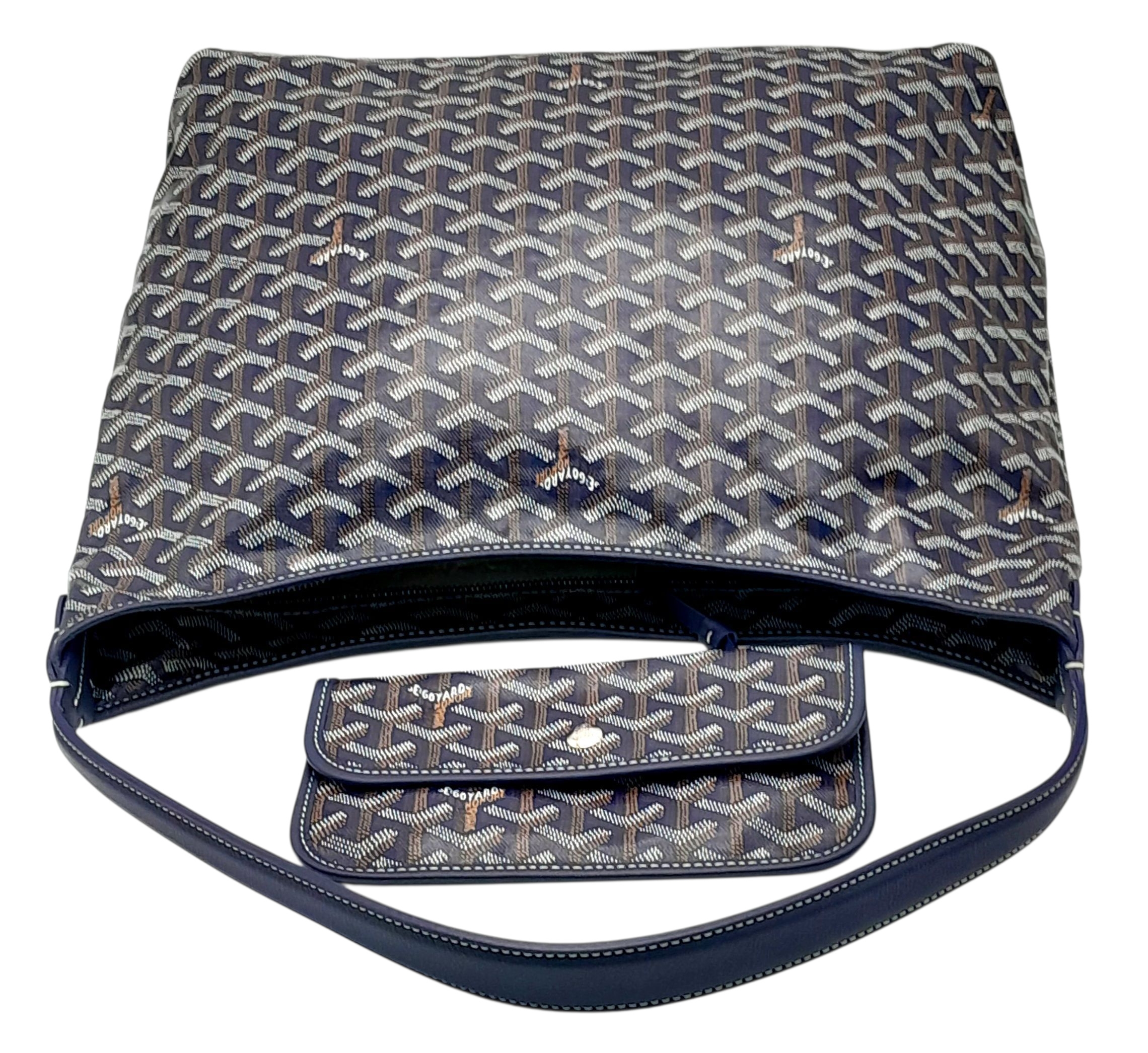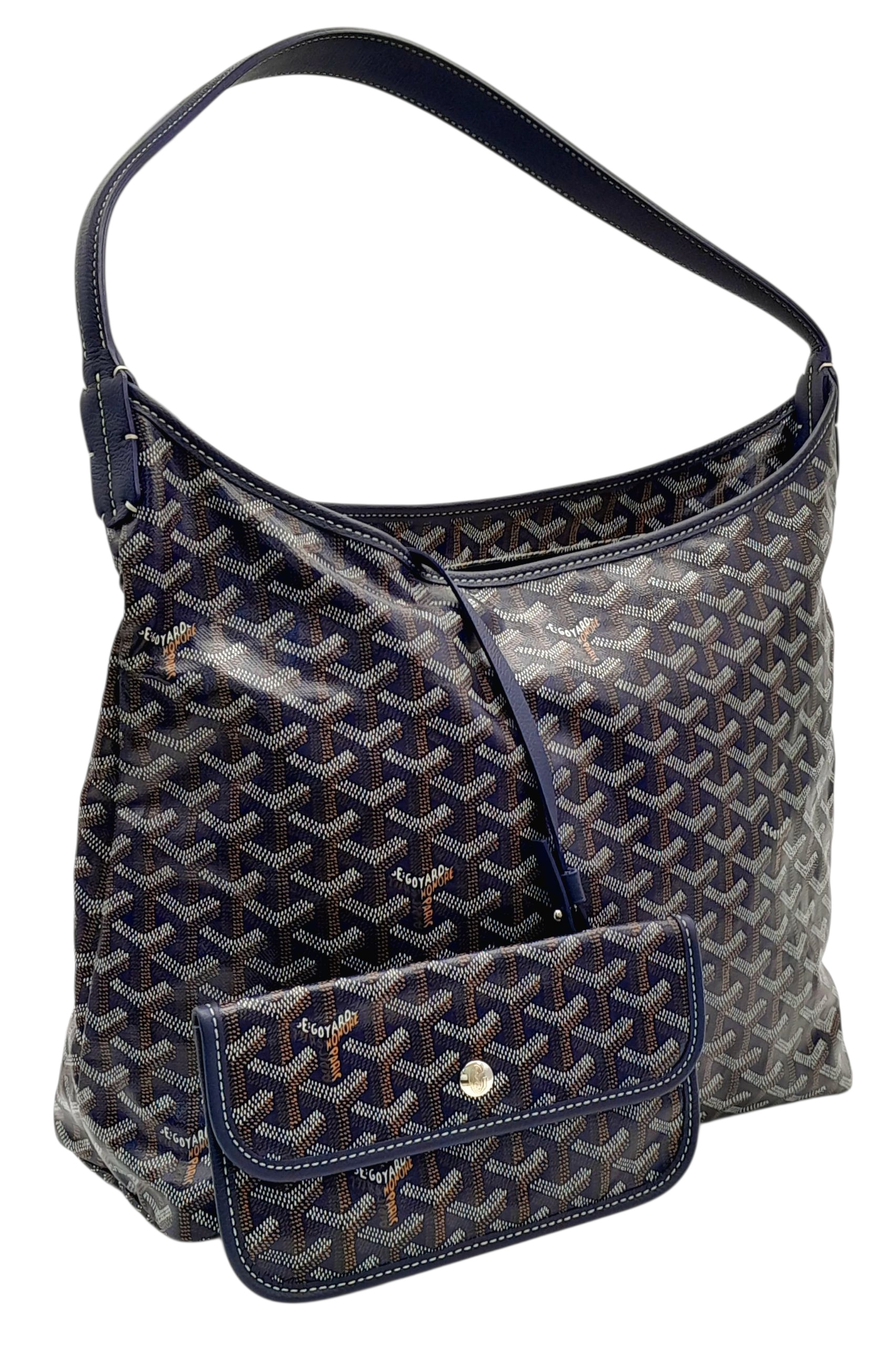 A Goyard Saint Louis Hobo Bag in Navy Goyardine Canvas. Navy blue and brown canvas exterior with silver-toned hardware, shoulder strap and zip-top closure. Beigh canvas interior with a single main compartment and an attached matching pouch. Some tiny stains to the interior but in good condition overall. Approx 39cm height x 27cm length x 11cm width. Comes with a care booklet and dust cover. Please see photos or request a condition report. Ref: JJ408.
