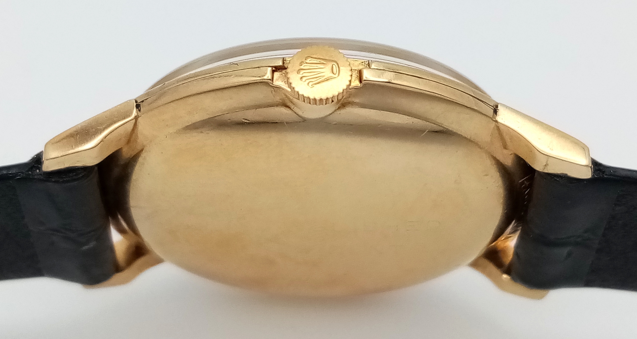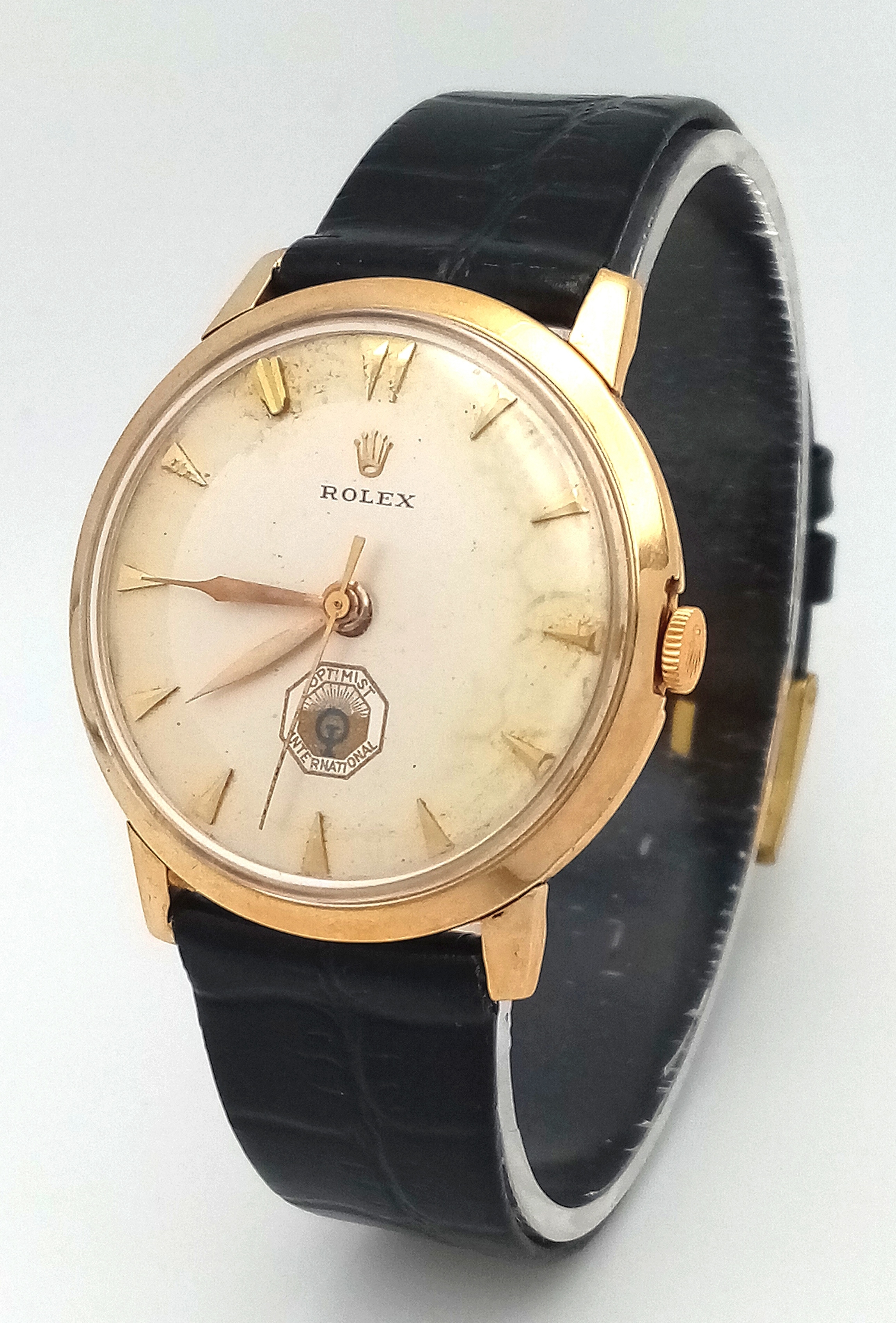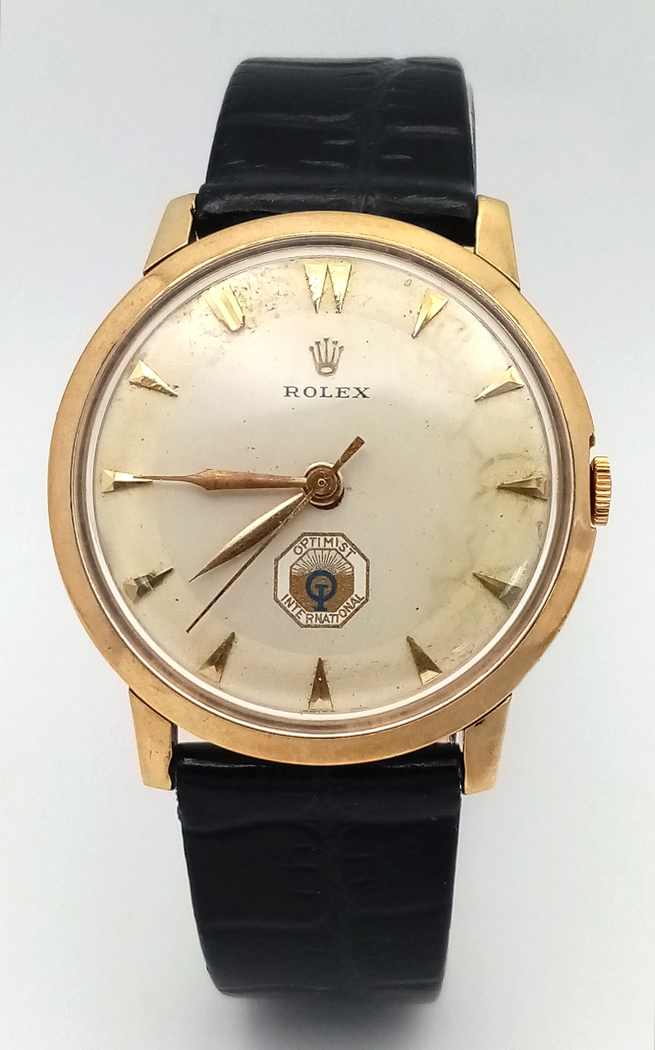 A Rare Vintage Rolex Optimist International Gold Cased Watch. Black leather strap. Gold case - 34mm. White dial with some patina. Mechanical hand wind movement. In working order. Optimist international logo above the six o'clock position and Rolex crown below 12.