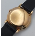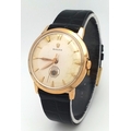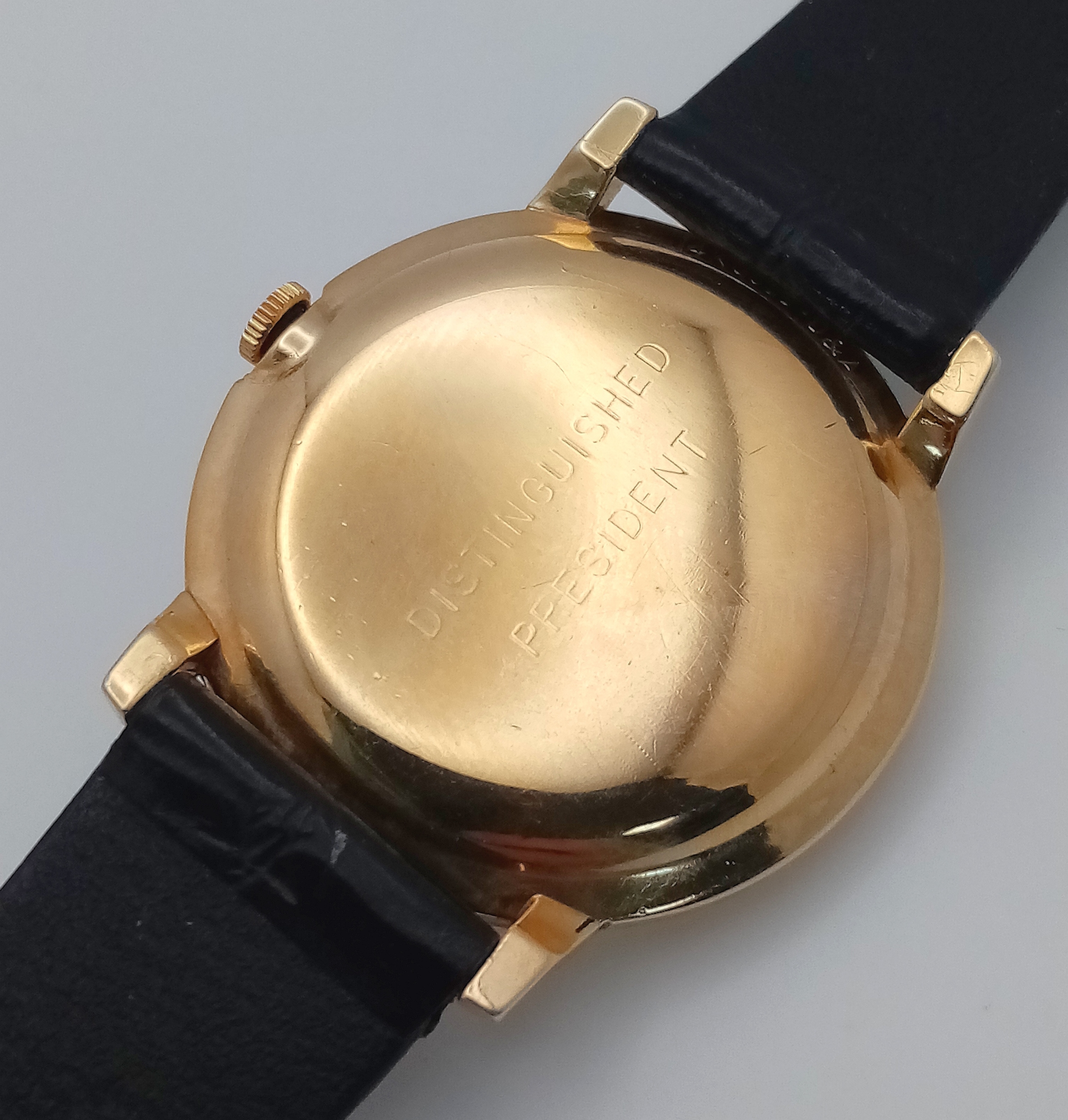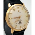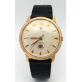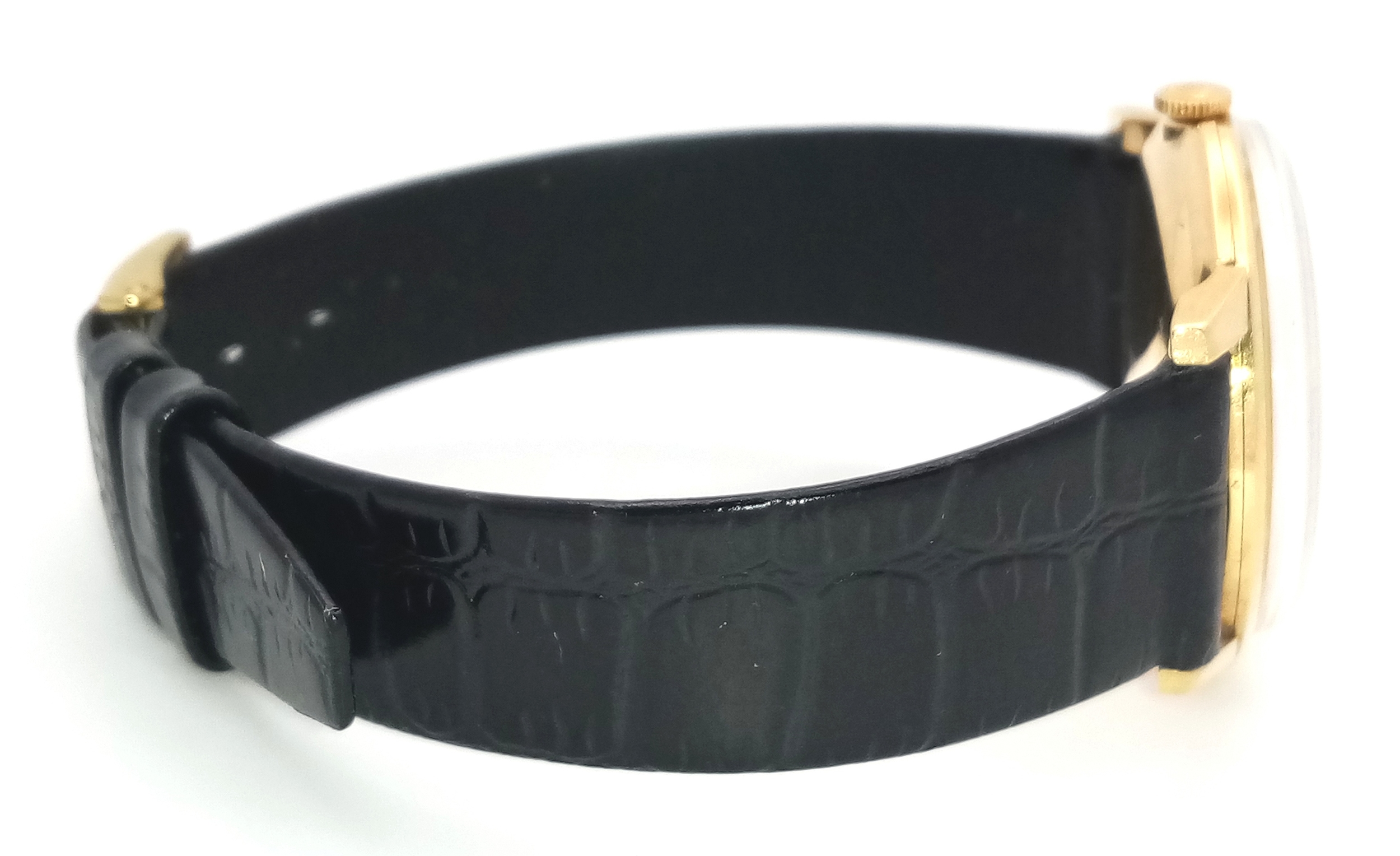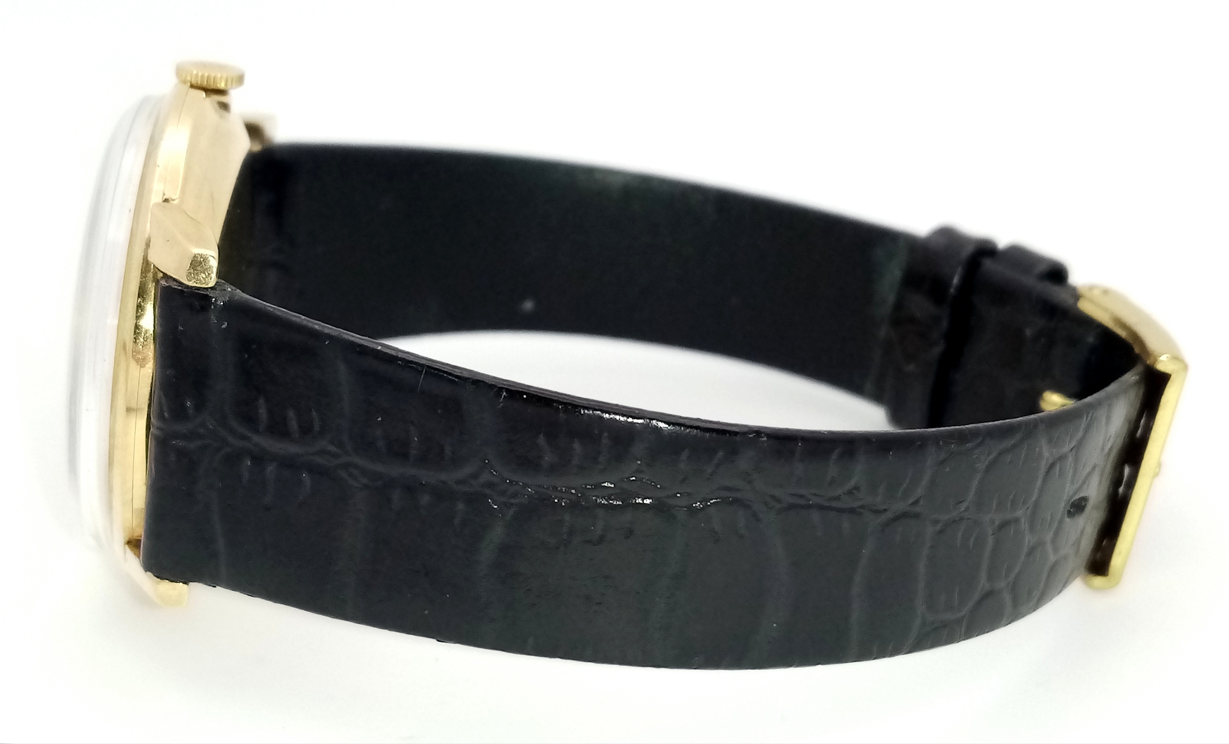 A Rare Vintage Rolex Optimist International Gold Cased Watch. Black leather strap. Gold case - 34mm. White dial with some patina. Mechanical hand wind movement. In working order. Optimist international logo above the six o'clock position and Rolex crown below 12.