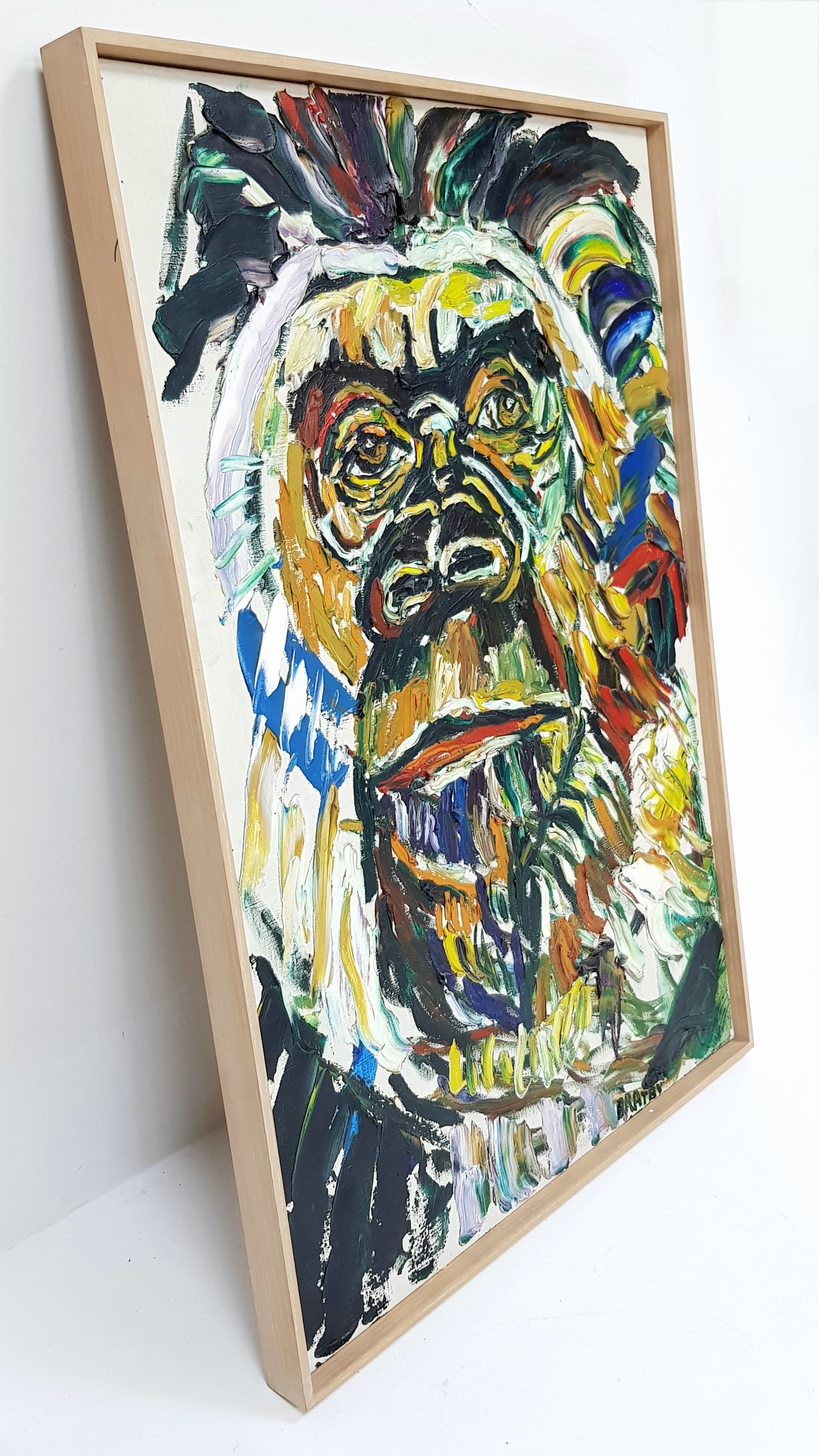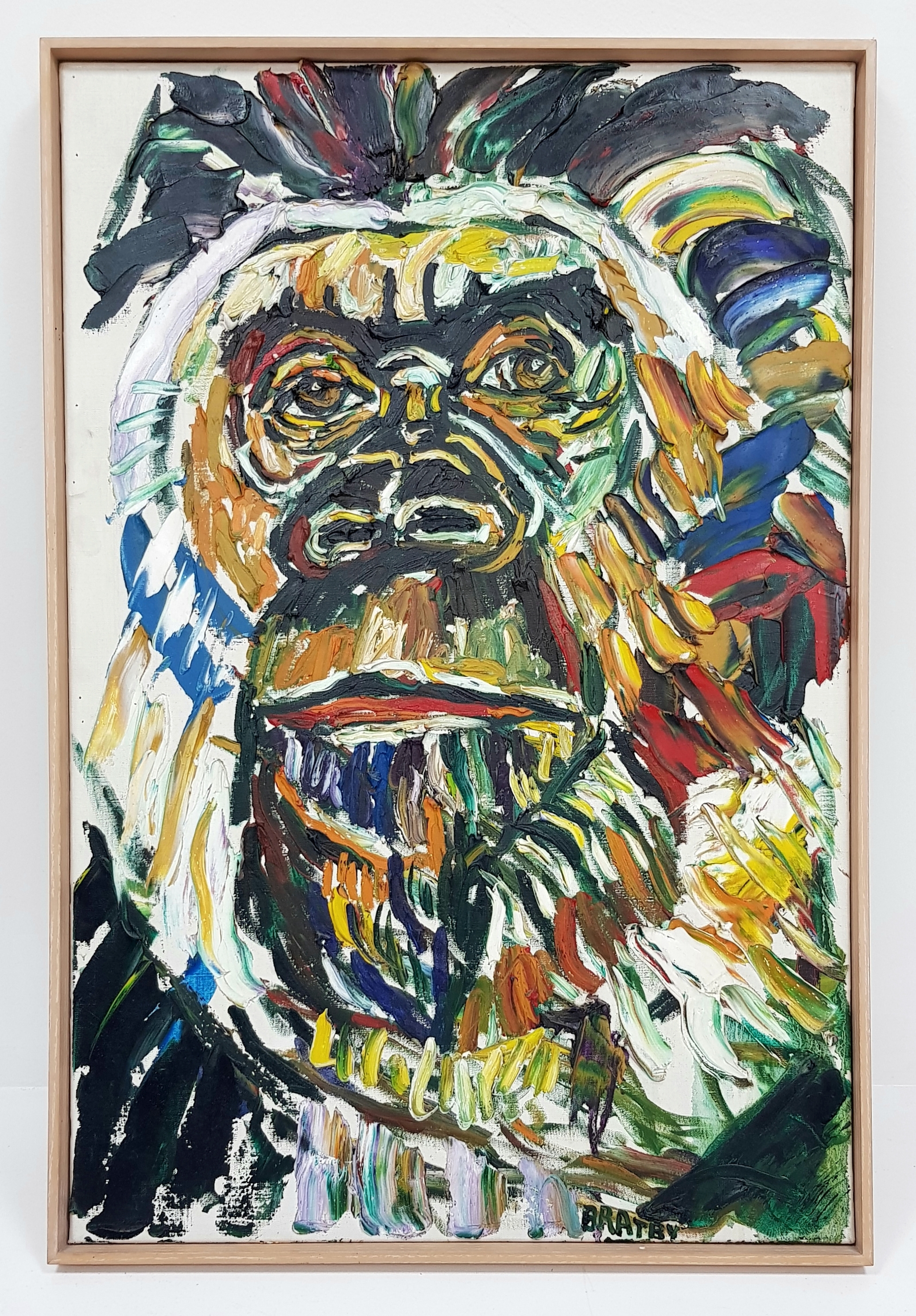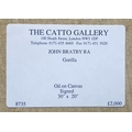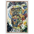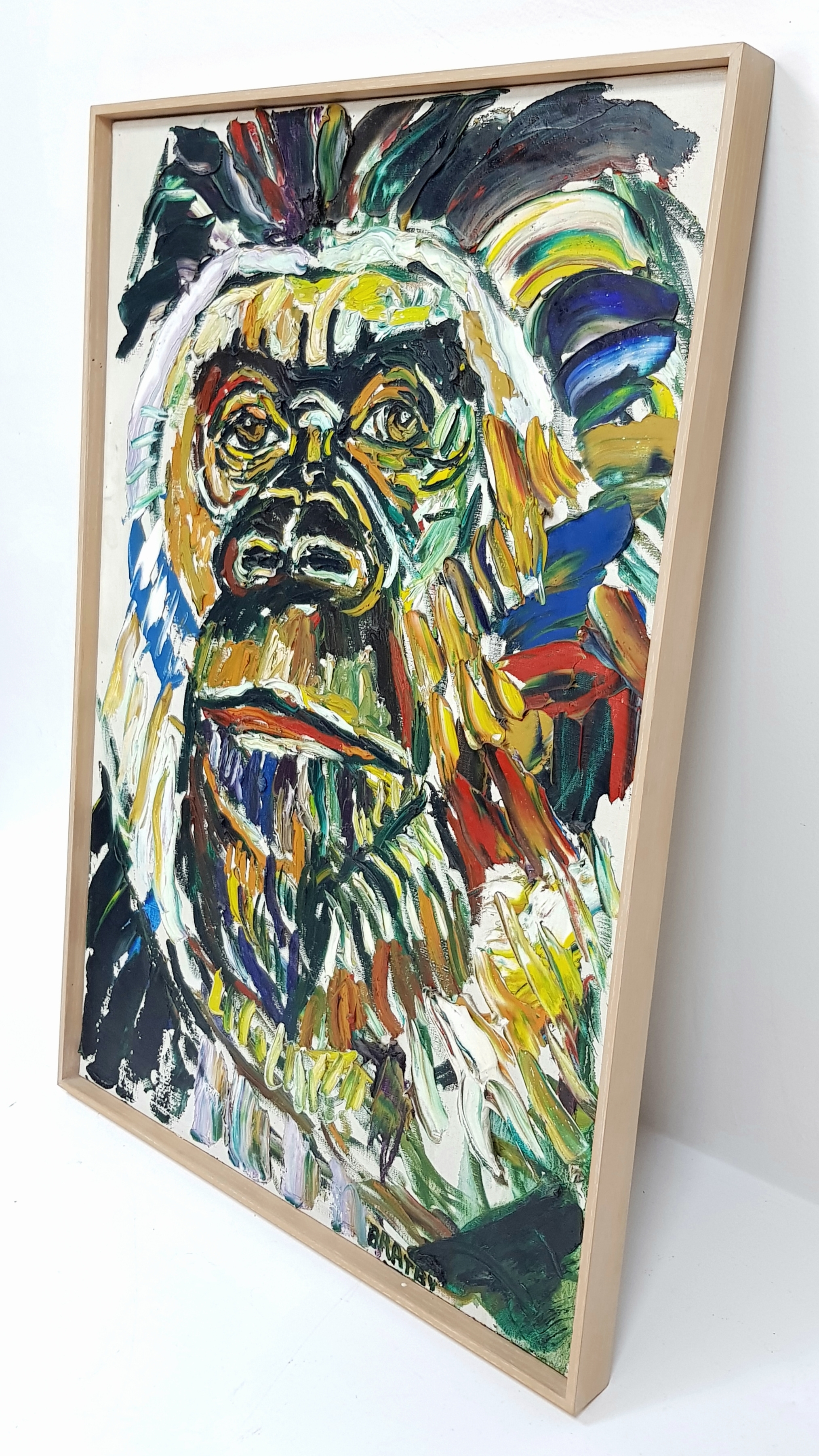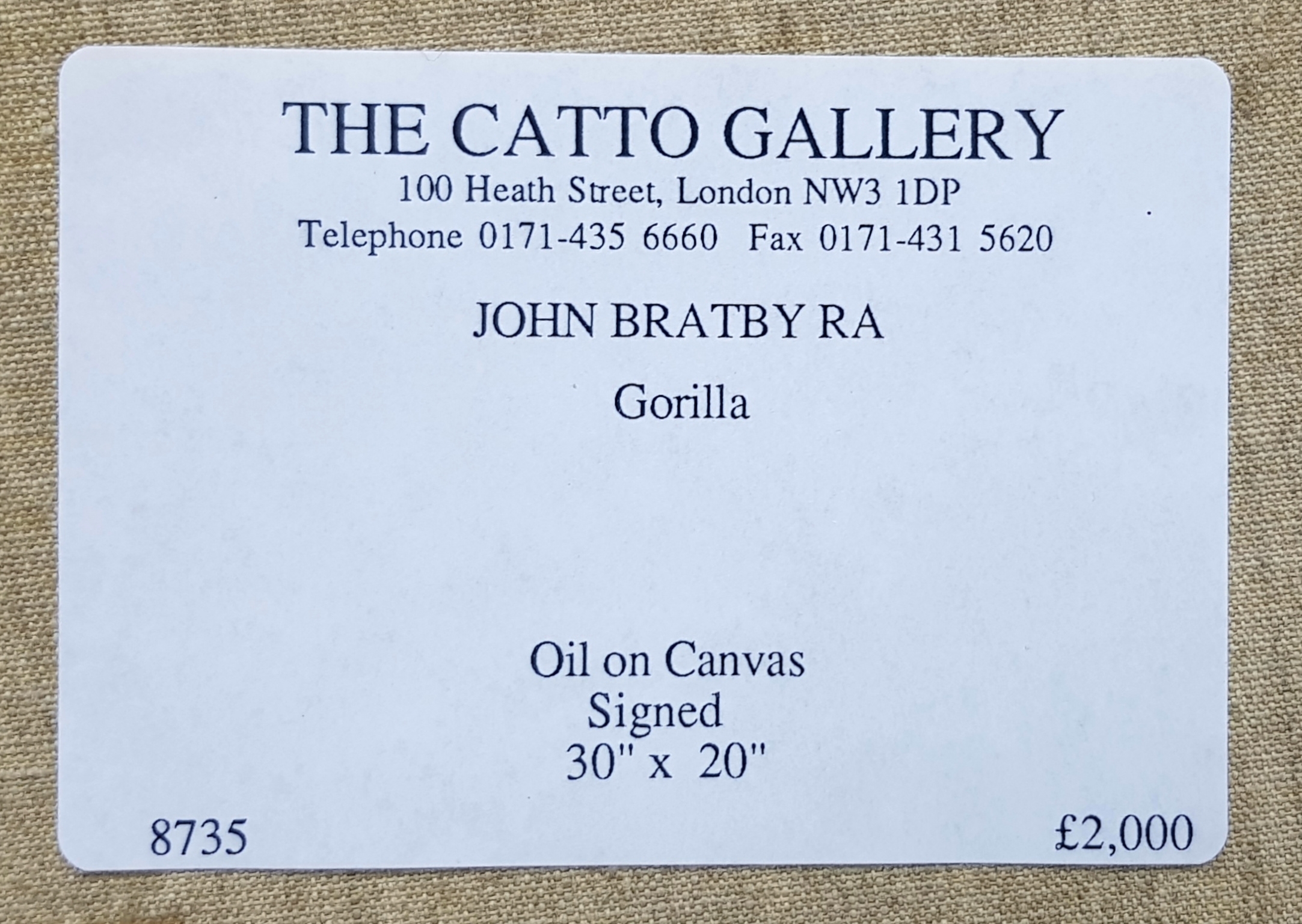 Gorilla - Oil on Canvas by Acclaimed British Artist John Bratby R.A. (1928-1992). Bratby founded the kitchen sink realism style of art that was influential in the late 1950s and later developed an affinity for Guy the Gorilla, painting several portraits of him. Signed Bratby near right corner at base. In frame - 53cm x 79cm. Original provenance verso.