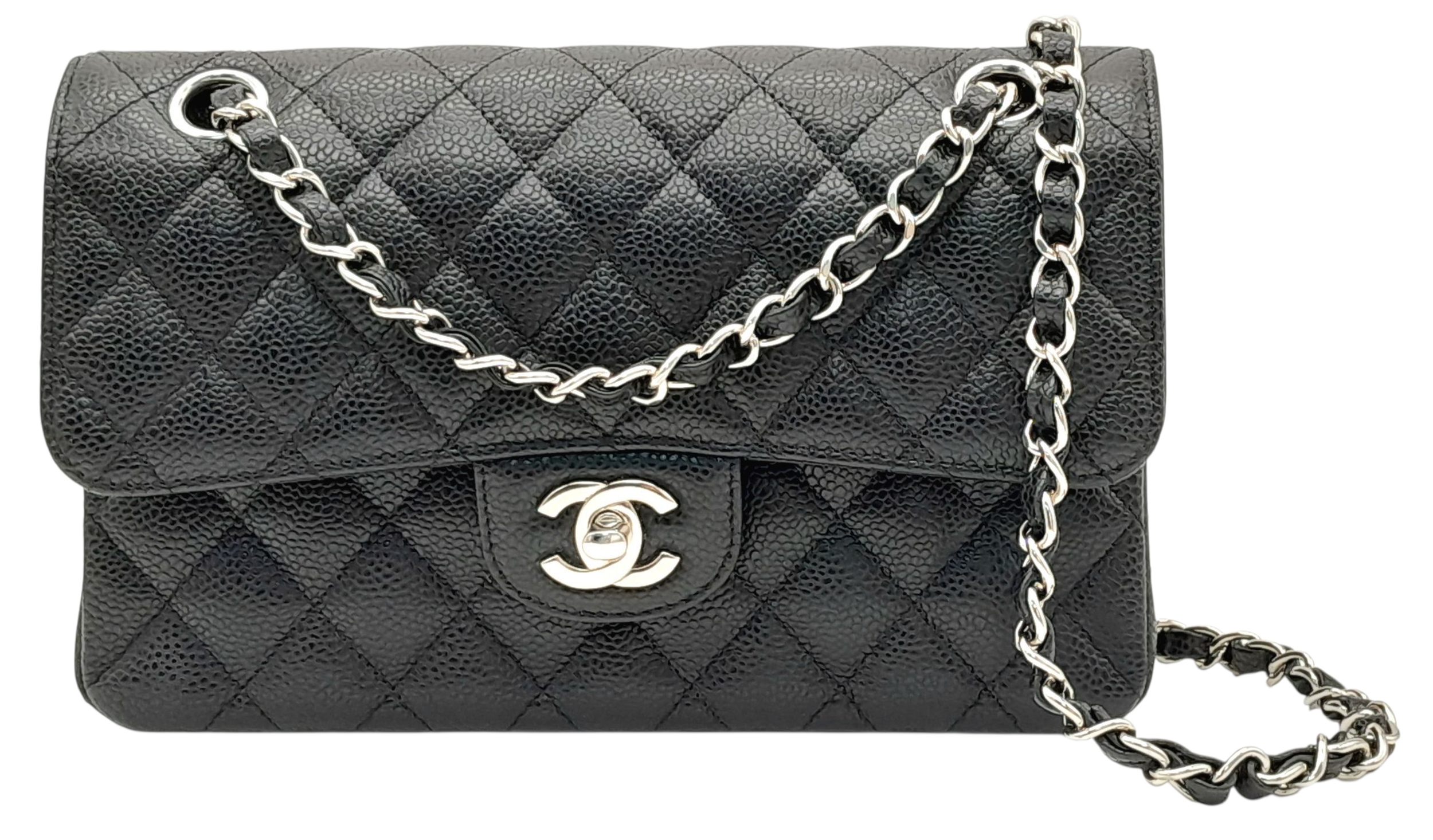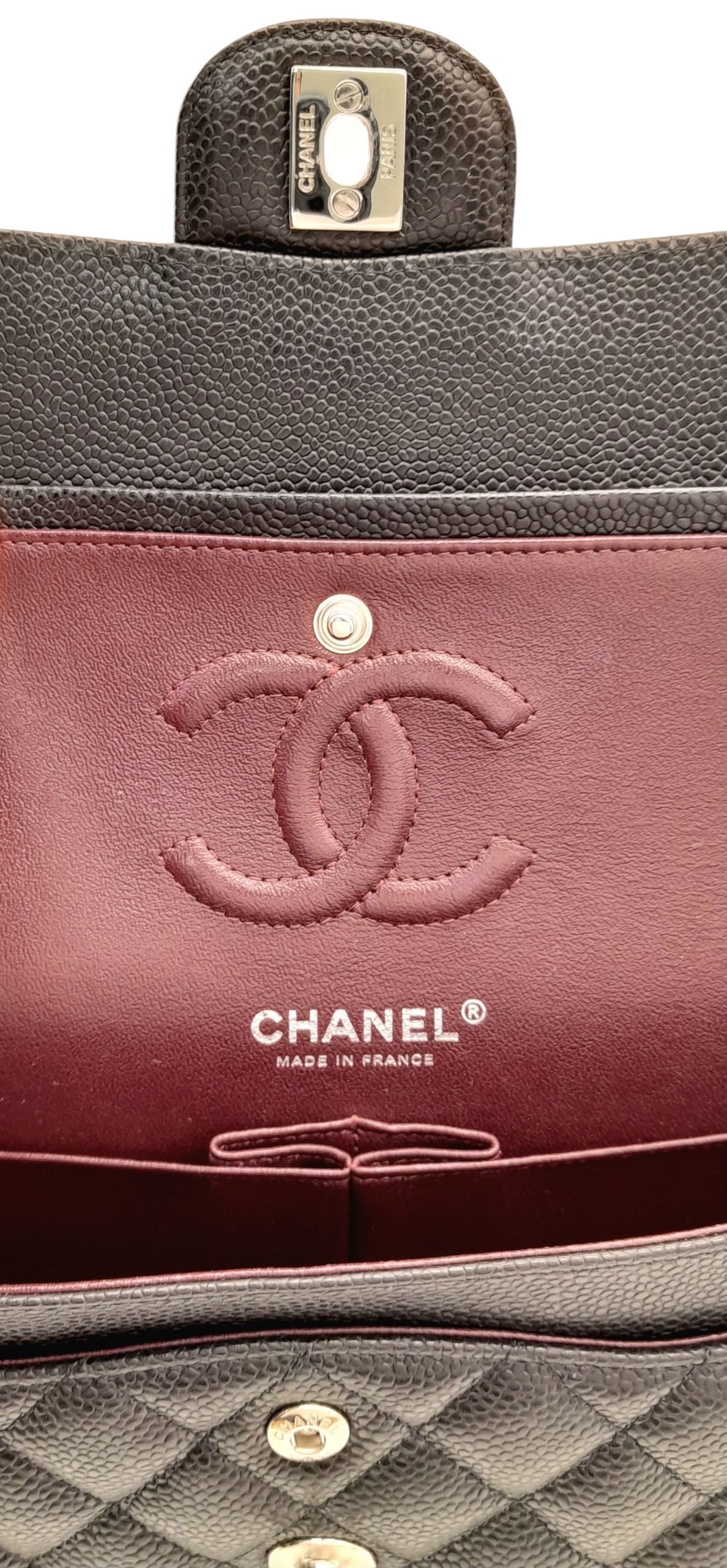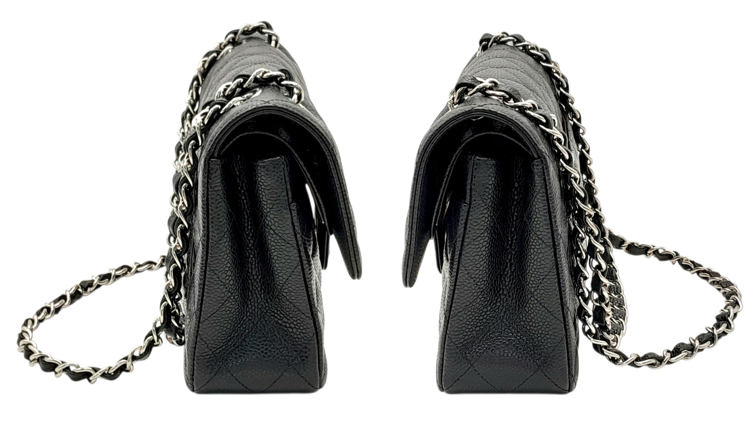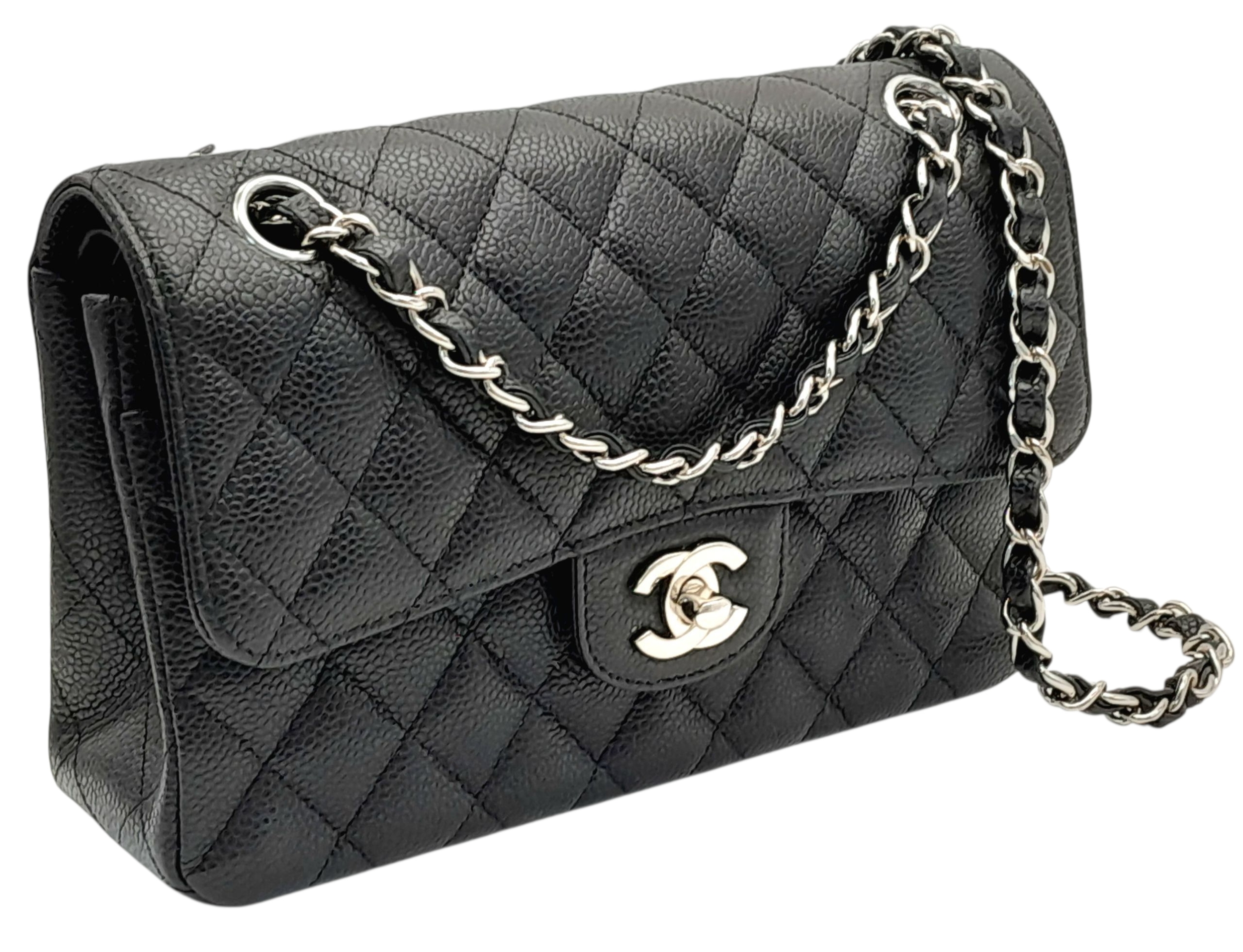 A Chanel Black Caviar Classic Double Flap Bag. Black caviar leather exterior with silver-tone hardware, chain shoulder strap and CC turn-lock closure. Burgundy leather interior with one main compartment and two opened pockets. Few tiny stains exterior, but overall in very good condition. Approx 23cm length x 15cm height x 6cm depth. Comes with a dust cover. Please see photos or request a condition report. Ref: JJ208.