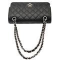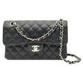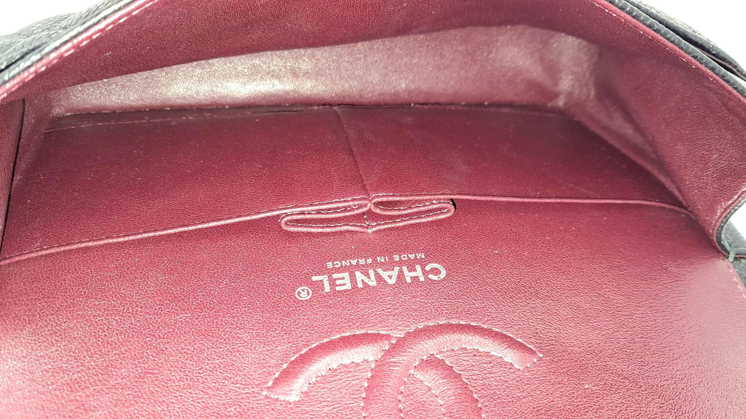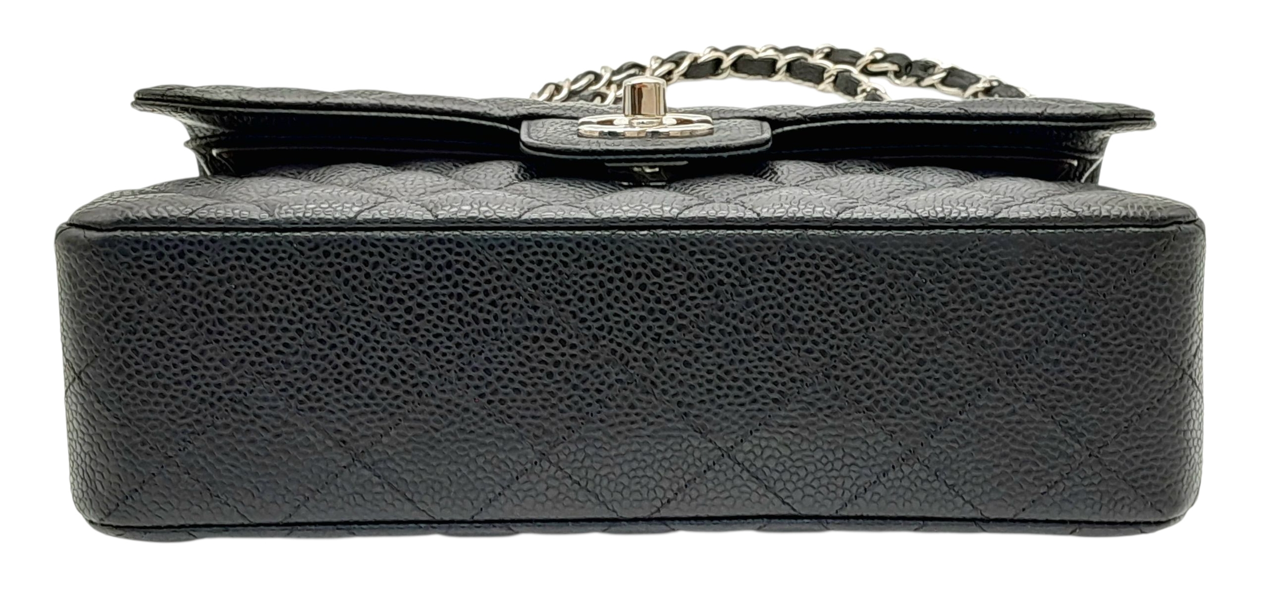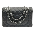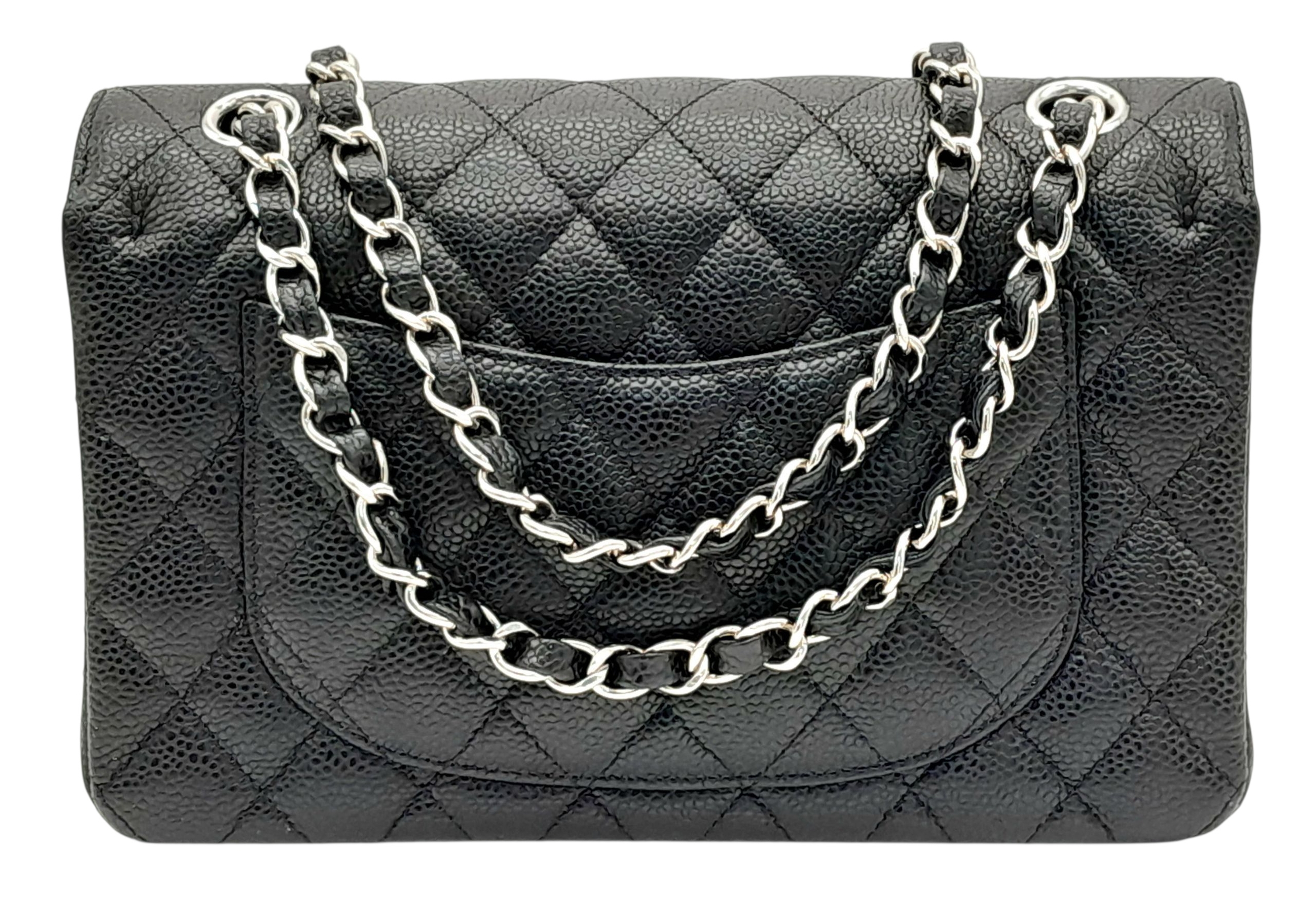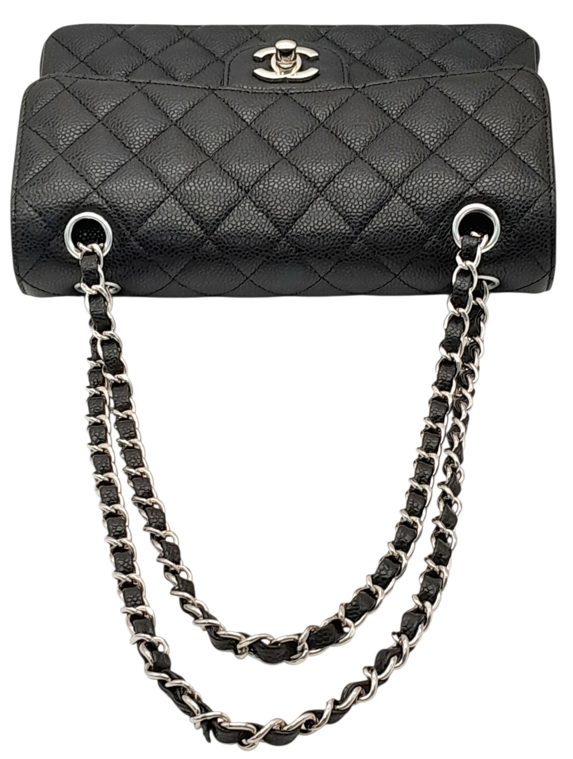 A Chanel Black Caviar Classic Double Flap Bag. Black caviar leather exterior with silver-tone hardware, chain shoulder strap and CC turn-lock closure. Burgundy leather interior with one main compartment and two opened pockets. Few tiny stains exterior, but overall in very good condition. Approx 23cm length x 15cm height x 6cm depth. Comes with a dust cover. Please see photos or request a condition report. Ref: JJ208.