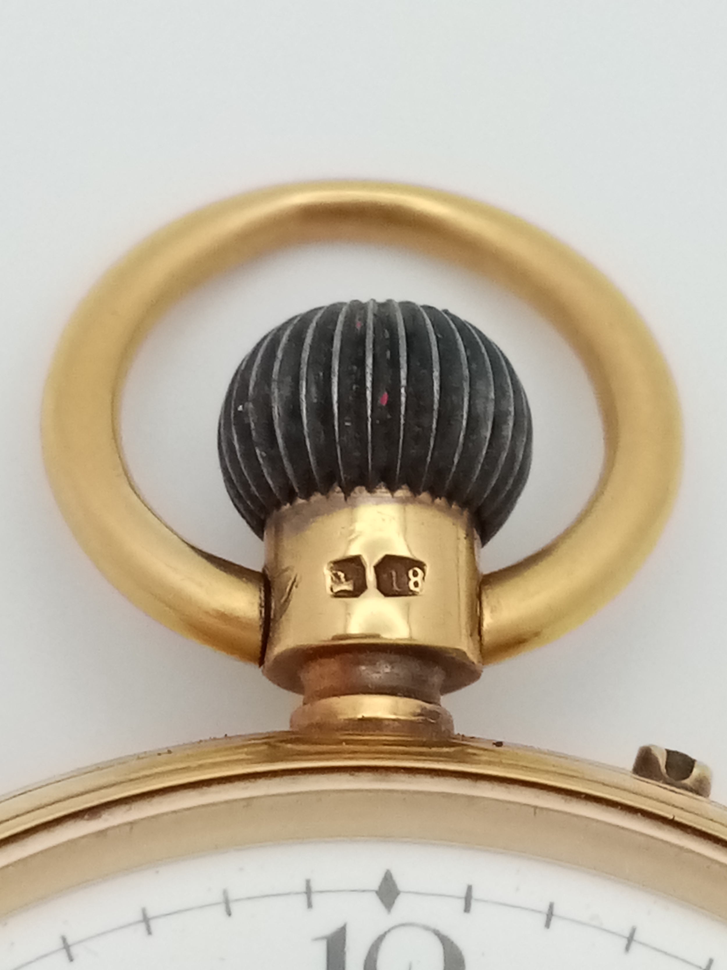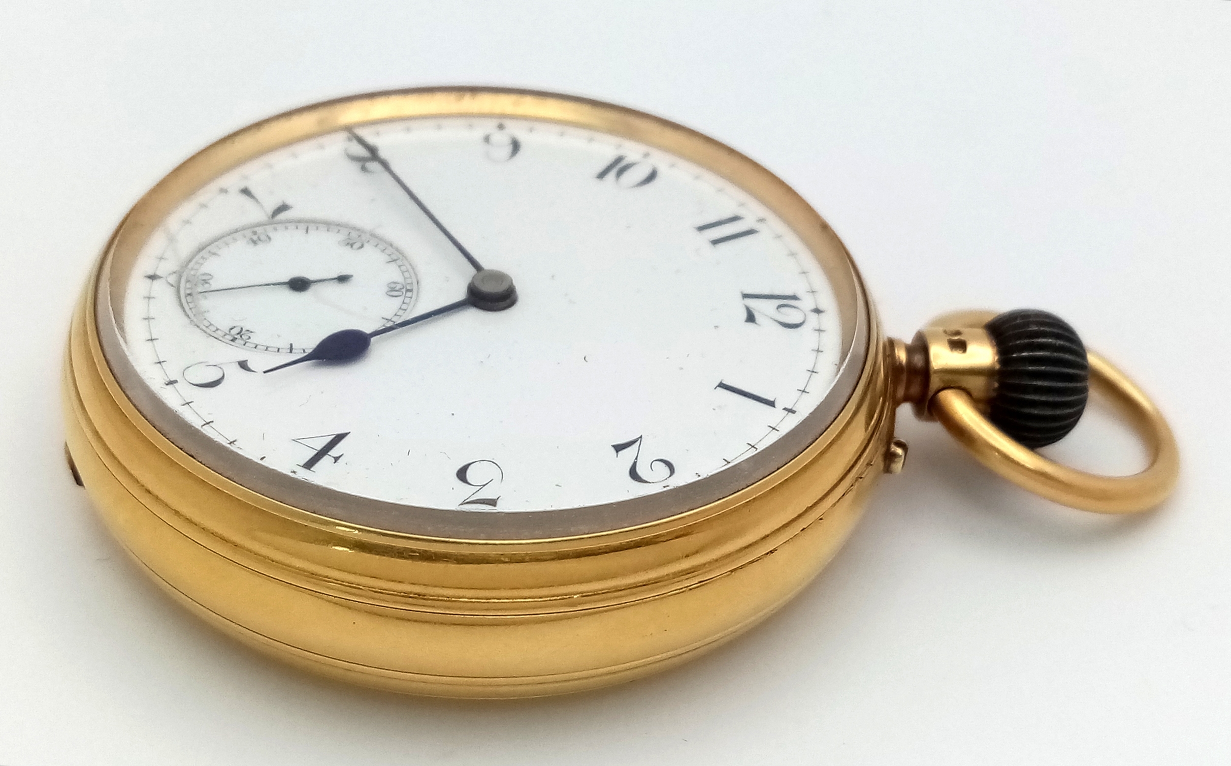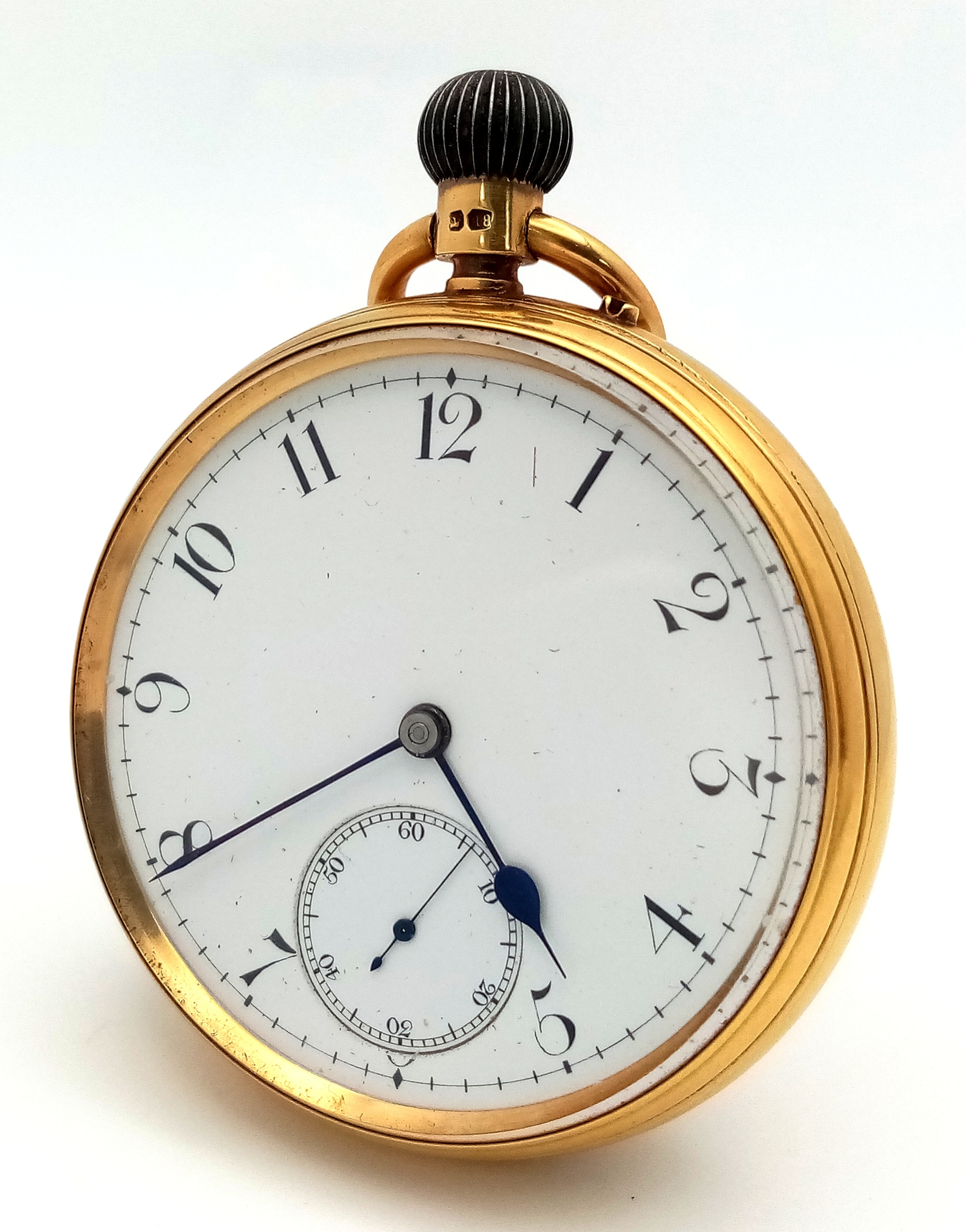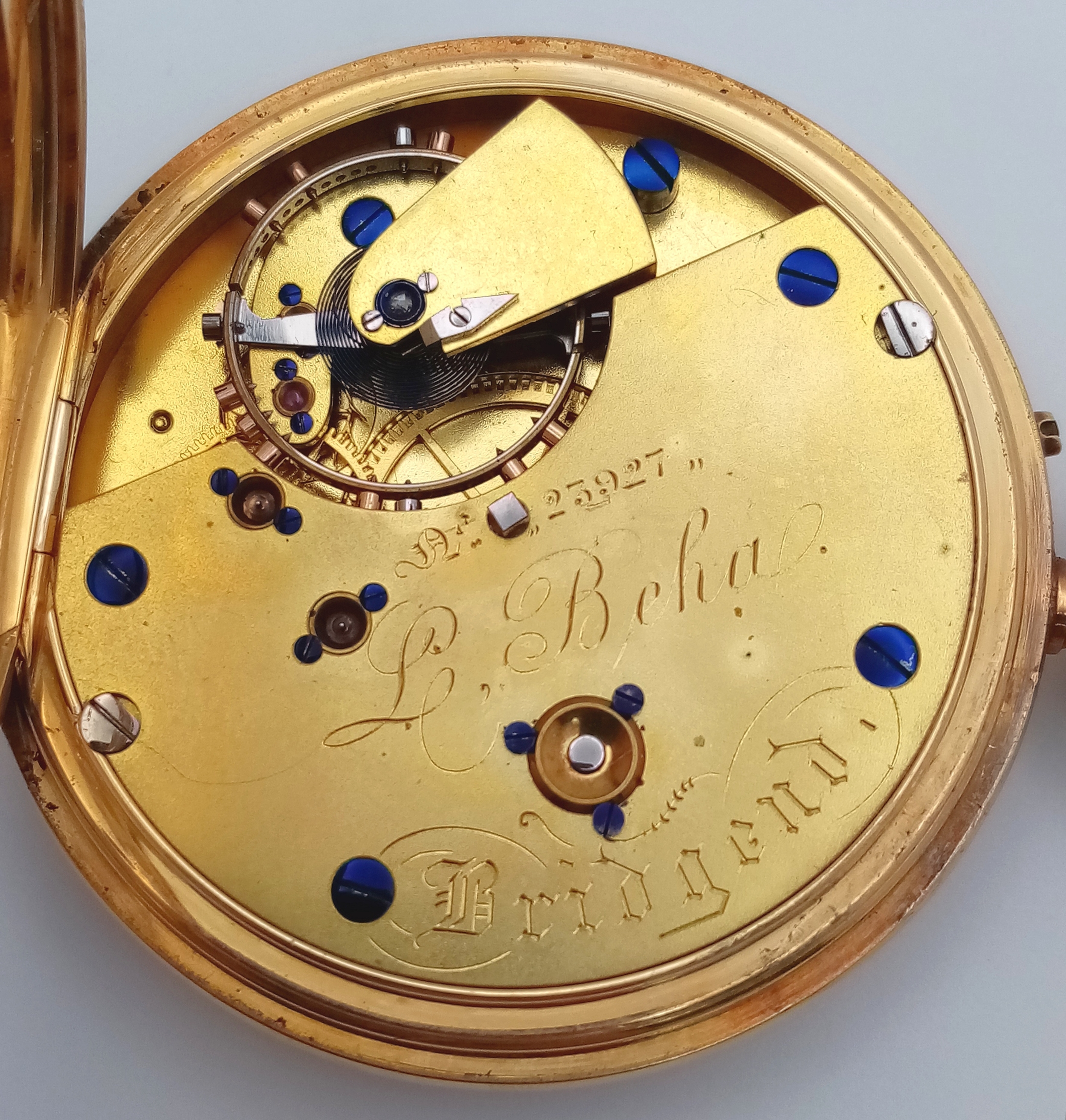 AN OPEN FACE 18K GOLD POCKET WATCH WITH THE WORKS OF "L BEHA" OF BRIDGEND, THE CASE BEING DATED 1913 IN VERY NICE CONDITION AND FULL WORKING ORDER. TOTAL WEIGHT 124.5gms. NOTE: HEAVY 18K GOLD CASE C. 52G. CROWN - NON-GOLD.