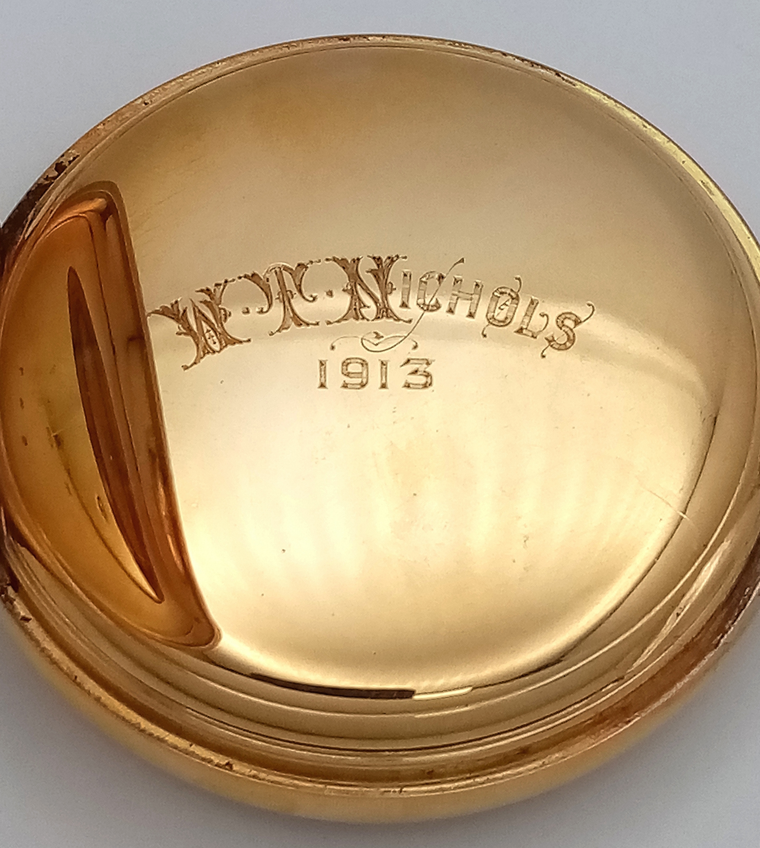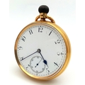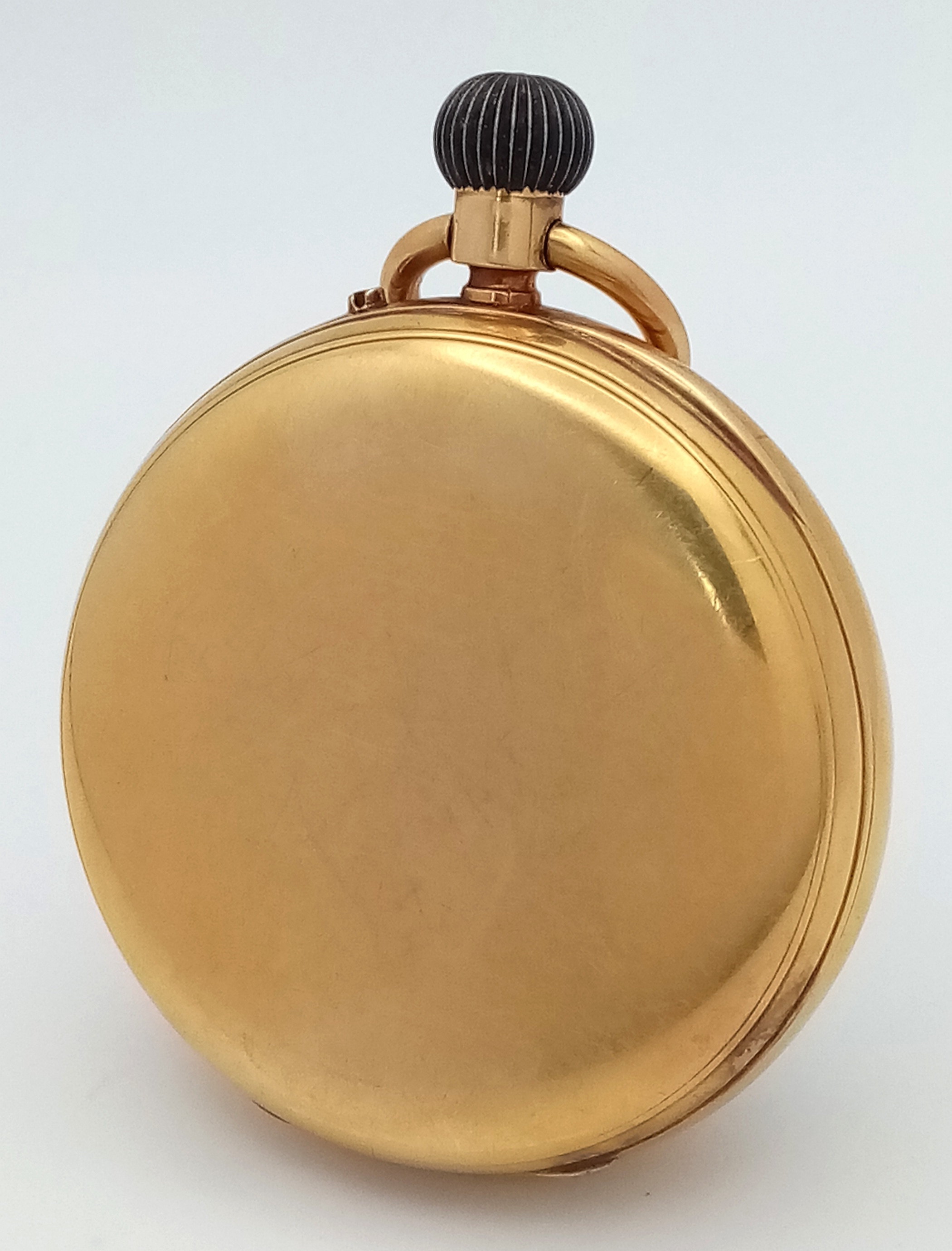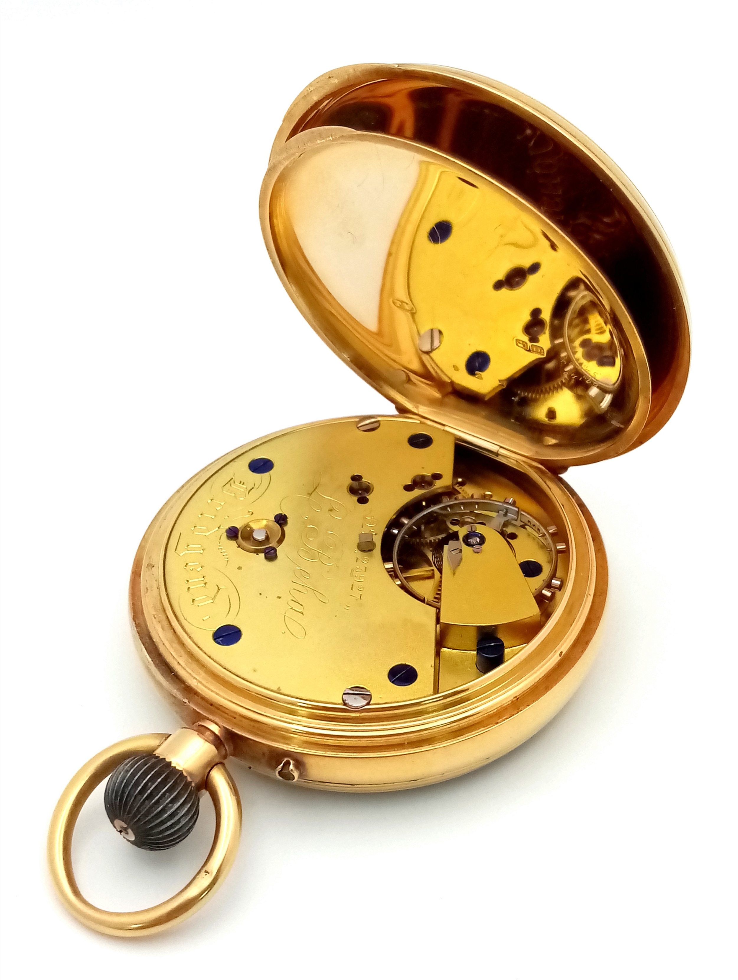 AN OPEN FACE 18K GOLD POCKET WATCH WITH THE WORKS OF "L BEHA" OF BRIDGEND, THE CASE BEING DATED 1913 IN VERY NICE CONDITION AND FULL WORKING ORDER. TOTAL WEIGHT 124.5gms. NOTE: HEAVY 18K GOLD CASE C. 52G. CROWN - NON-GOLD.