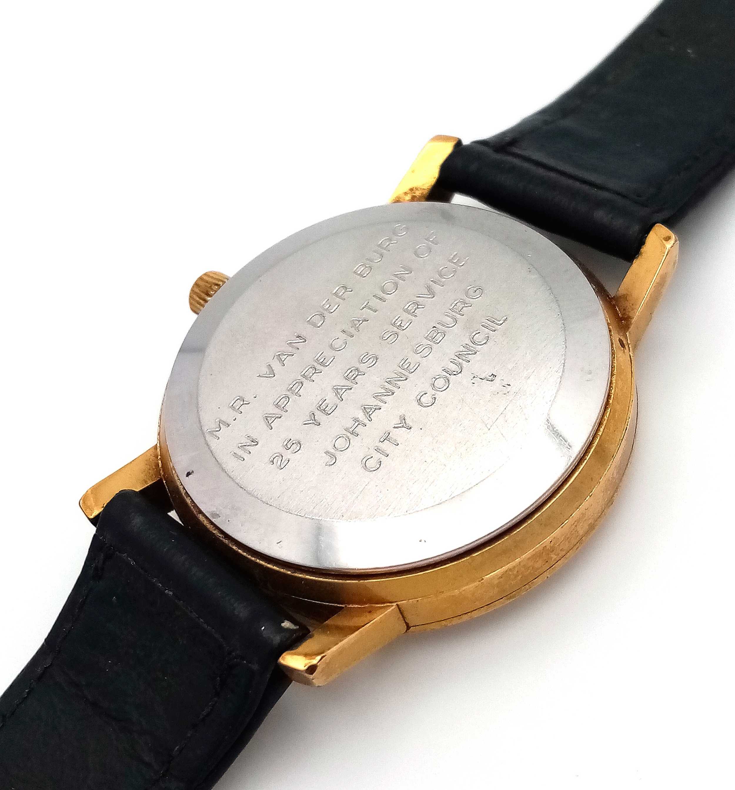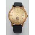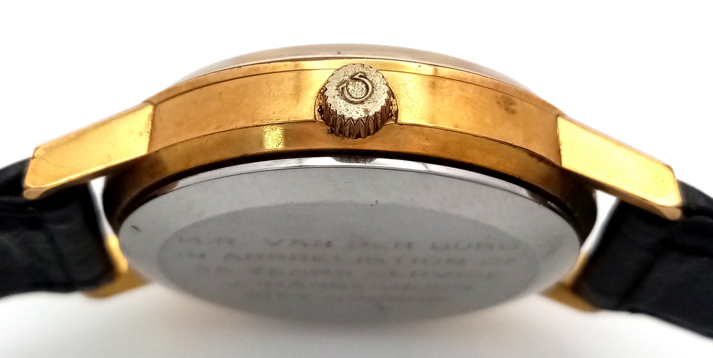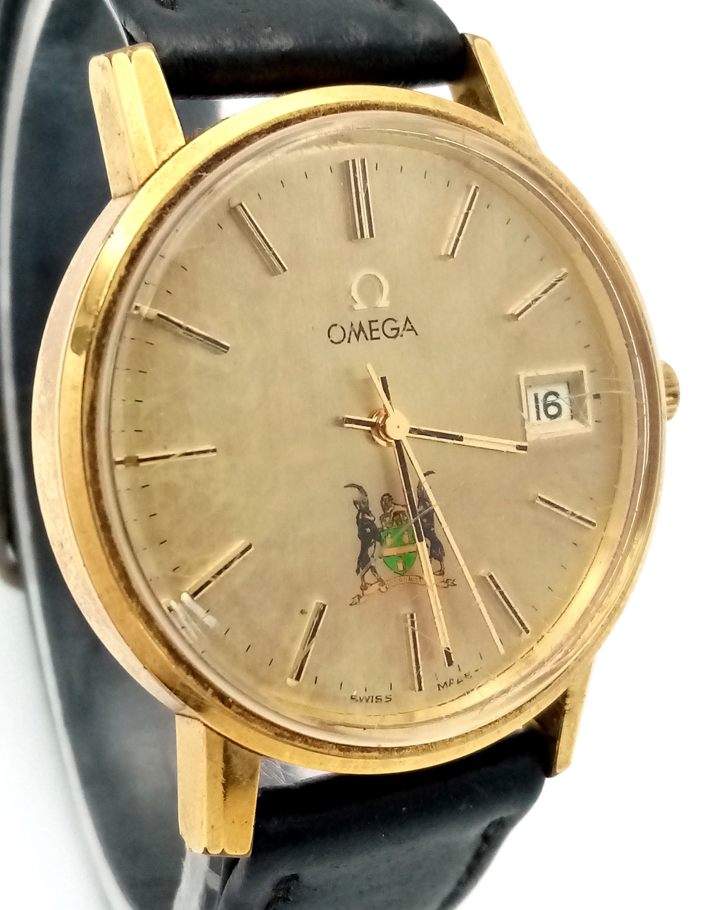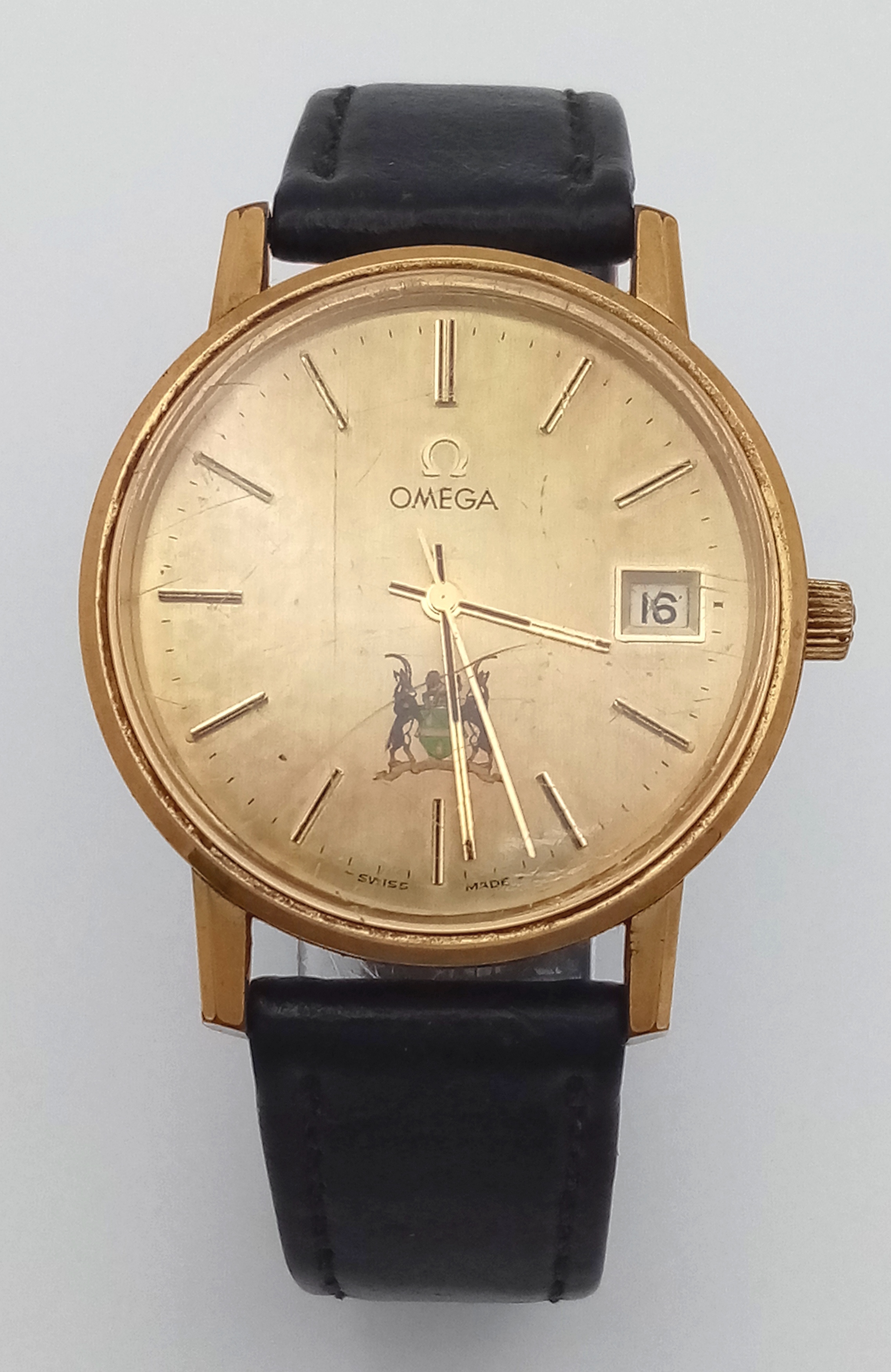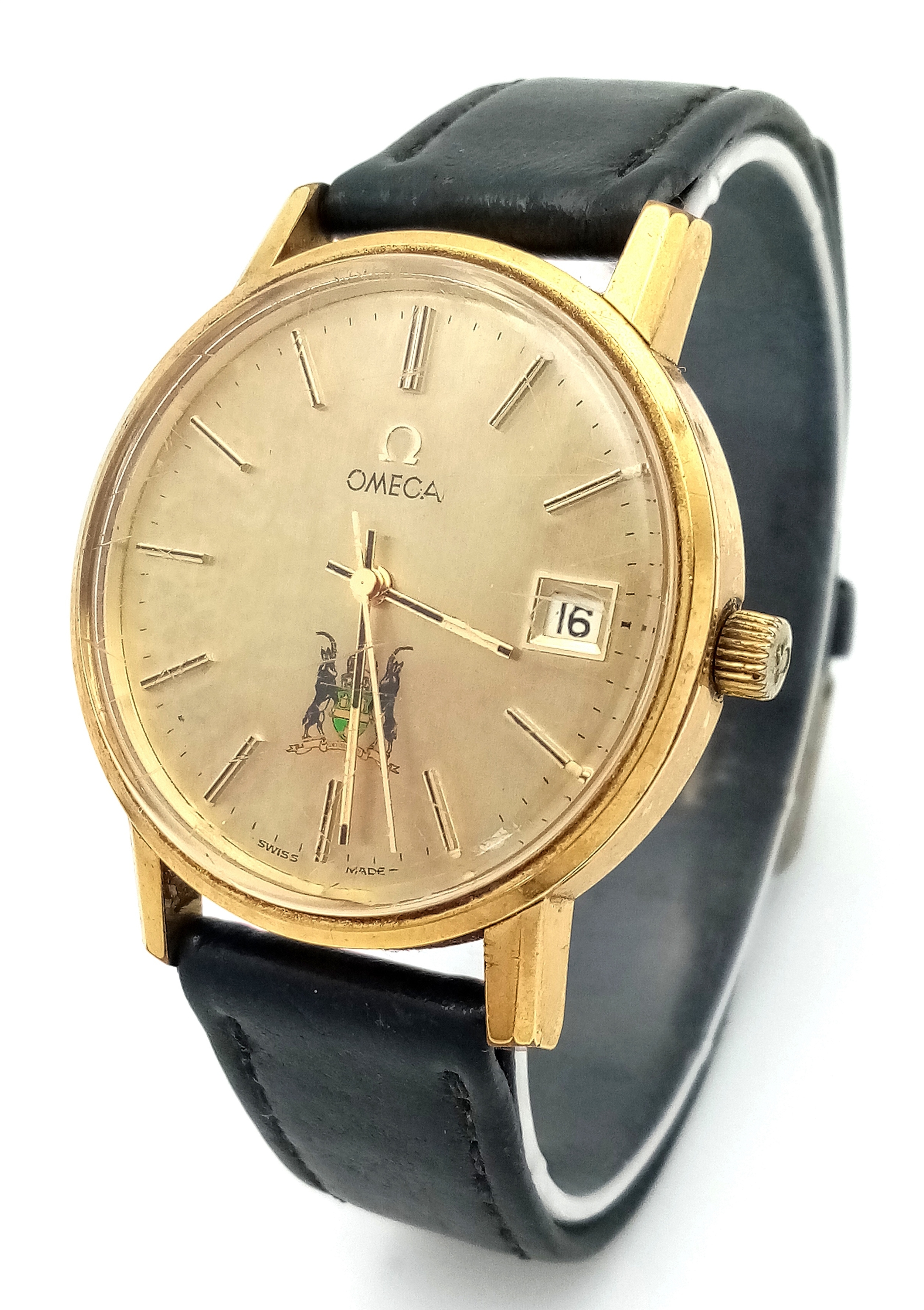 A Vintage Omega Seamaster watch with a South African Antelope Crest on Dial. Black leather strap. Two tone stainless steel case - 36mm. Gold tone dial with date window. 25 year service engraving on back of case. In working order.