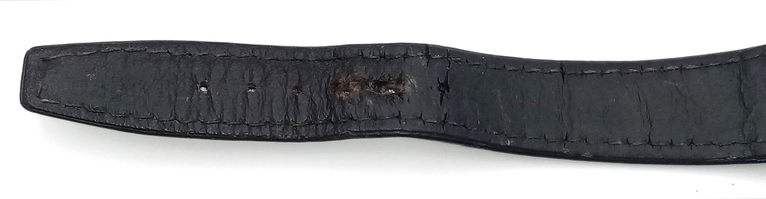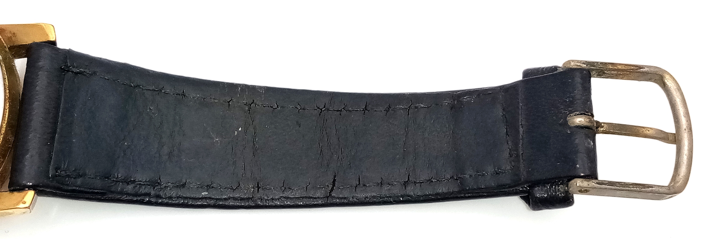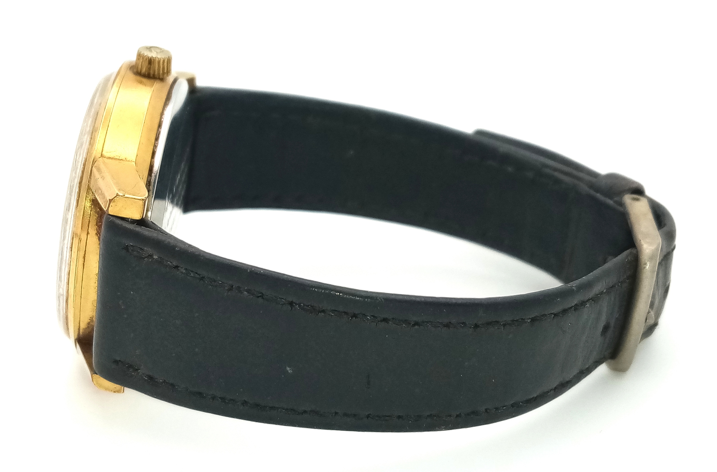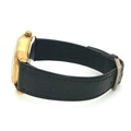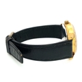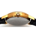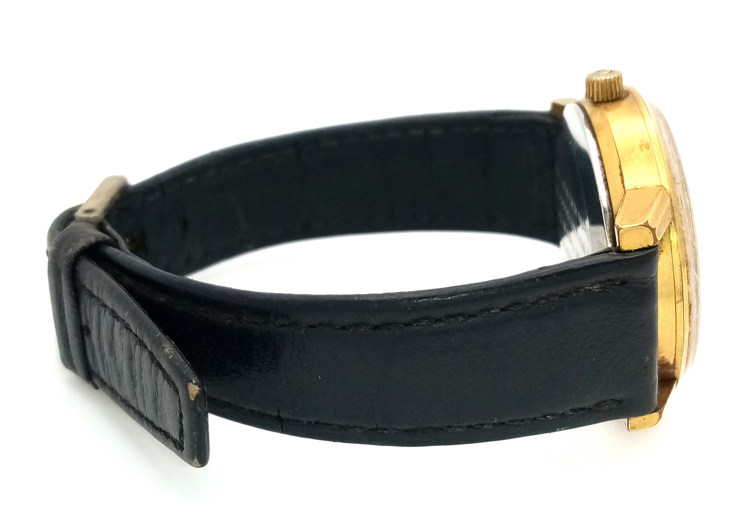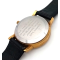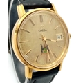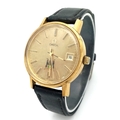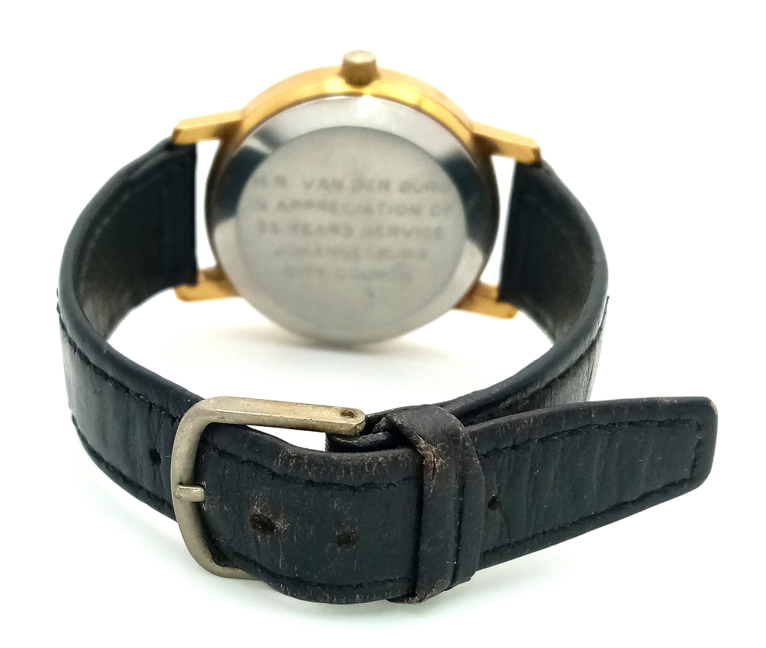 A Vintage Omega Seamaster watch with a South African Antelope Crest on Dial. Black leather strap. Two tone stainless steel case - 36mm. Gold tone dial with date window. 25 year service engraving on back of case. In working order.