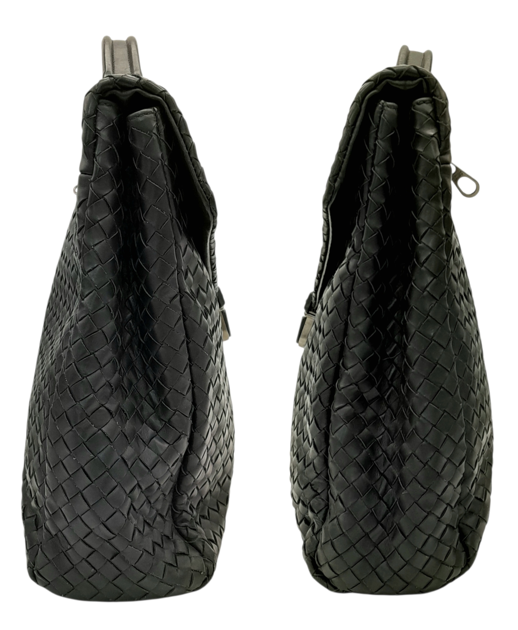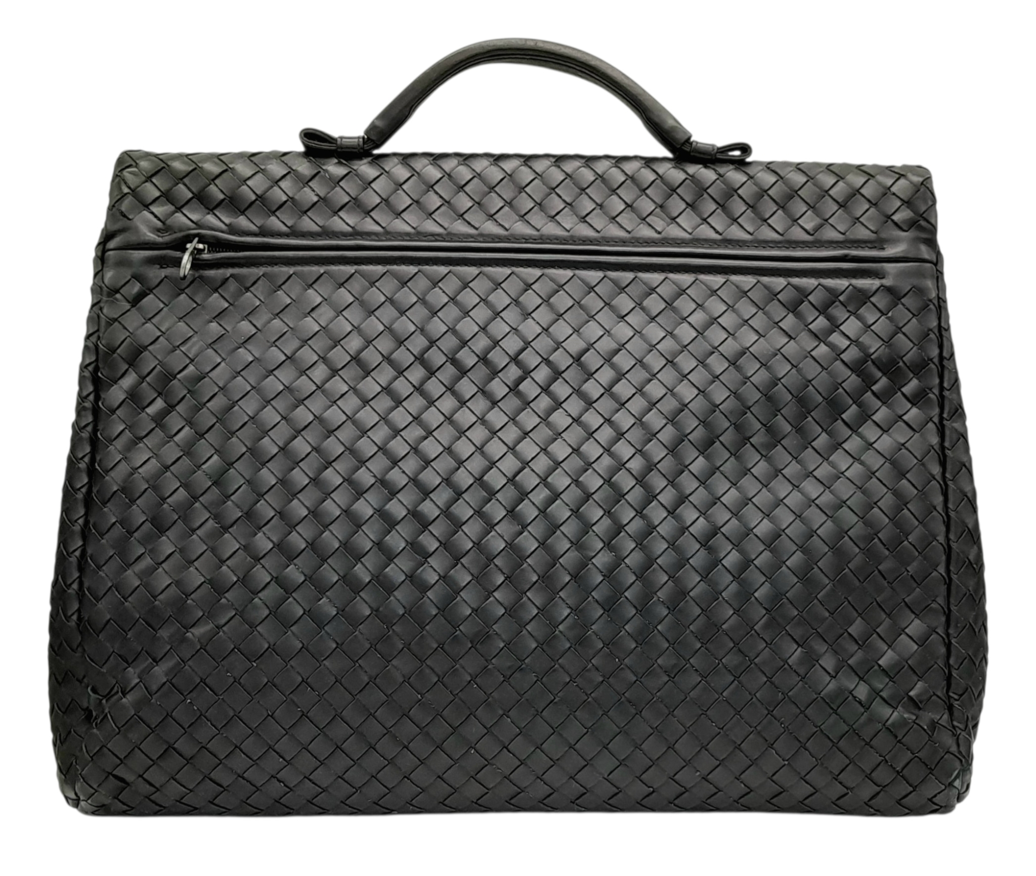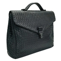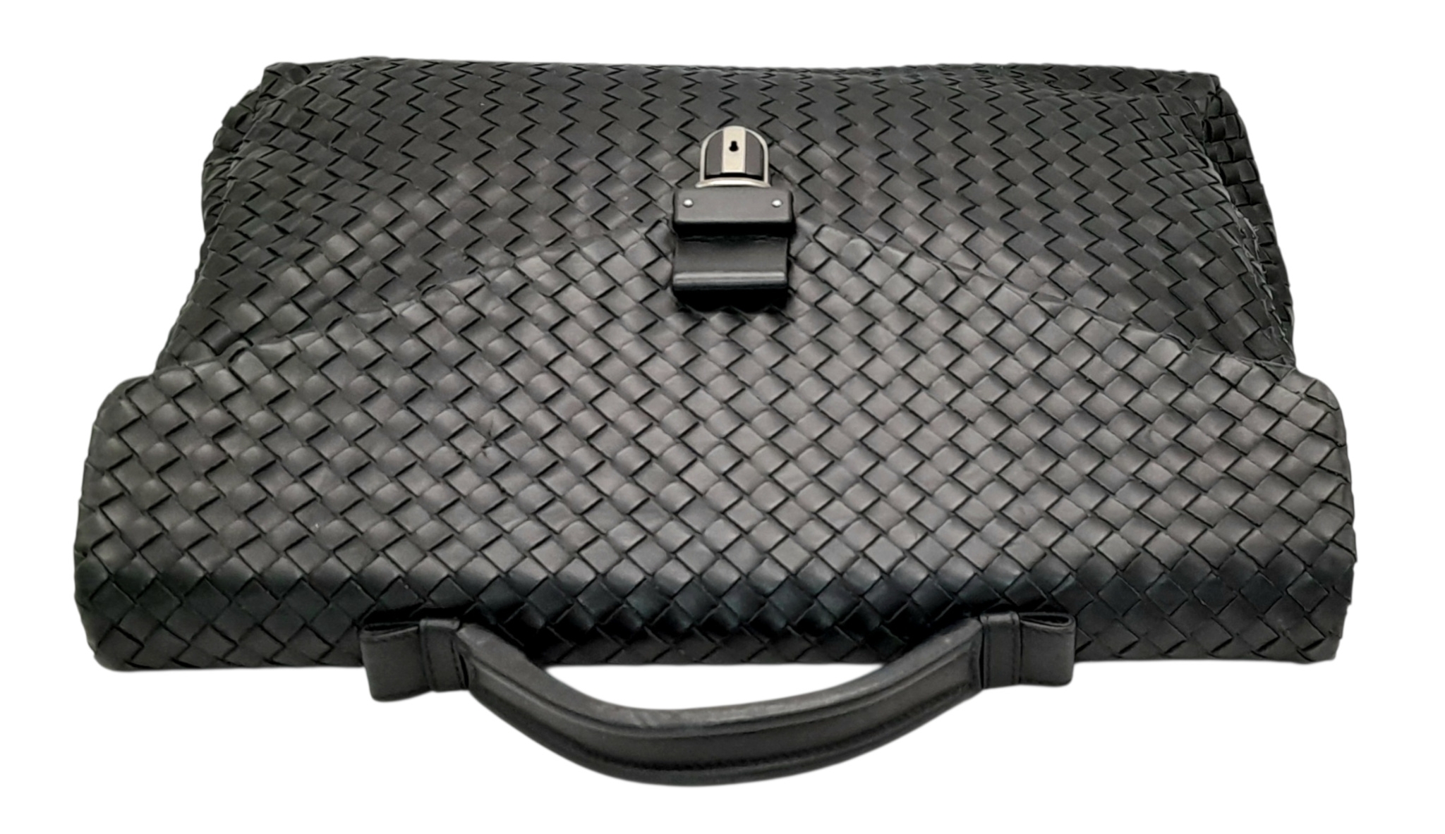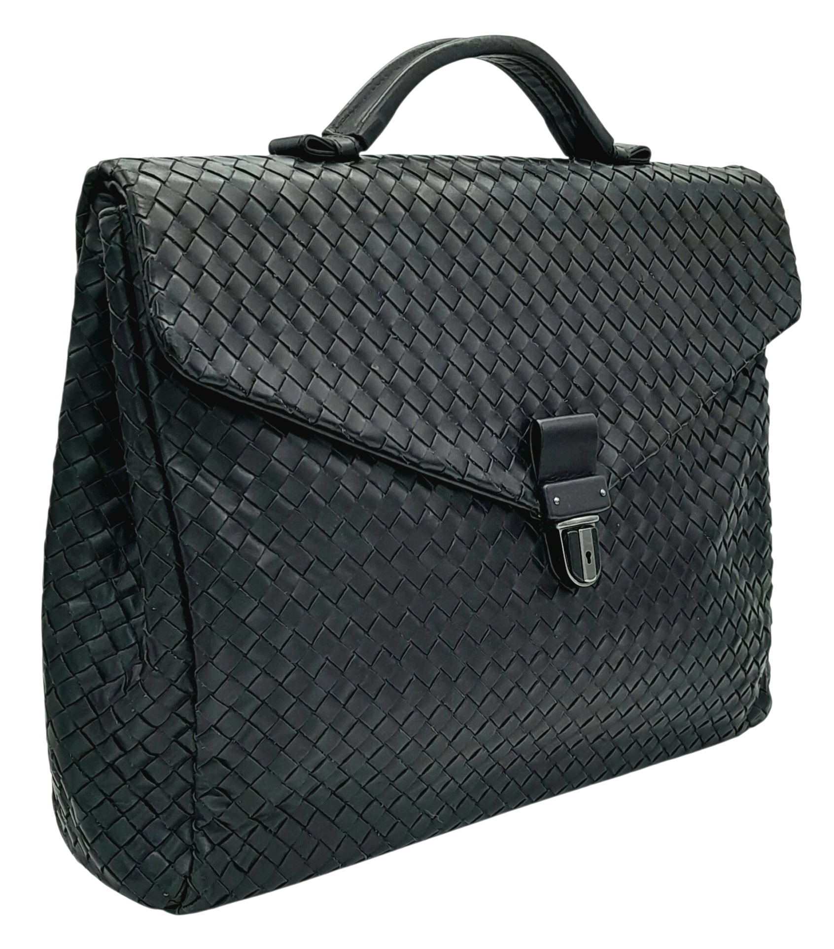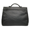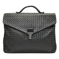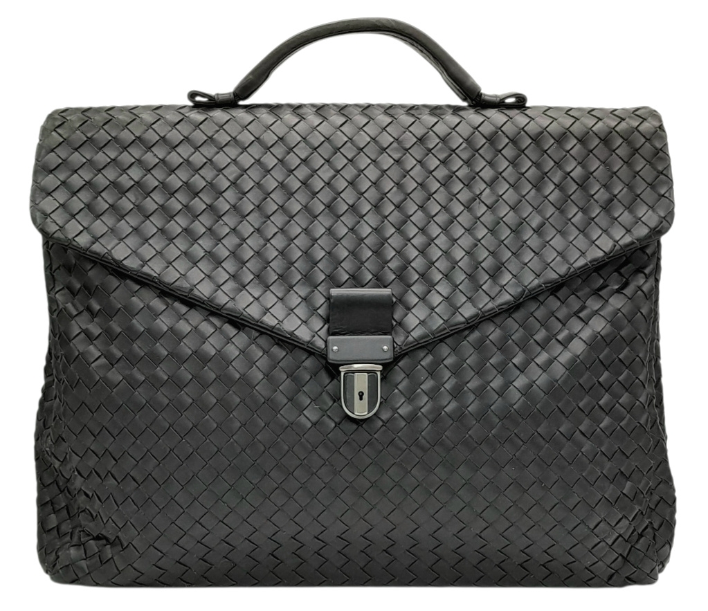 A Bottega Veneta Black Intrecciato Leather Briefcase. Black leather exterior with silver-tone hardware, top handle, and front flap push-lock closure. Black textile interior with two main compartments. Some scratches, stains, signs of wear and tear to the leather. Approx 40cm length x 30cm height x 8cm width. Comes with a certificate of authenticity and dust cover. Please see photos or request a condition report. Ref:26821.