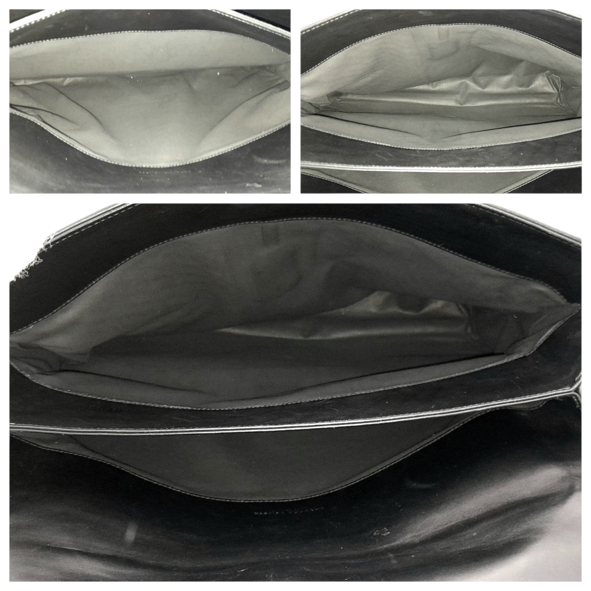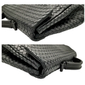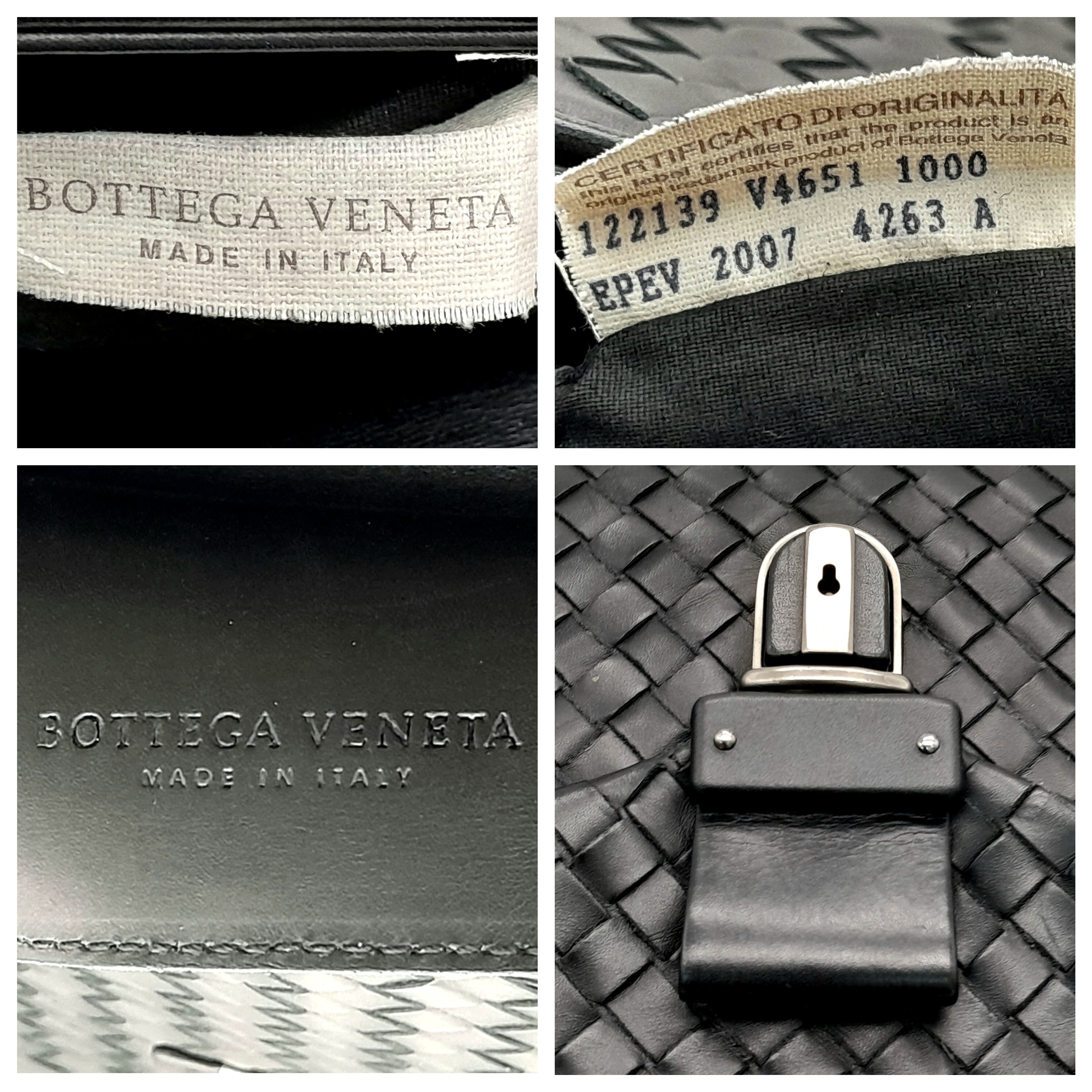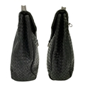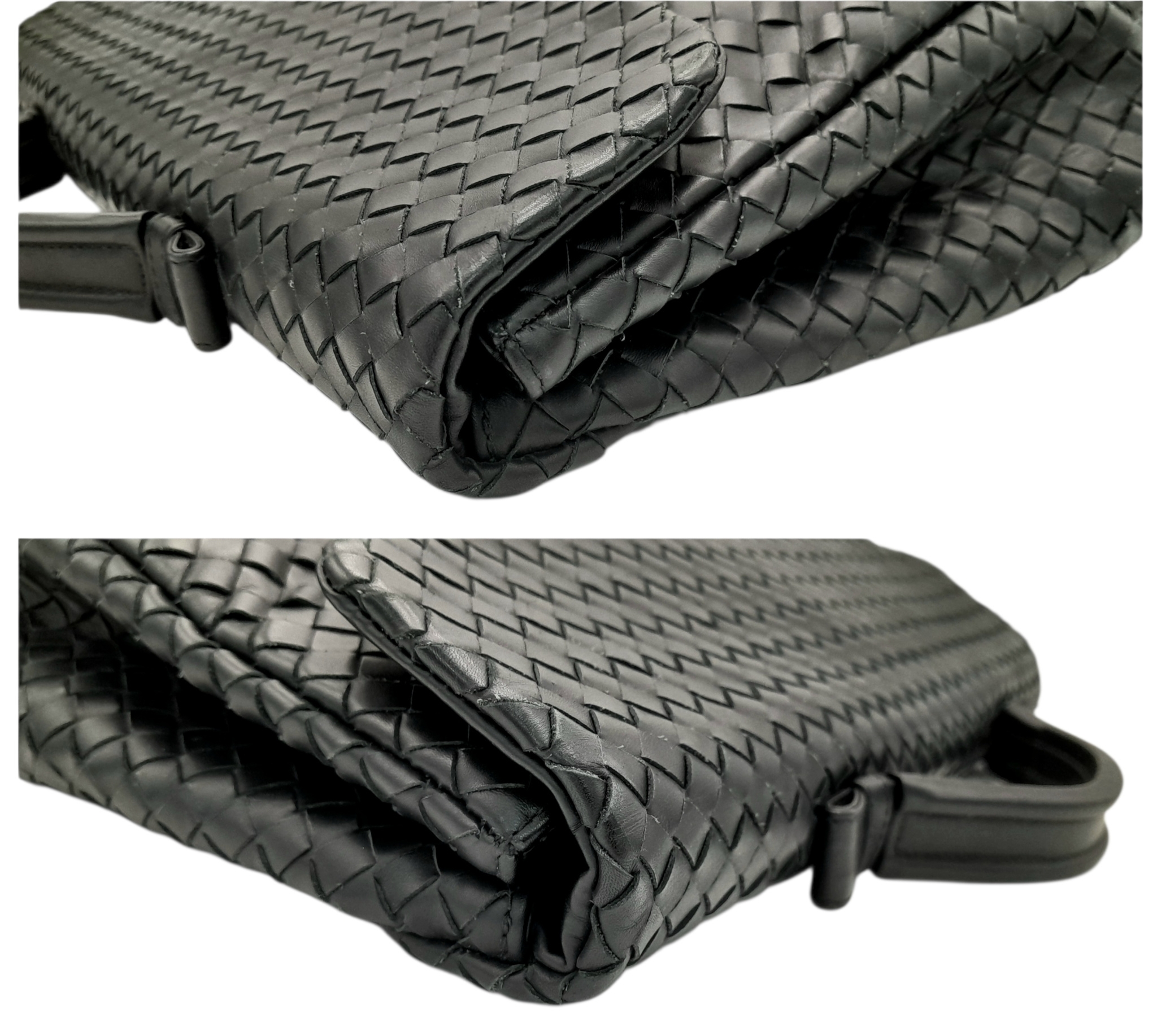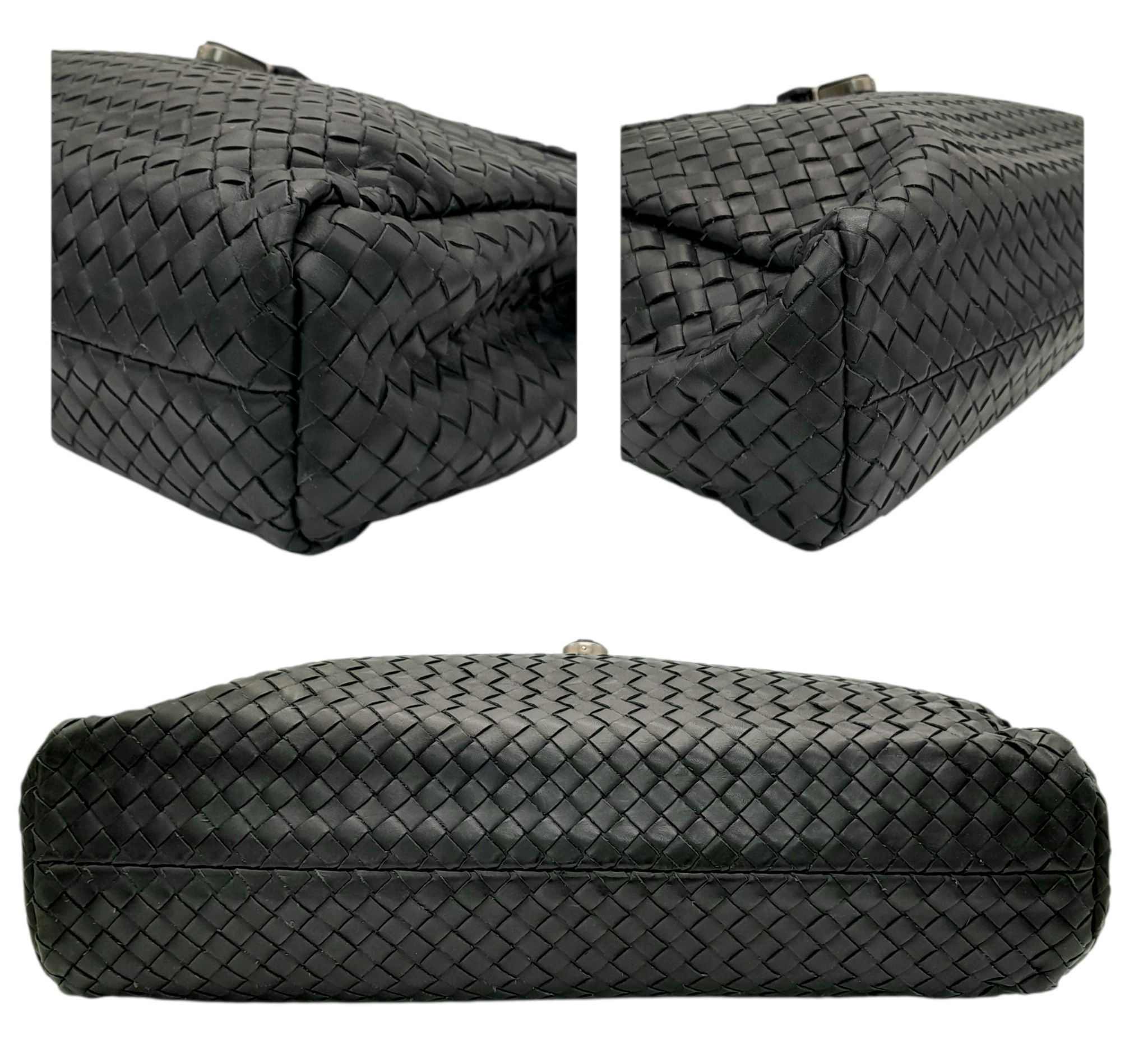 A Bottega Veneta Black Intrecciato Leather Briefcase. Black leather exterior with silver-tone hardware, top handle, and front flap push-lock closure. Black textile interior with two main compartments. Some scratches, stains, signs of wear and tear to the leather. Approx 40cm length x 30cm height x 8cm width. Comes with a certificate of authenticity and dust cover. Please see photos or request a condition report. Ref:26821.