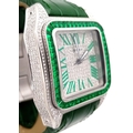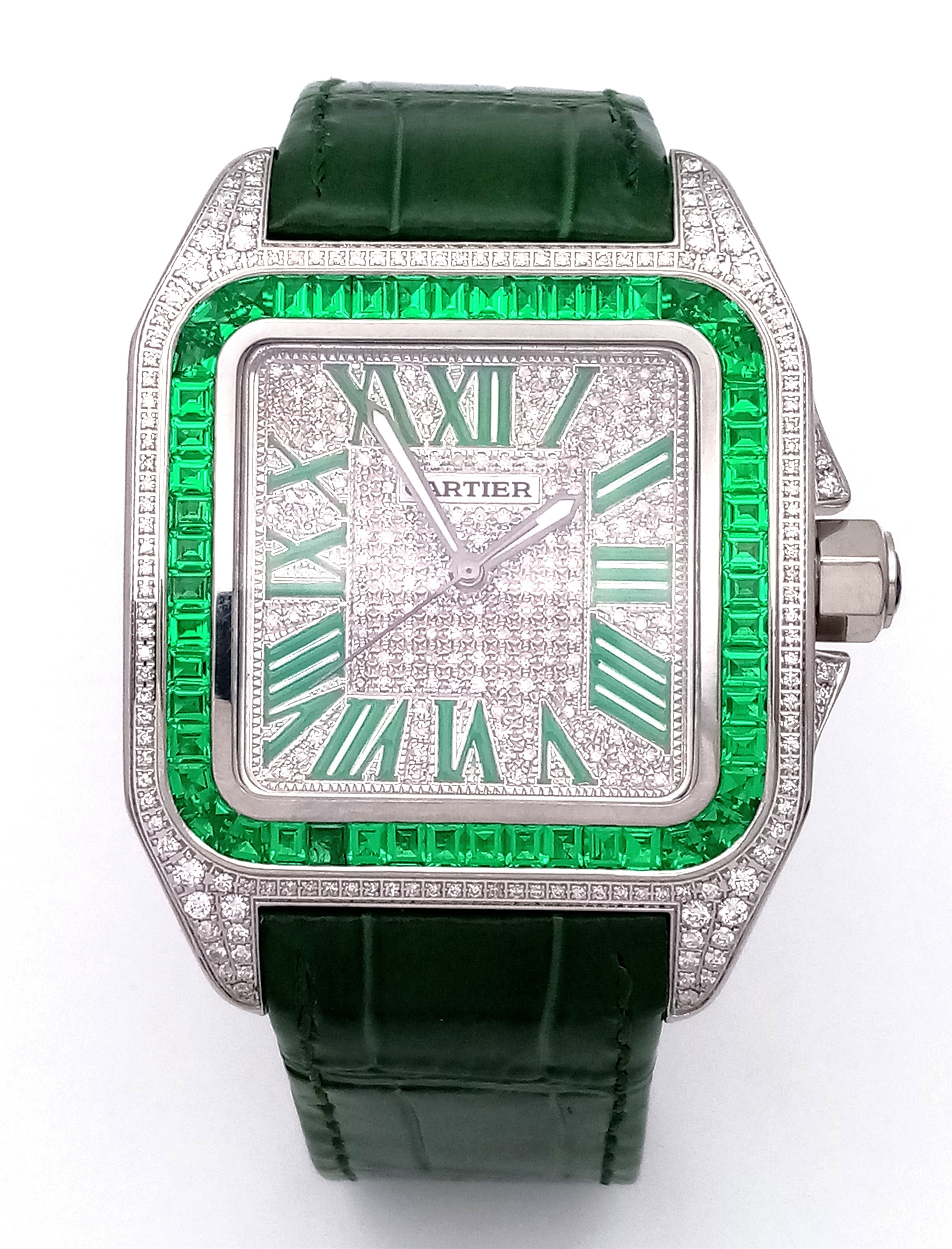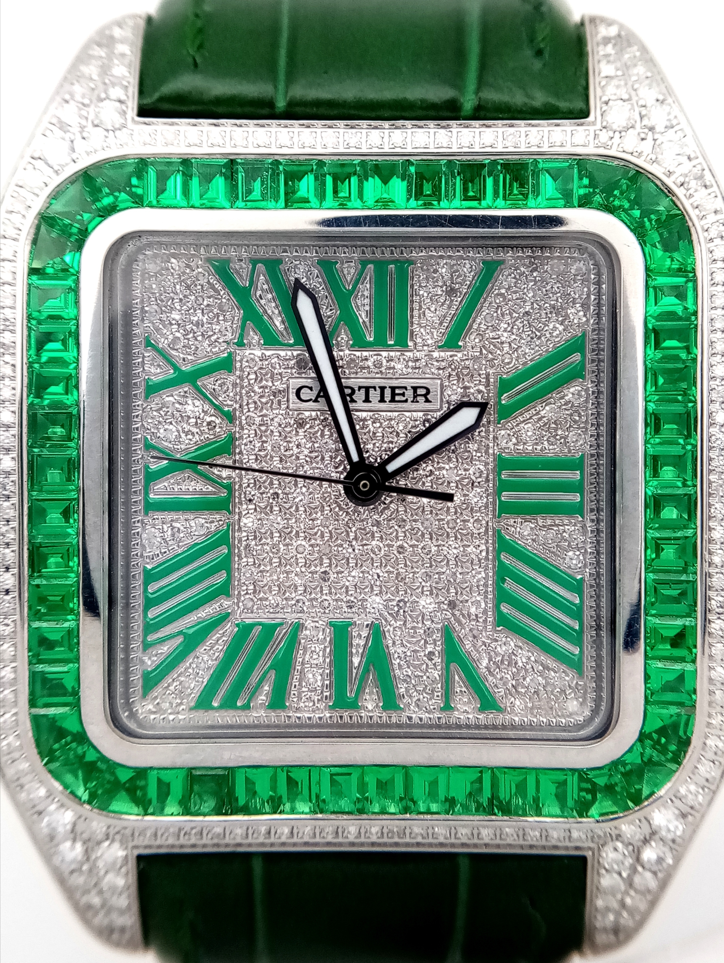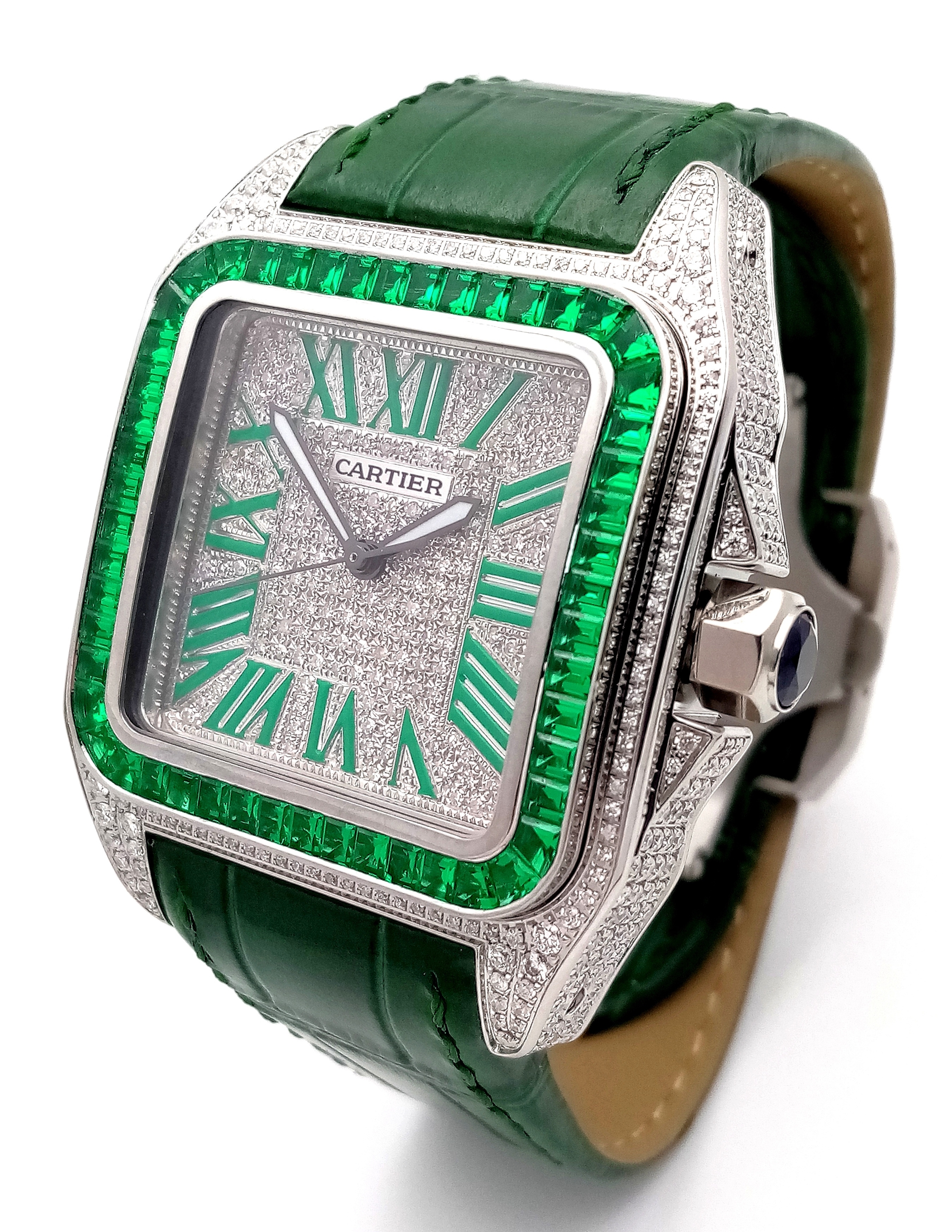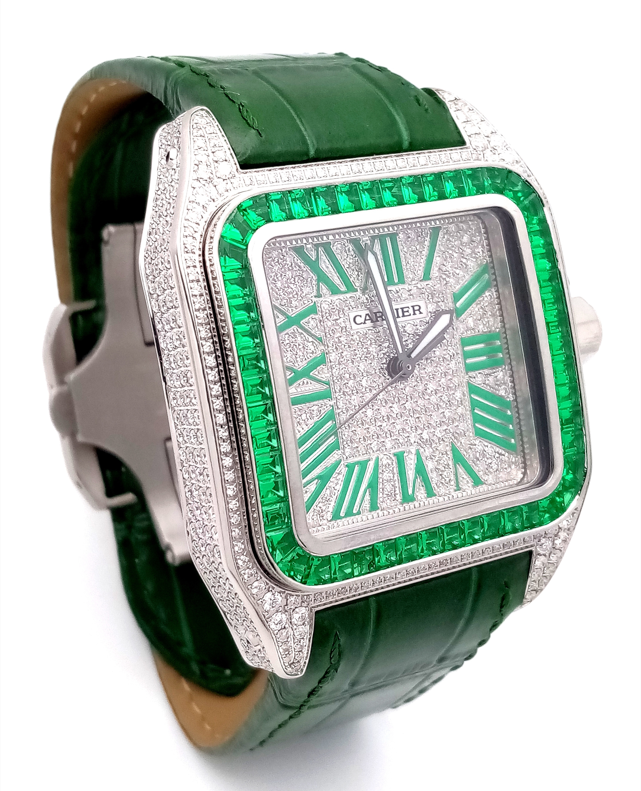 A Head-Turning Cartier Santos 100 Diamond and Emerald 'Hulk' Automatic Gents Watch. Green leather strap with diamond set bezel. Stainless steel case - 40mm. Diamond encrusted dial with green Roman numeral markers. Emerald set inner bezel with a diamond set outer that extends to the case sides and lugs. Note: This watch has been professionally custom fitted with diamonds and emeralds. In good condition and working order. Comes with a Cartier case.