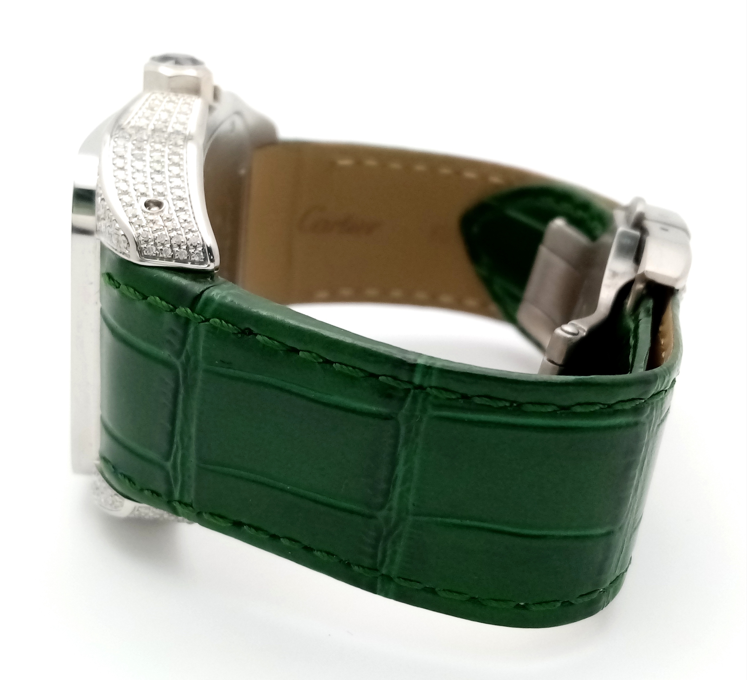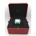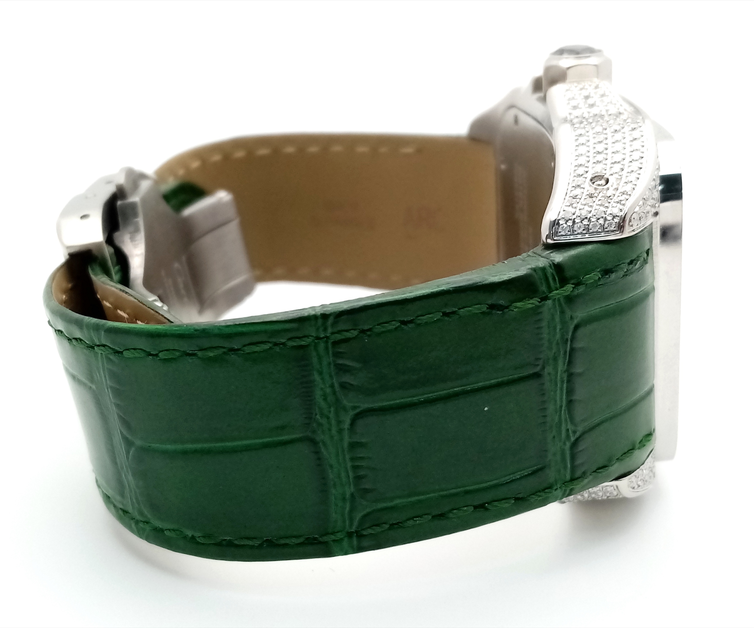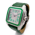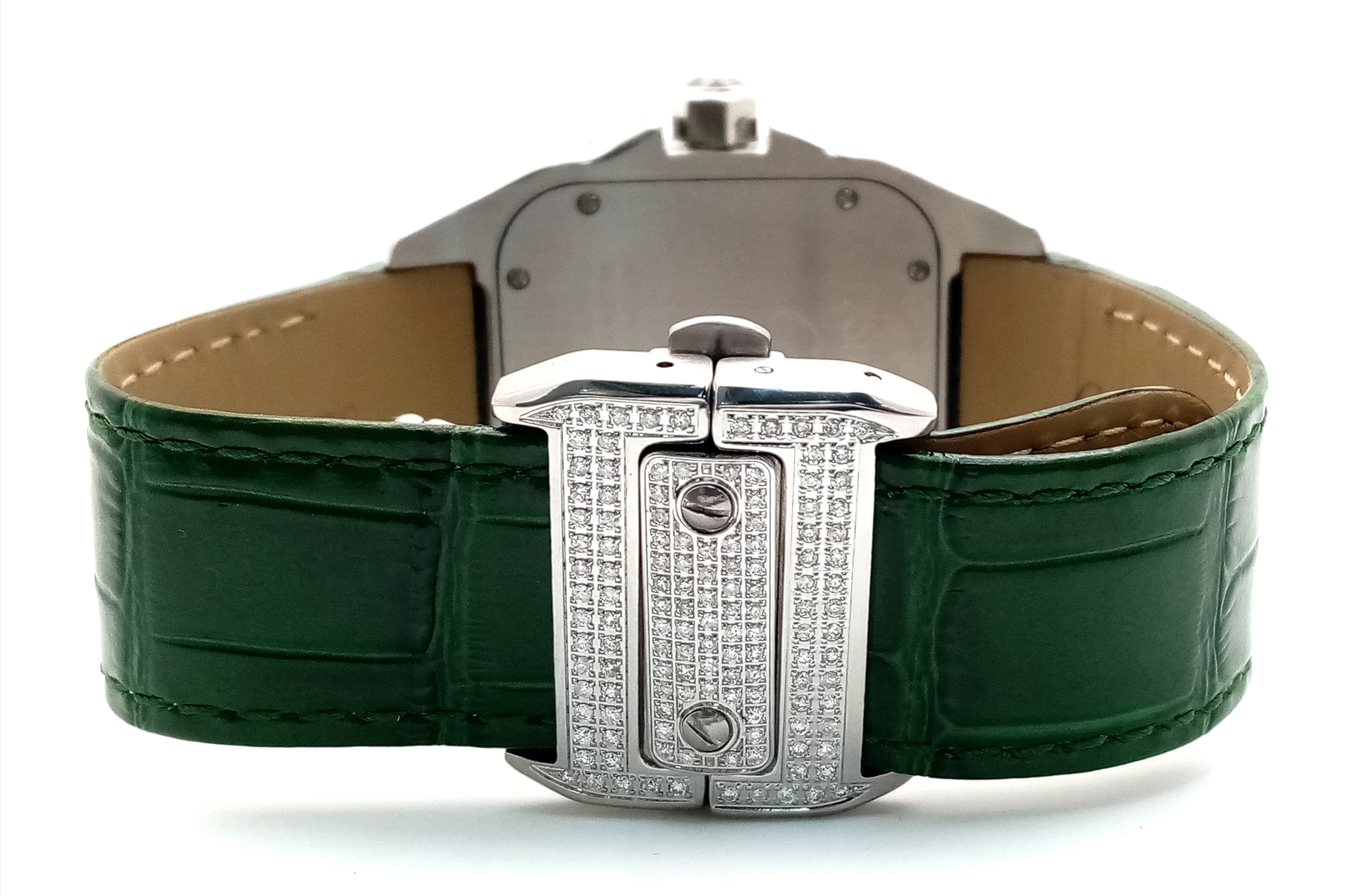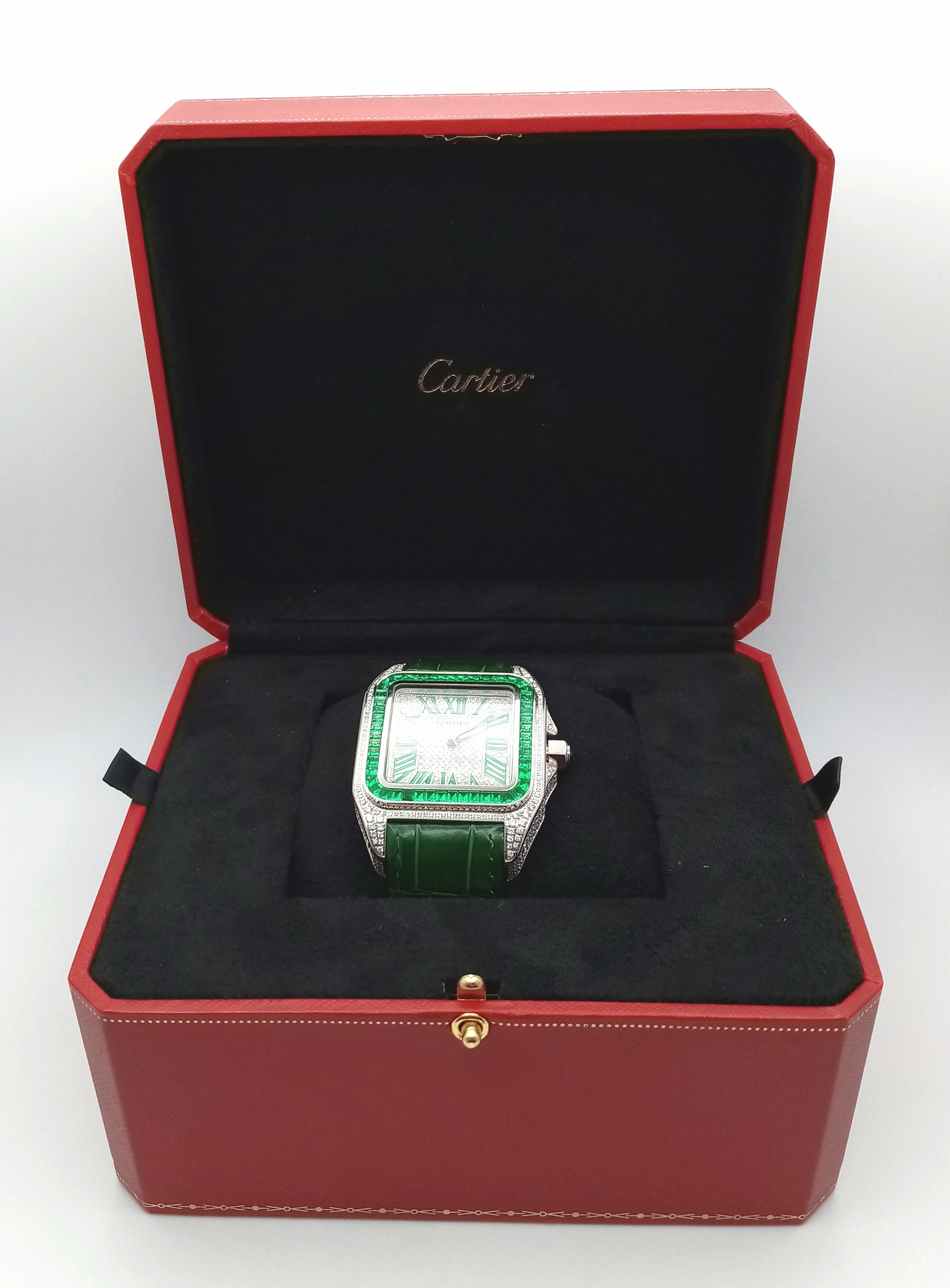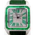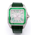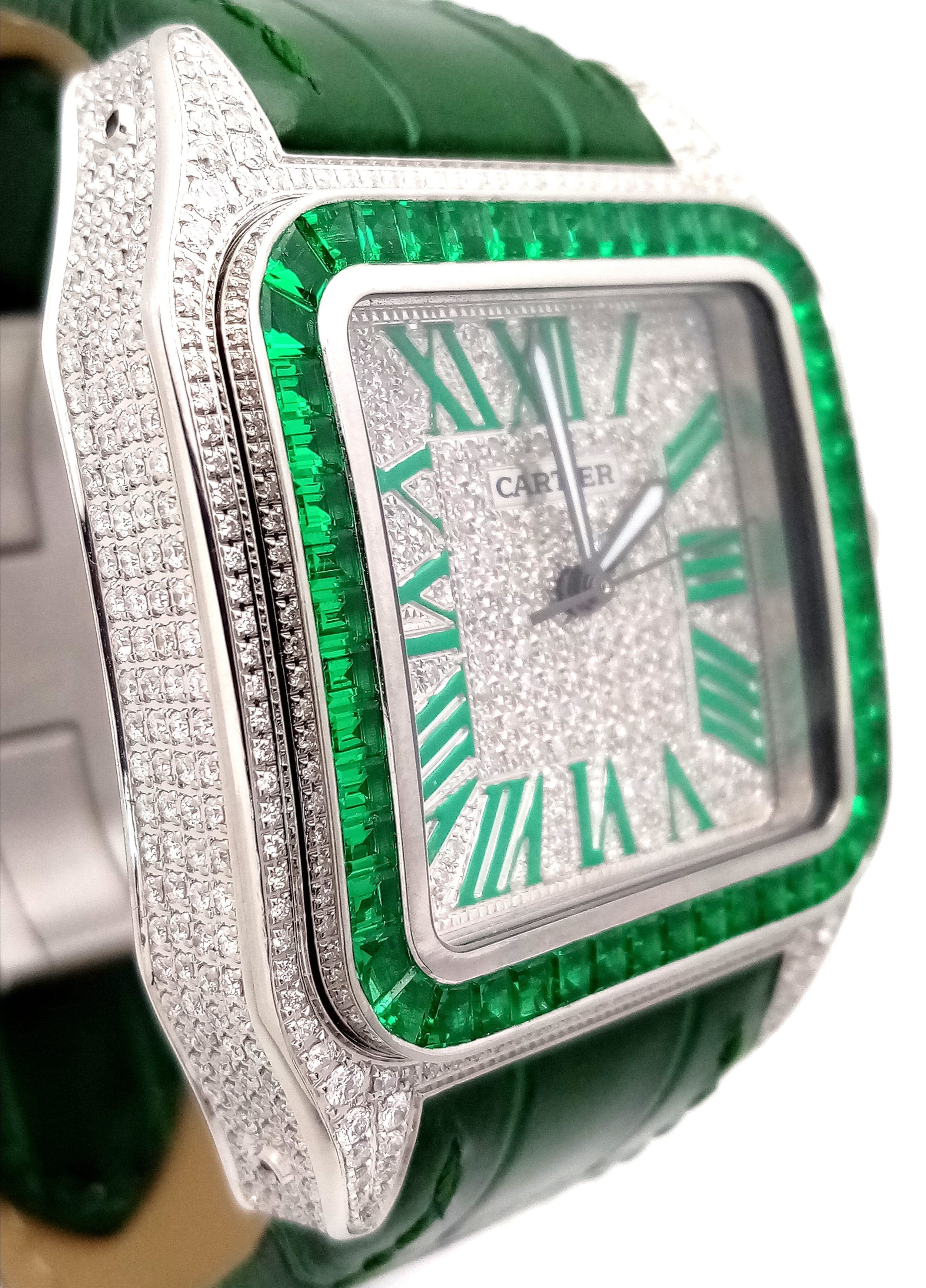 A Head-Turning Cartier Santos 100 Diamond and Emerald 'Hulk' Automatic Gents Watch. Green leather strap with diamond set bezel. Stainless steel case - 40mm. Diamond encrusted dial with green Roman numeral markers. Emerald set inner bezel with a diamond set outer that extends to the case sides and lugs. Note: This watch has been professionally custom fitted with diamonds and emeralds. In good condition and working order. Comes with a Cartier case.