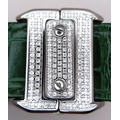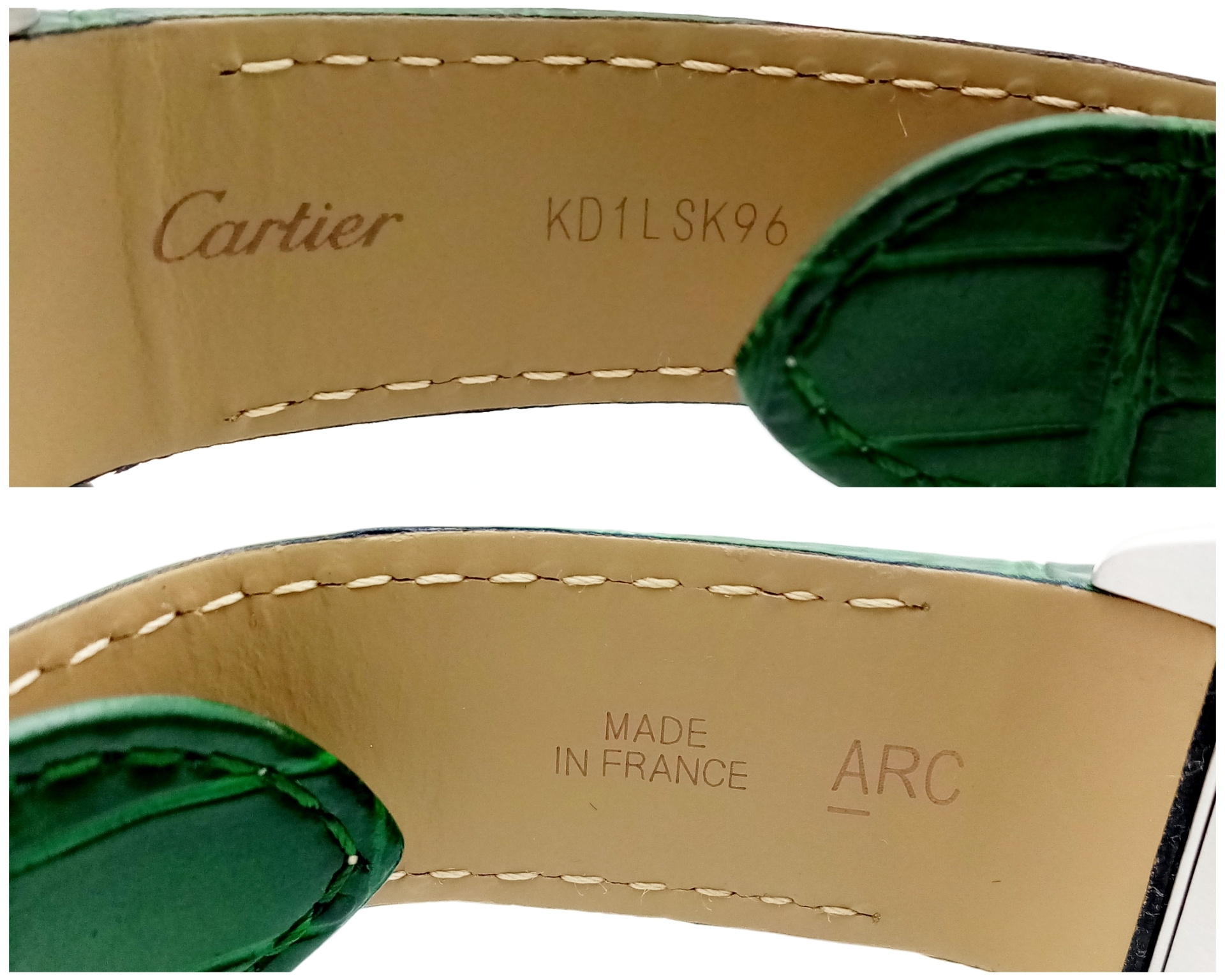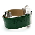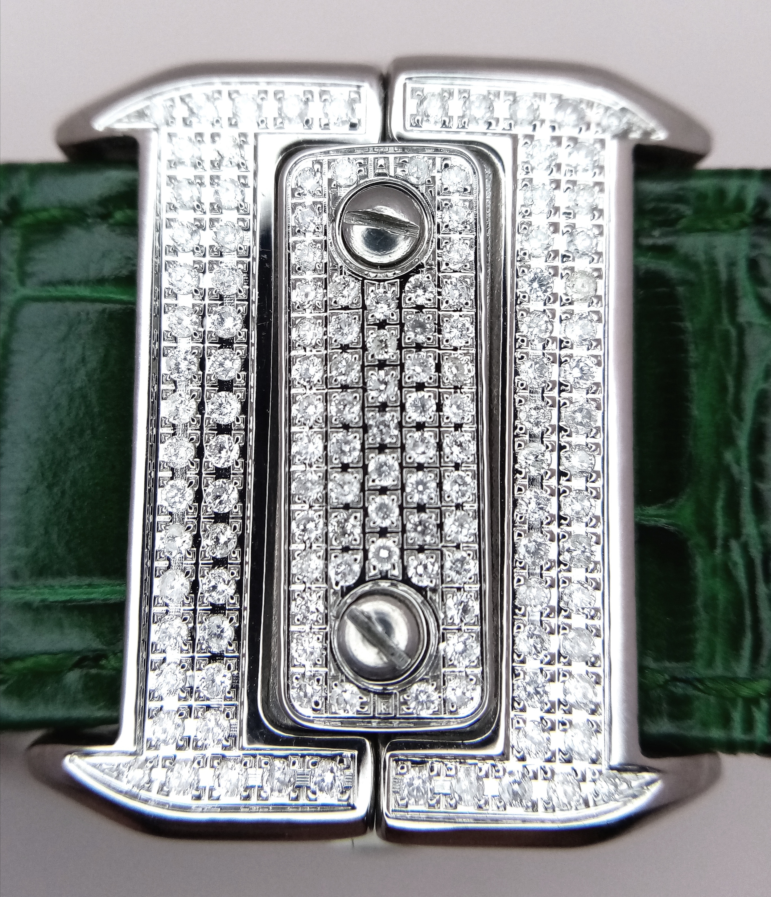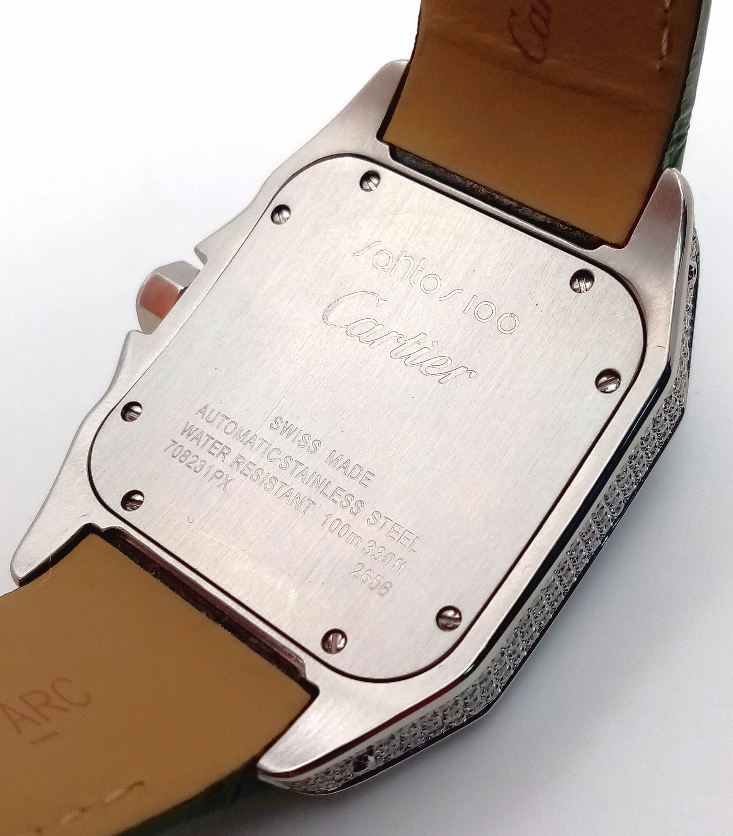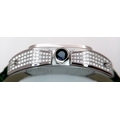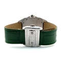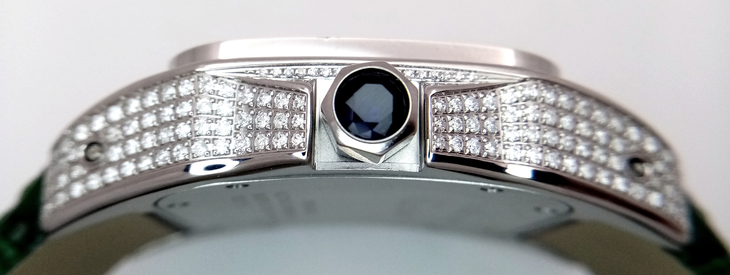 A Head-Turning Cartier Santos 100 Diamond and Emerald 'Hulk' Automatic Gents Watch. Green leather strap with diamond set bezel. Stainless steel case - 40mm. Diamond encrusted dial with green Roman numeral markers. Emerald set inner bezel with a diamond set outer that extends to the case sides and lugs. Note: This watch has been professionally custom fitted with diamonds and emeralds. In good condition and working order. Comes with a Cartier case.