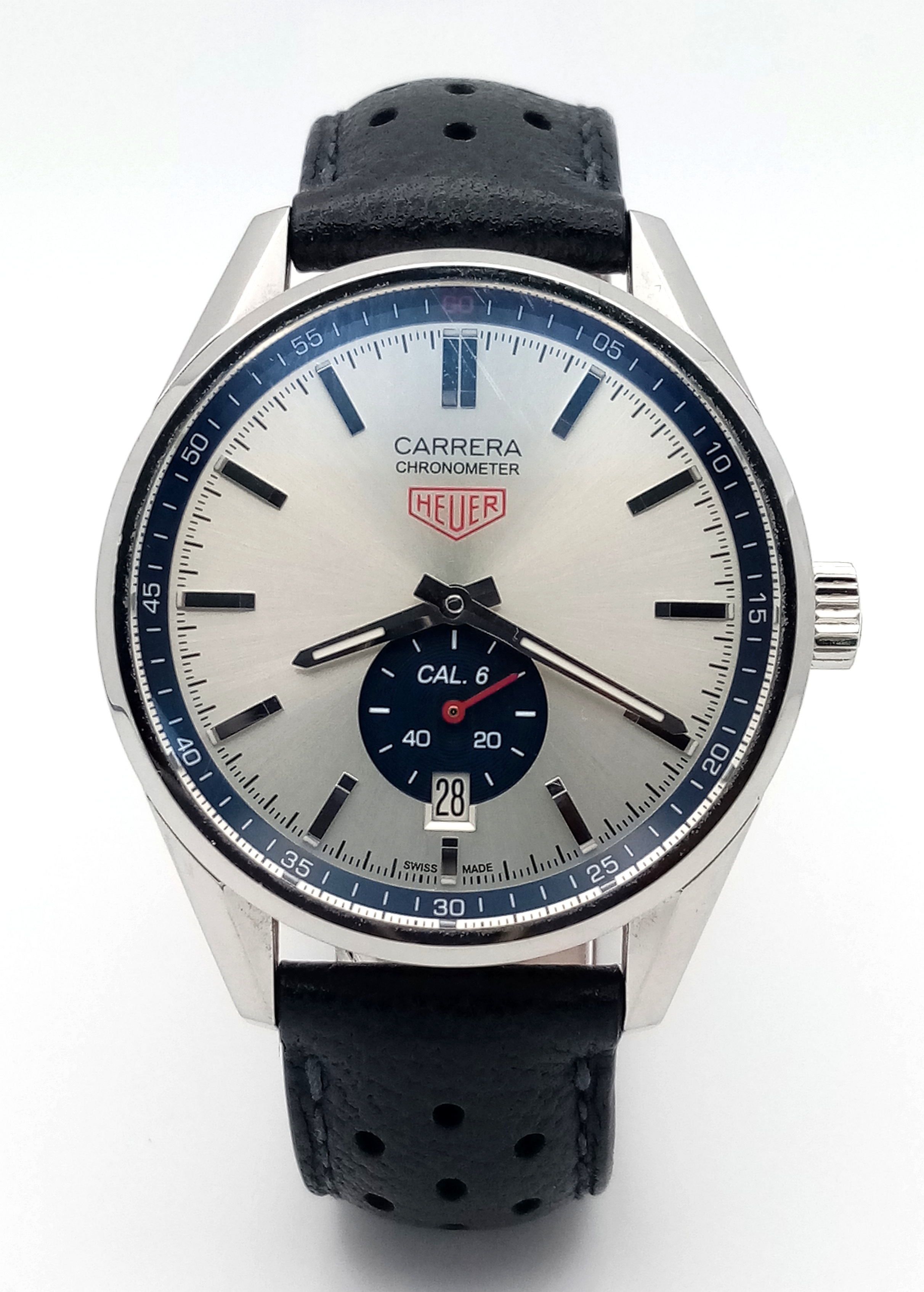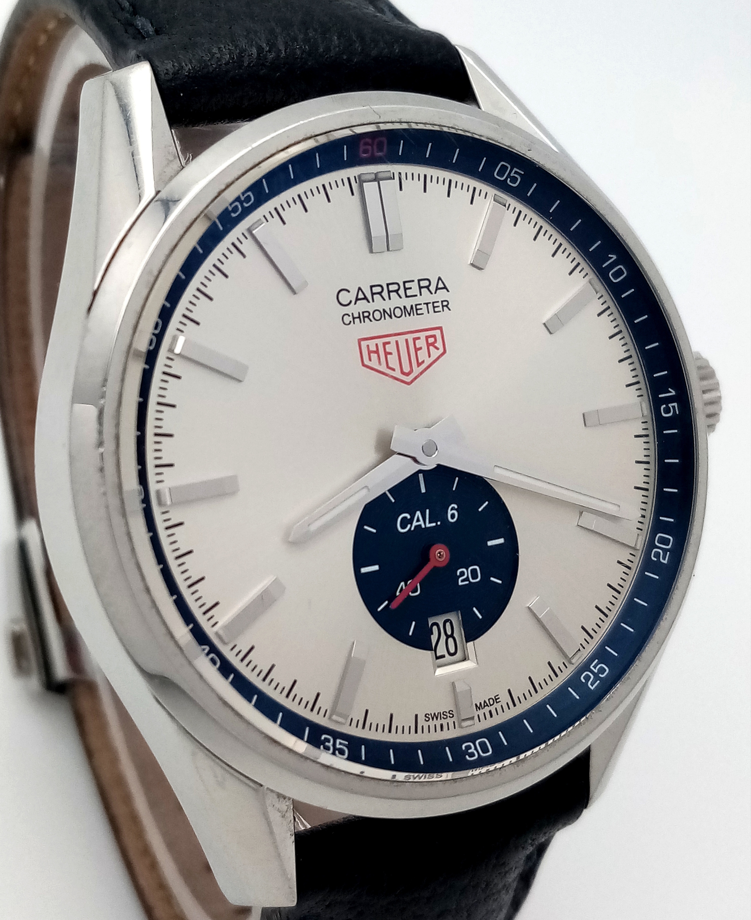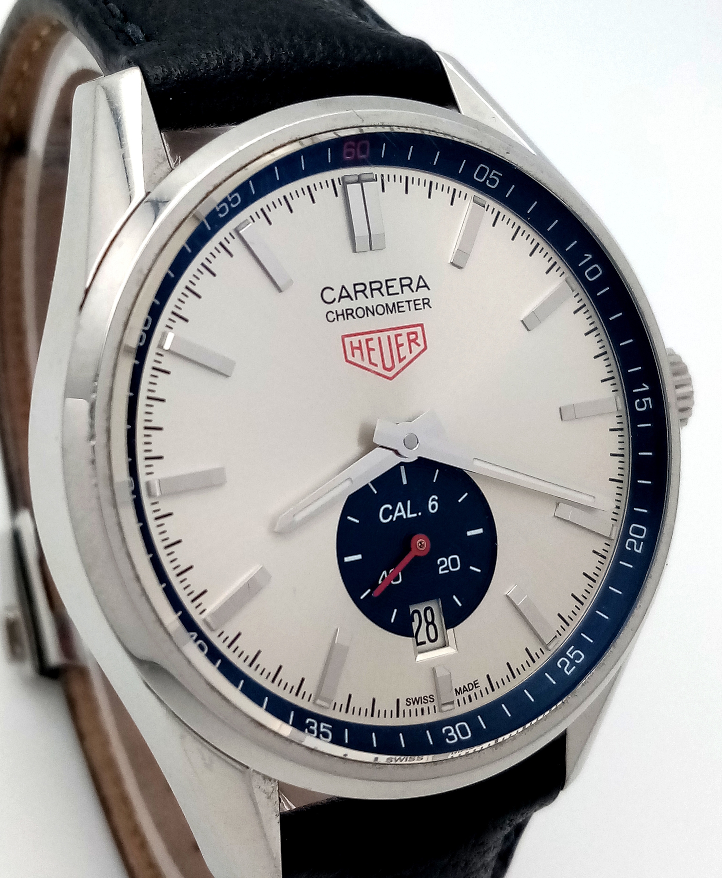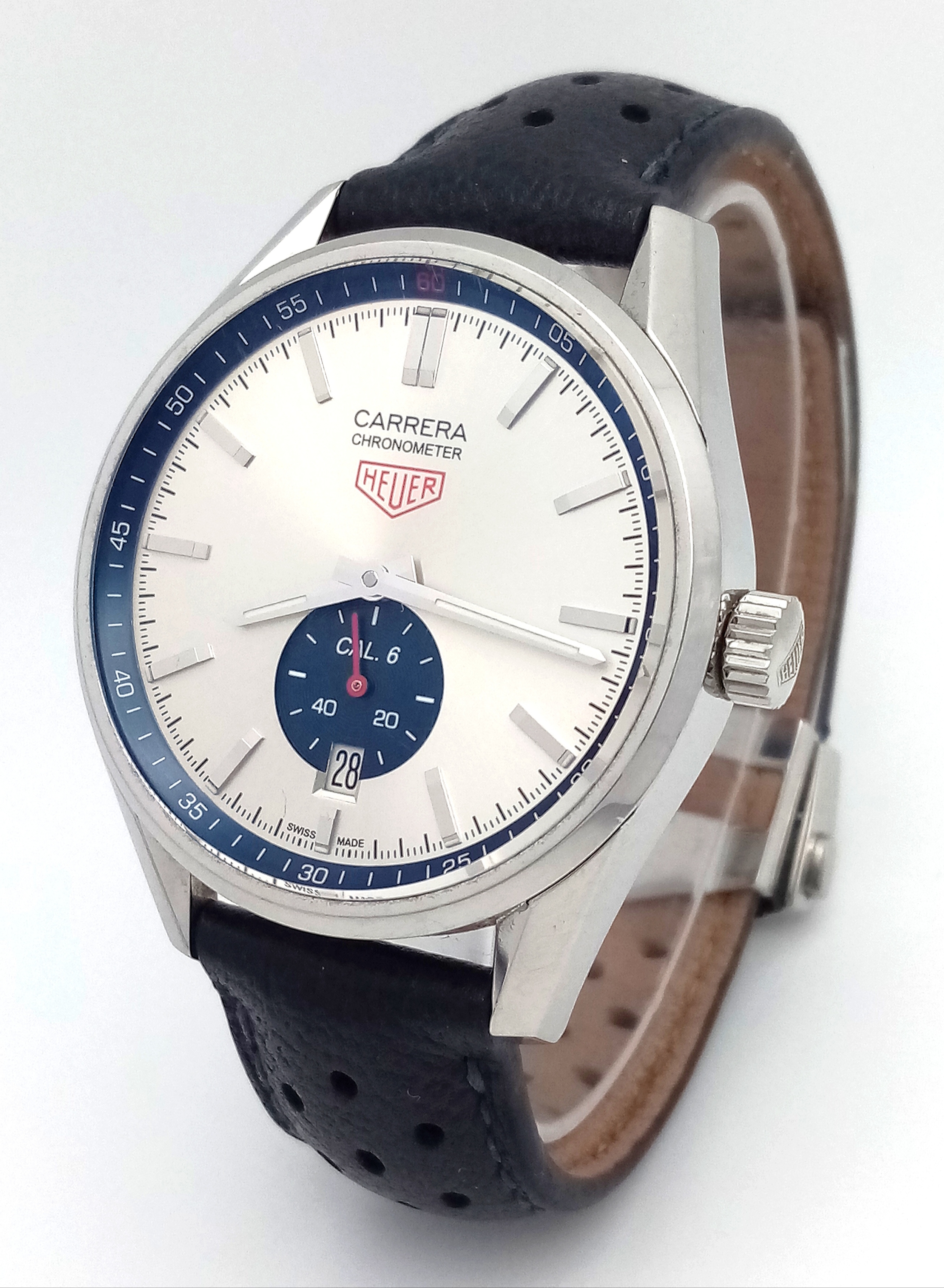 A Tag Heuer Carrera Calibre 6 Automatic Gents Watch. Black leather strap. Stainless steel case - 39mm. Model WV5111. Silver tone dial with blue sub dial. In working order. Comes with a WCSA report. R26774.