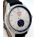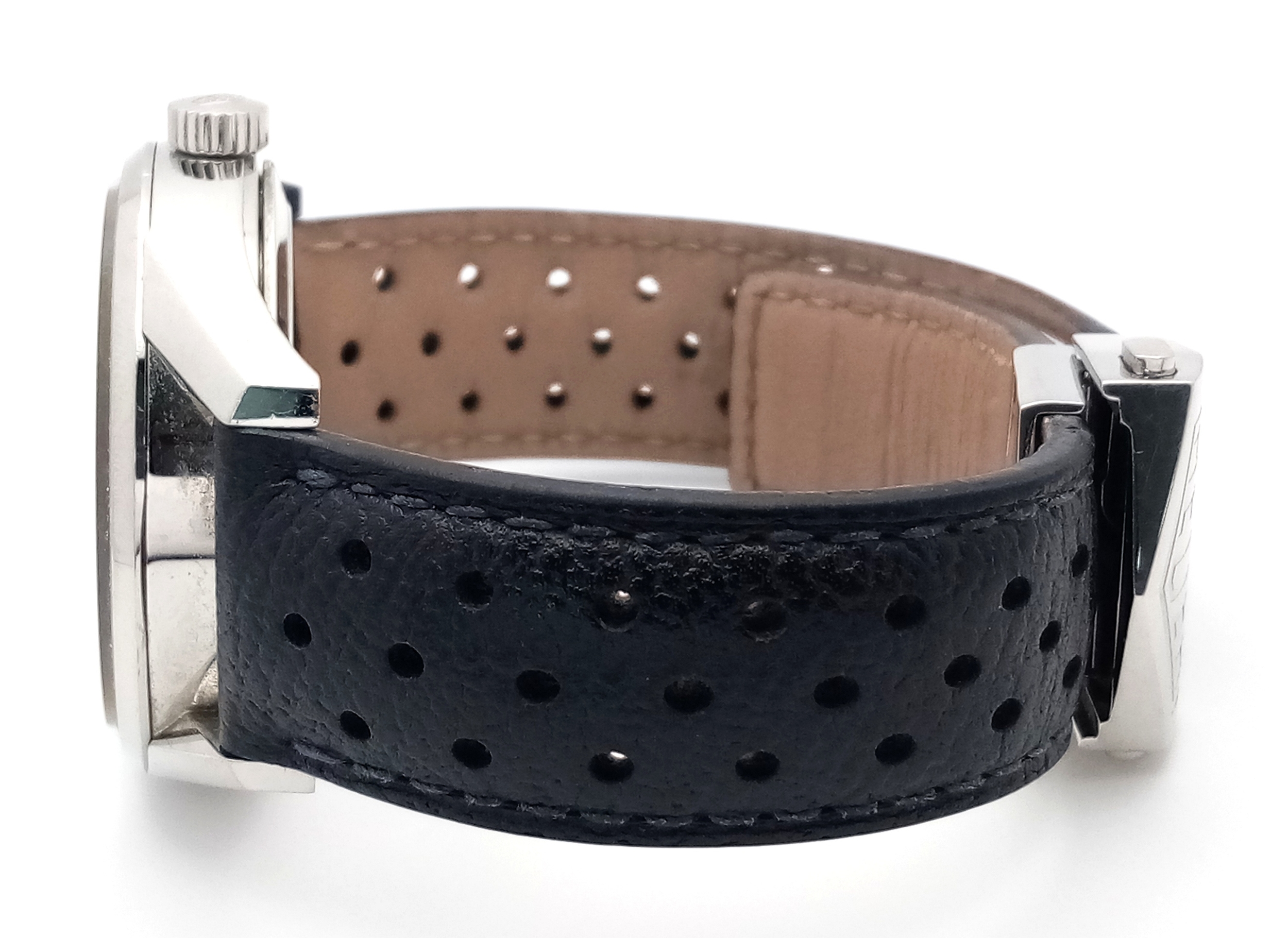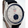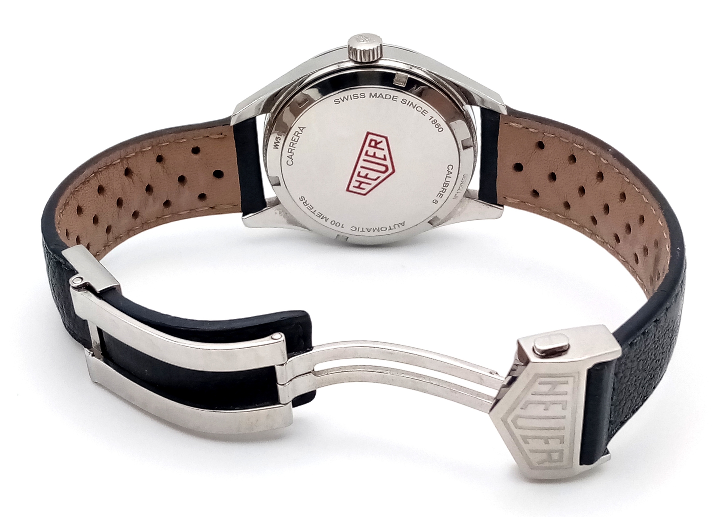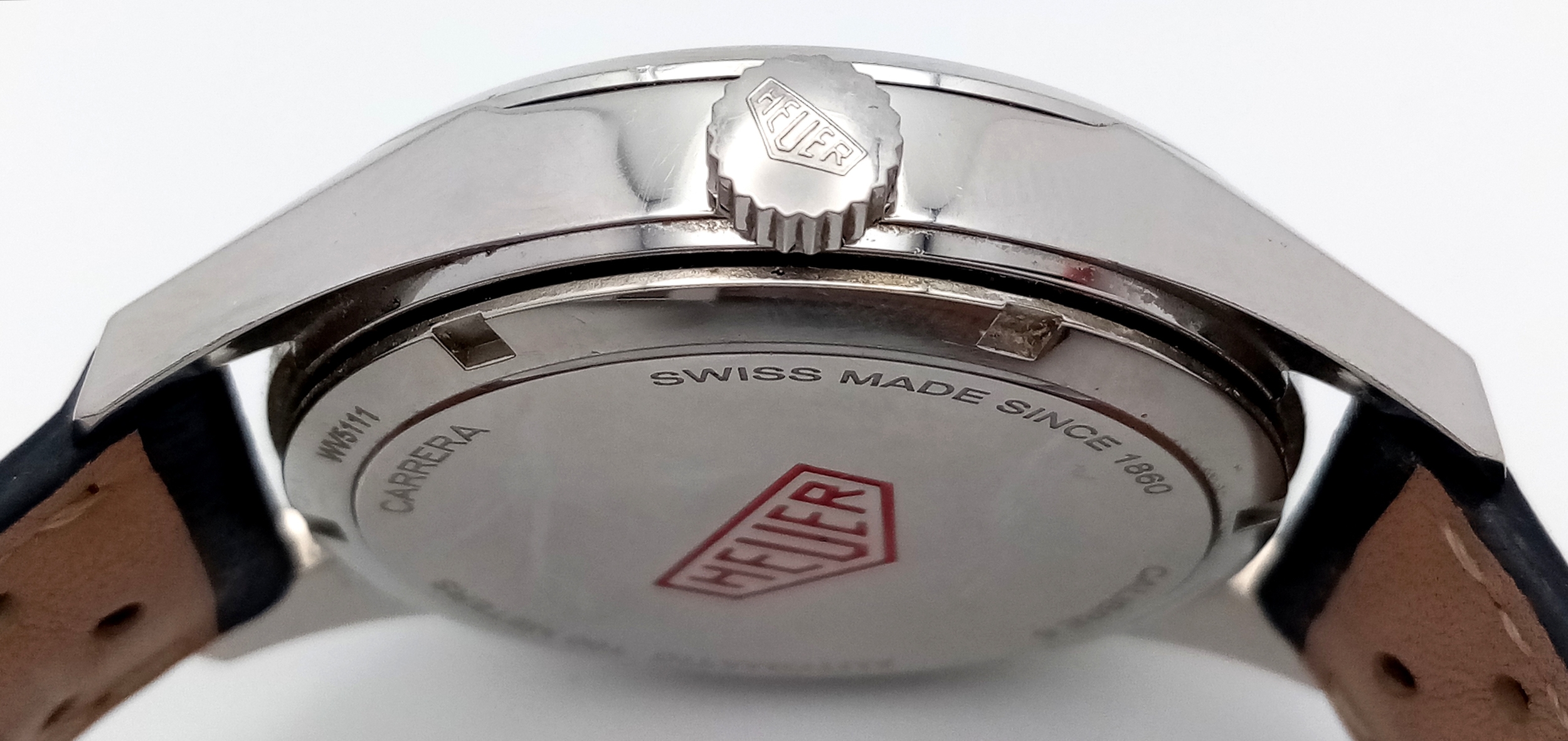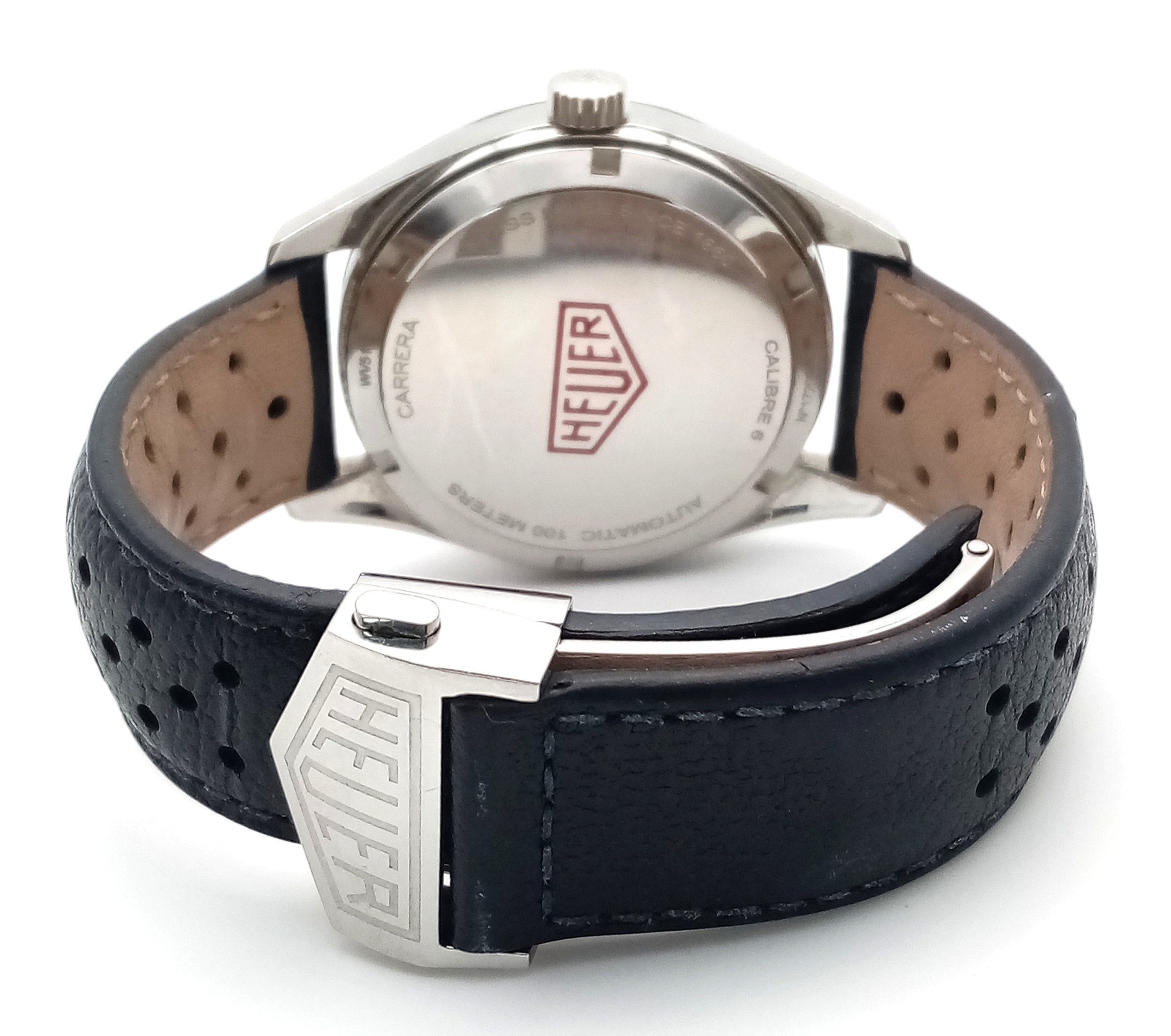 A Tag Heuer Carrera Calibre 6 Automatic Gents Watch. Black leather strap. Stainless steel case - 39mm. Model WV5111. Silver tone dial with blue sub dial. In working order. Comes with a WCSA report. R26774.
