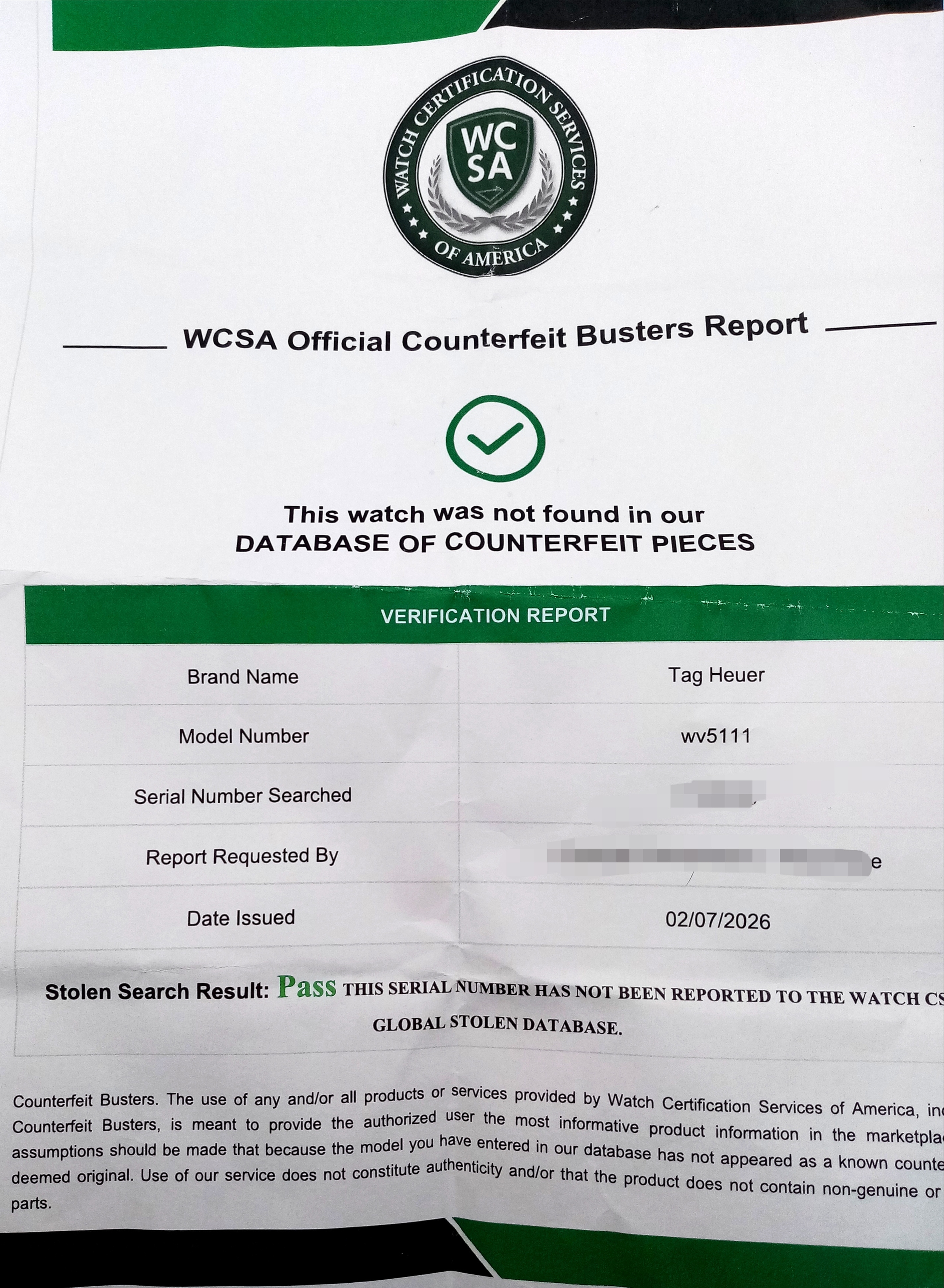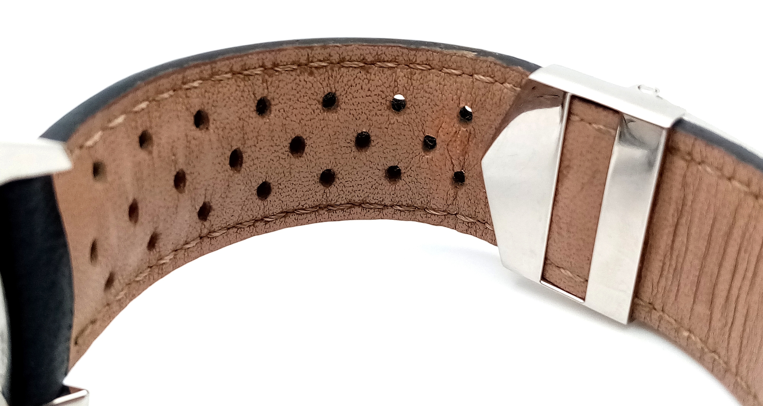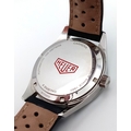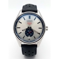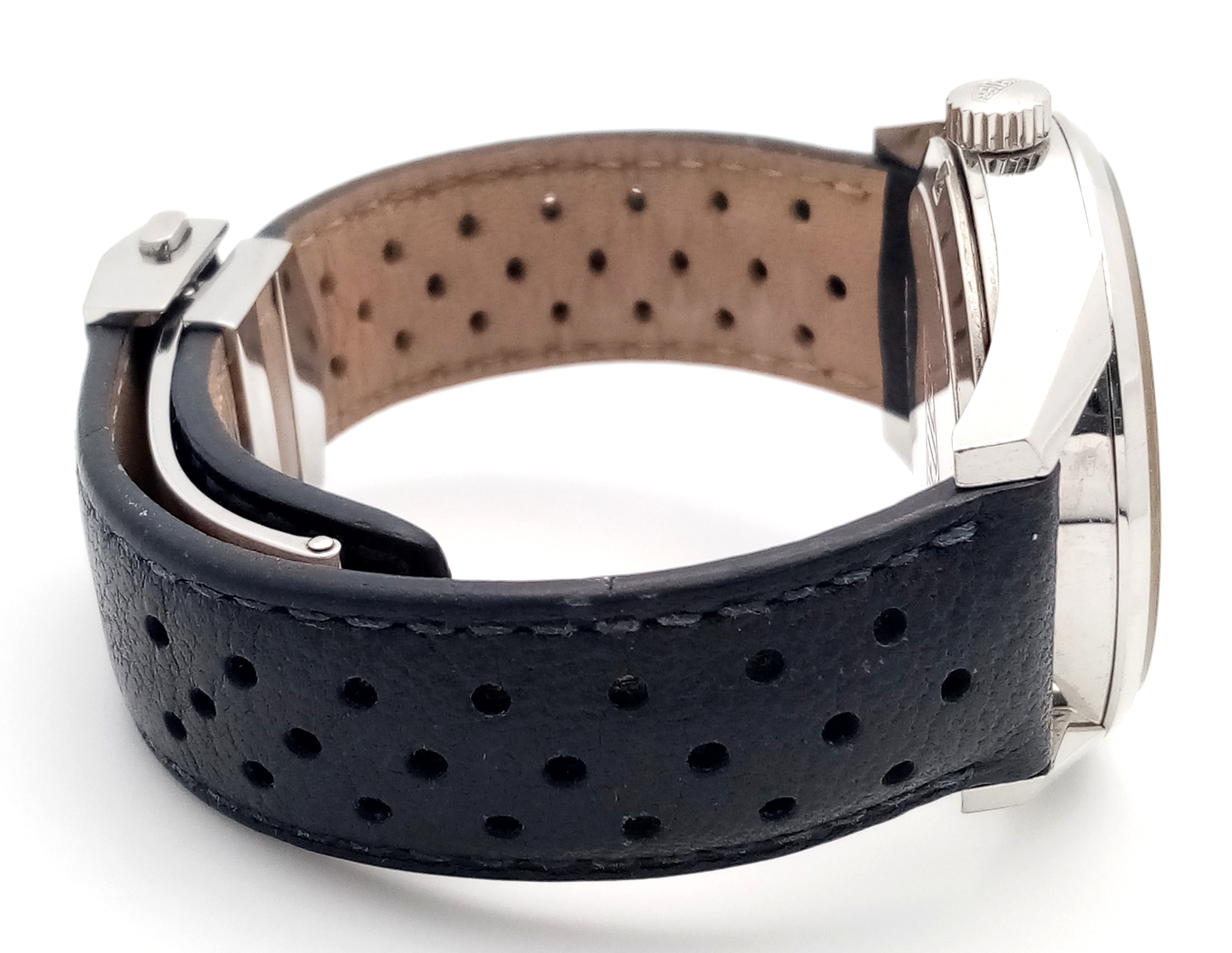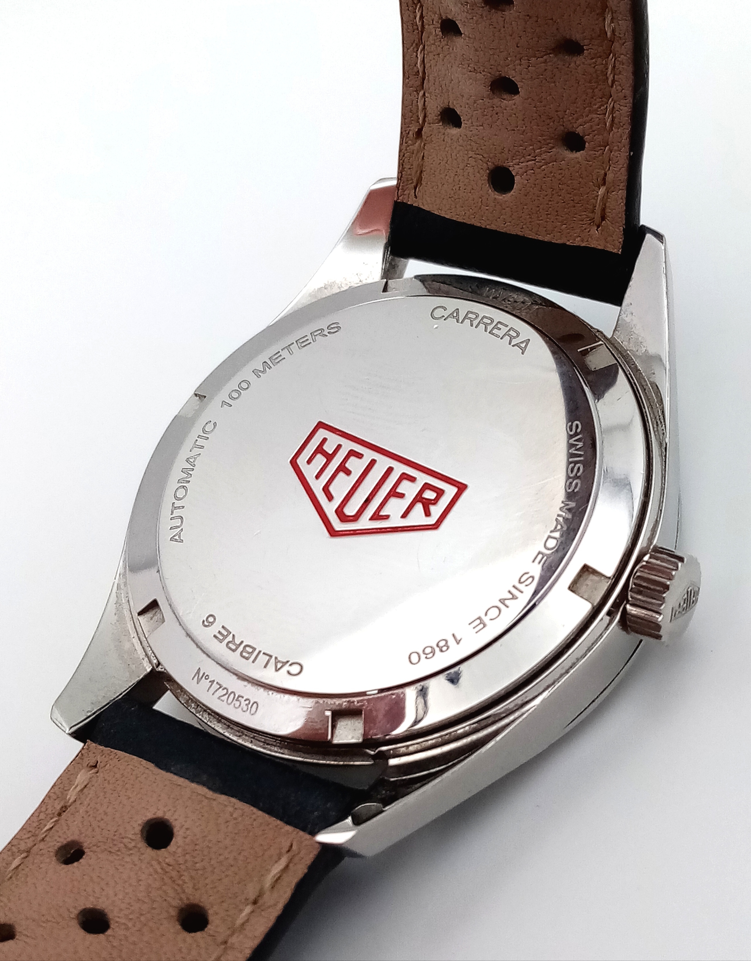 A Tag Heuer Carrera Calibre 6 Automatic Gents Watch. Black leather strap. Stainless steel case - 39mm. Model WV5111. Silver tone dial with blue sub dial. In working order. Comes with a WCSA report. R26774.