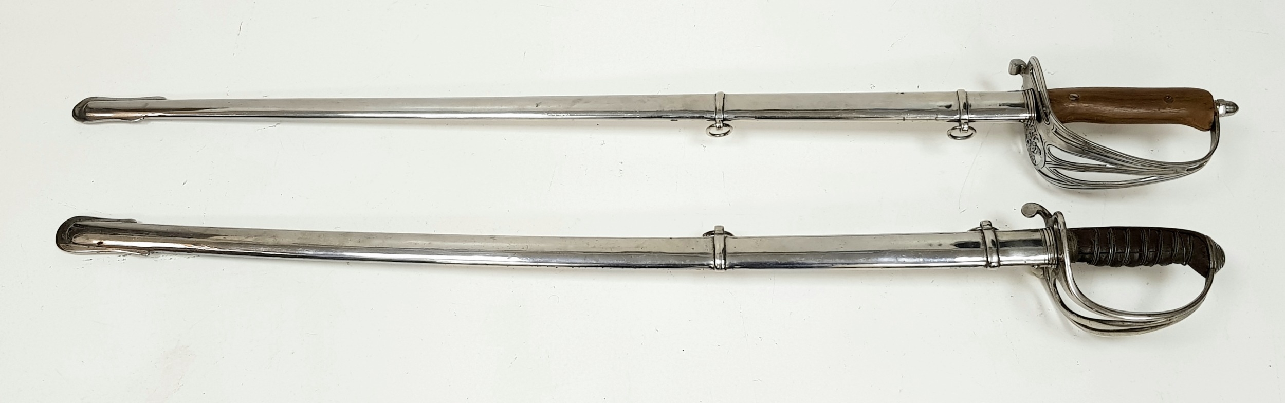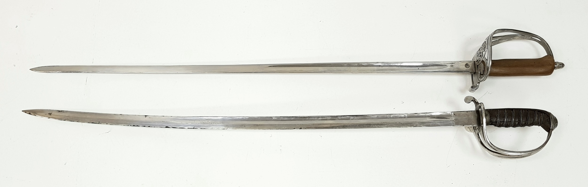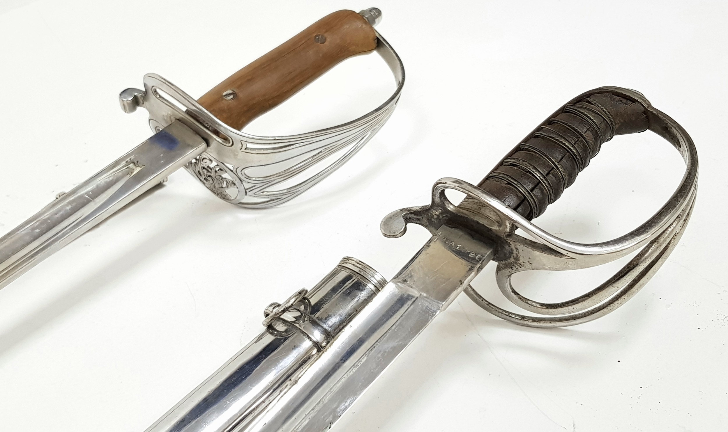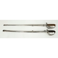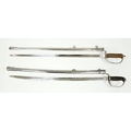 Two Vintage British Army Swords with Metal Scabbards. Broad arrow (India) mark on shorter sword and stamped 'Mole' - 86cm total length. The other sword with crest on handguard is a reproduction - 103cm total length. UK mainland sales only.