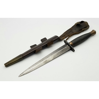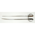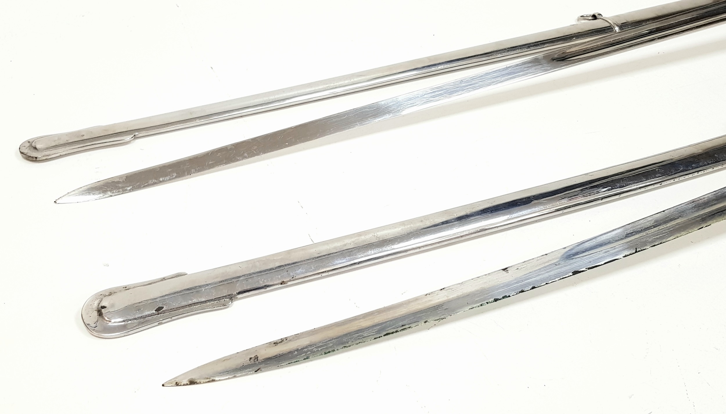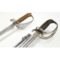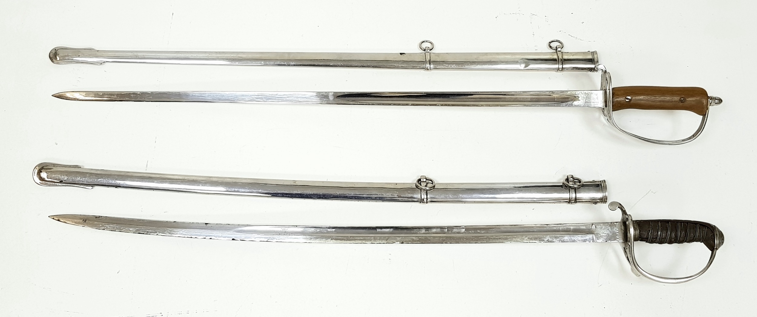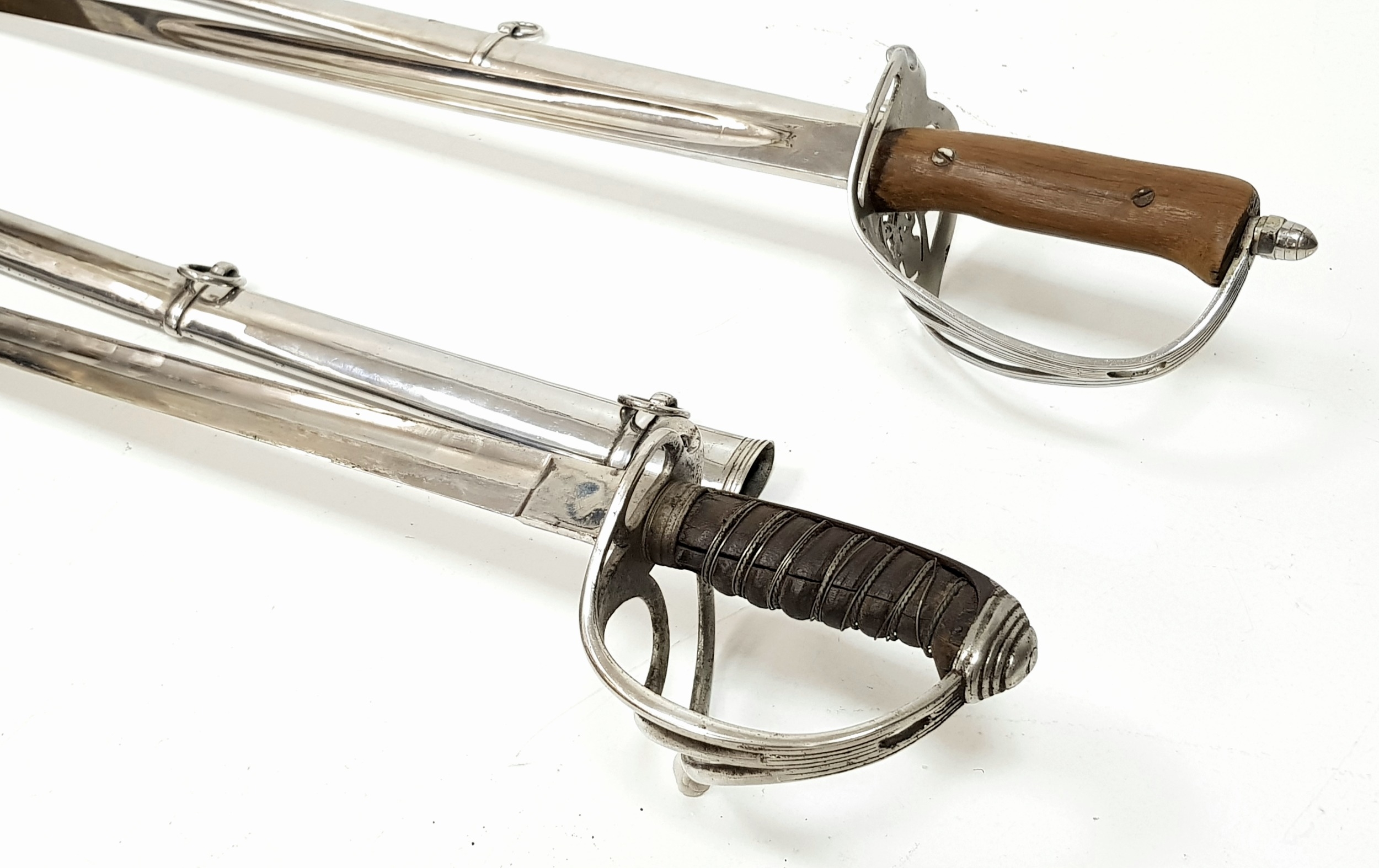 Two Vintage British Army Swords with Metal Scabbards. Broad arrow (India) mark on shorter sword and stamped 'Mole' - 86cm total length. The other sword with crest on handguard is a reproduction - 103cm total length. UK mainland sales only.
